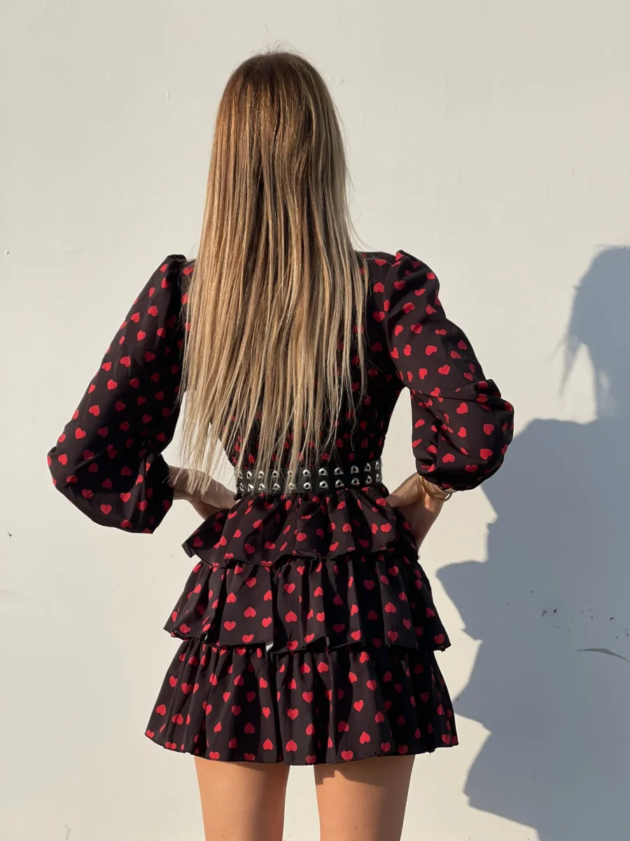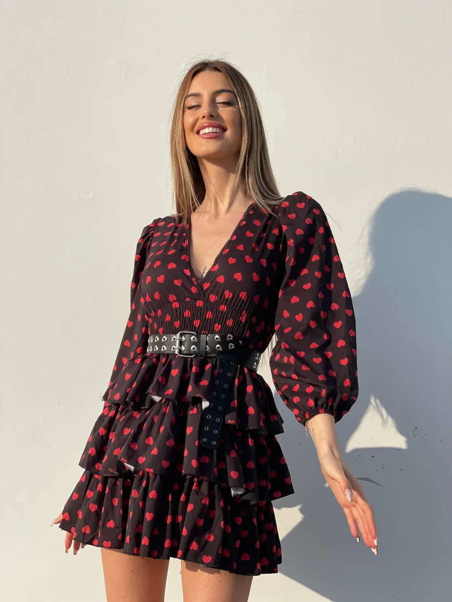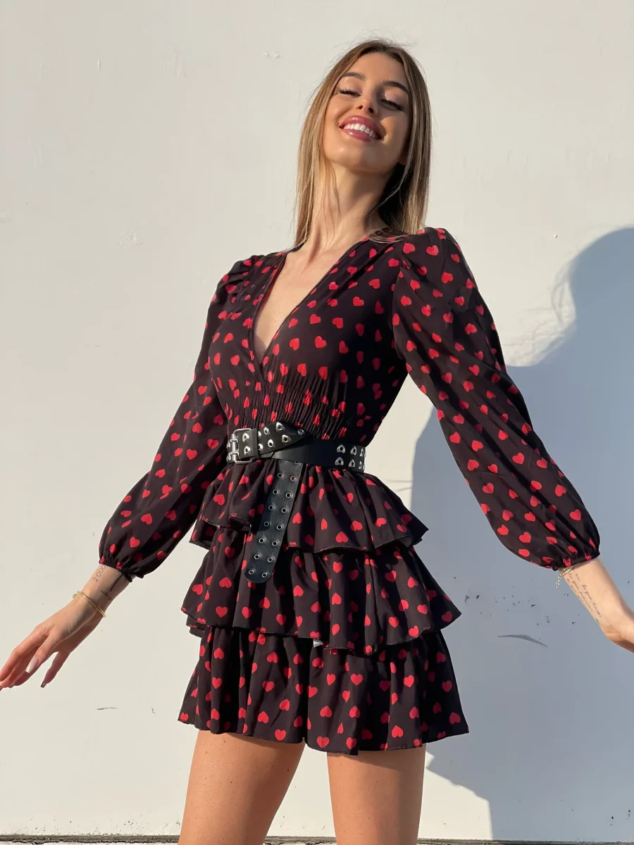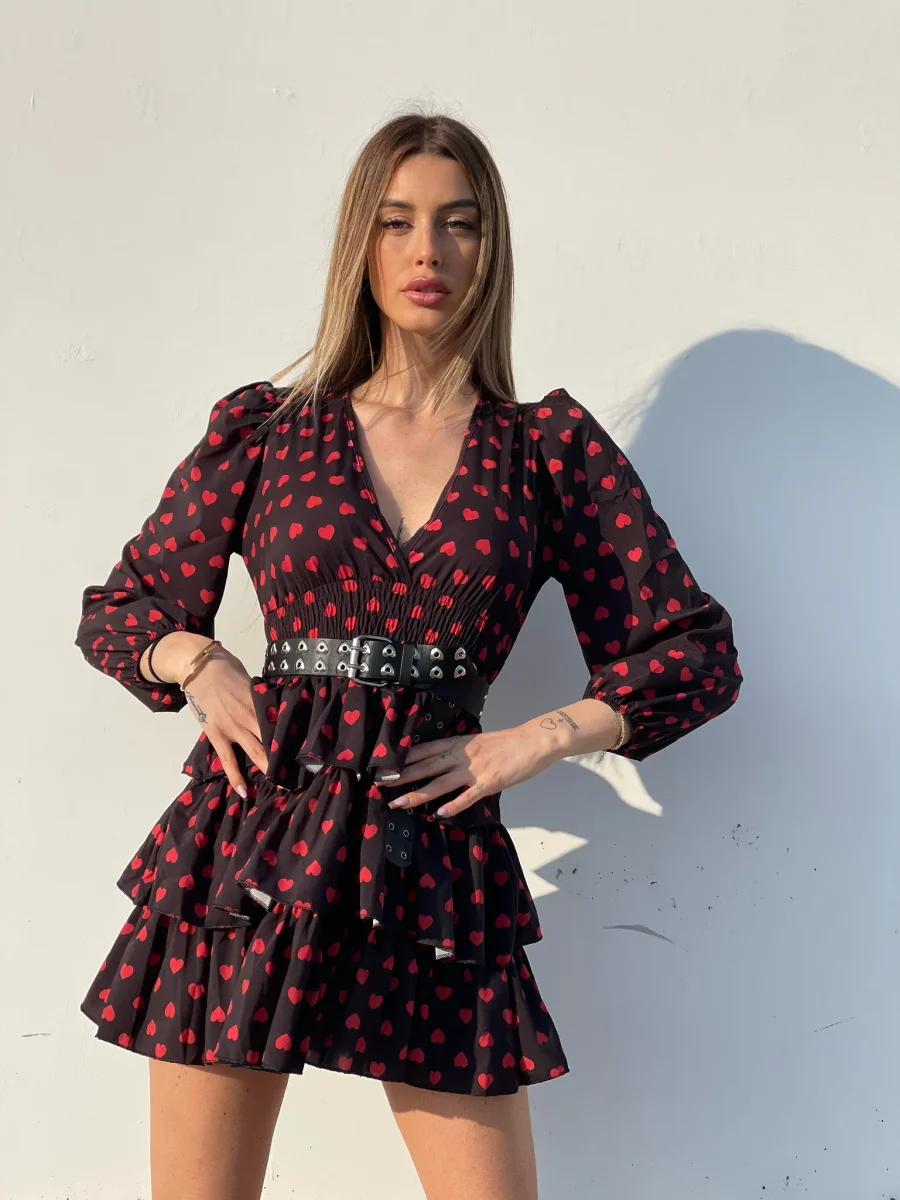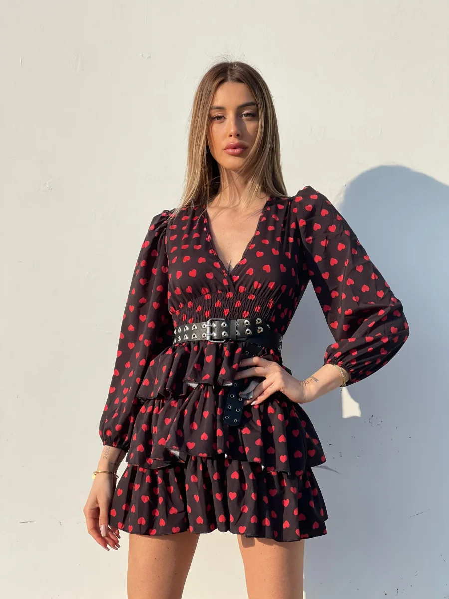 Meraviglioso abito in fantasia a cuori. Balze e arricciatura sulla vita molto elasticizzata, scollo a V e manica lunga con polsino.