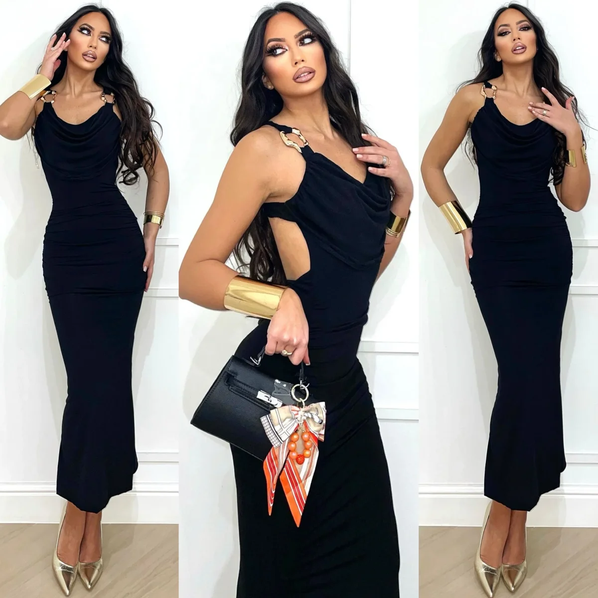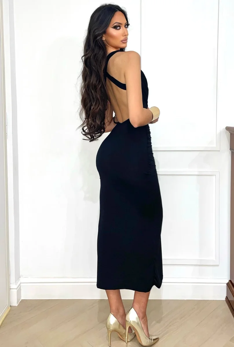Abito in lycra aderente e elasticizzato con fodera, coppe e spalline con gioiello. Schiena incrociata