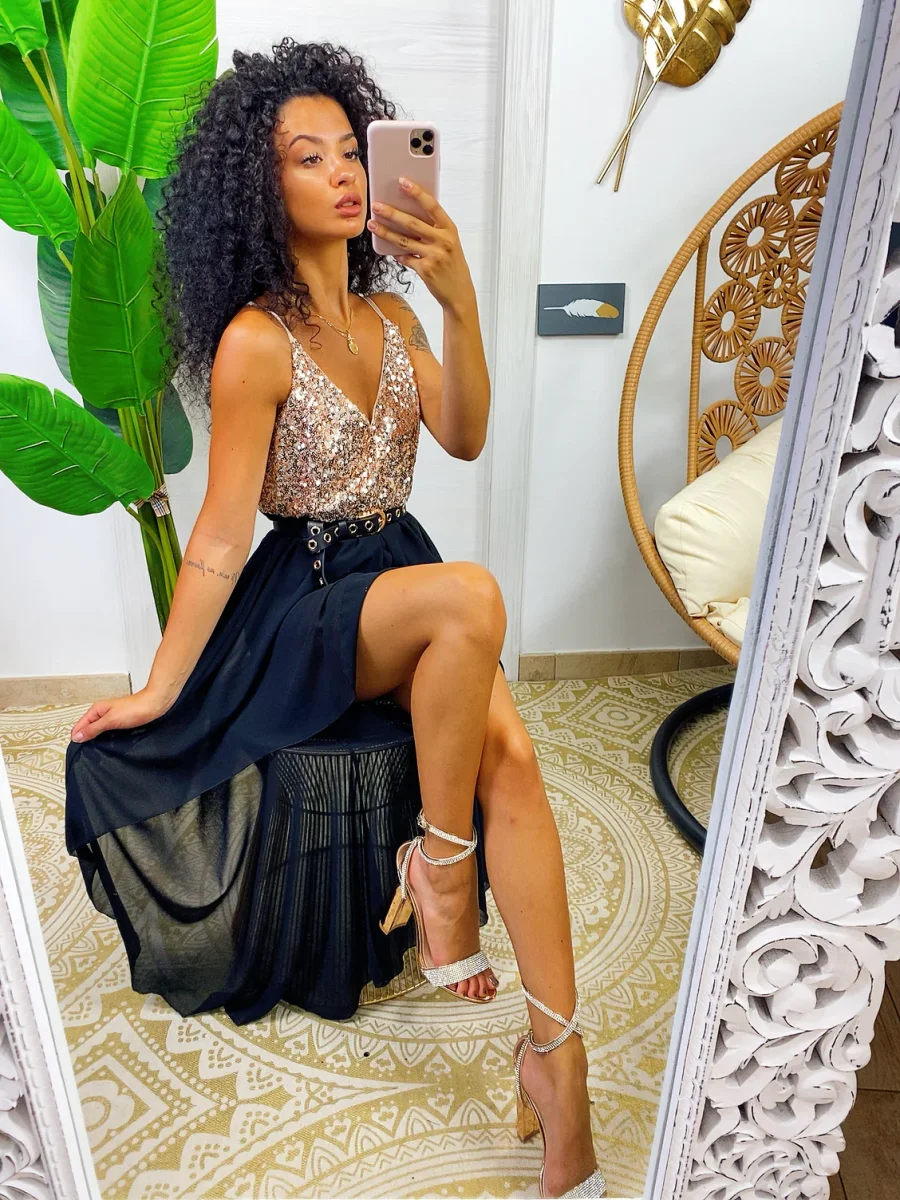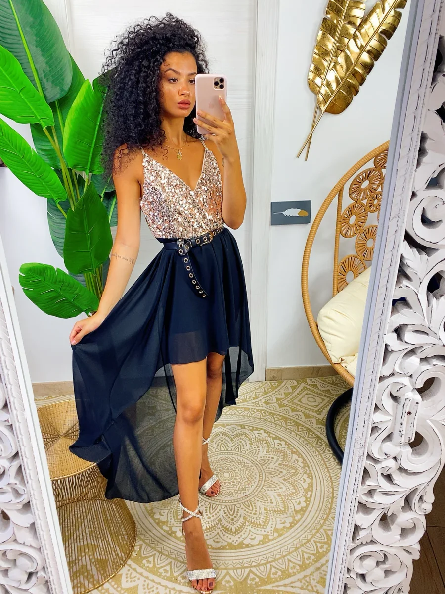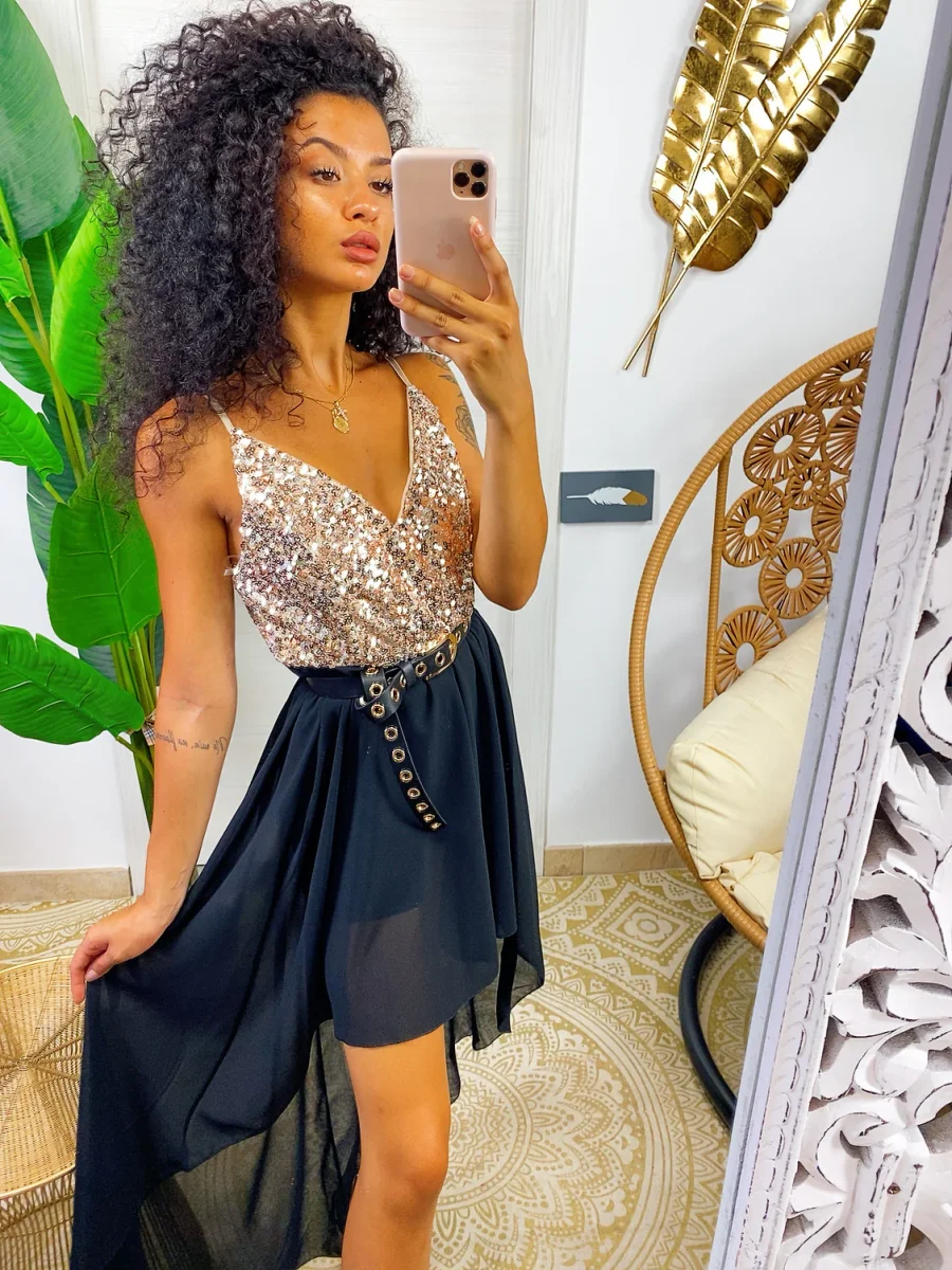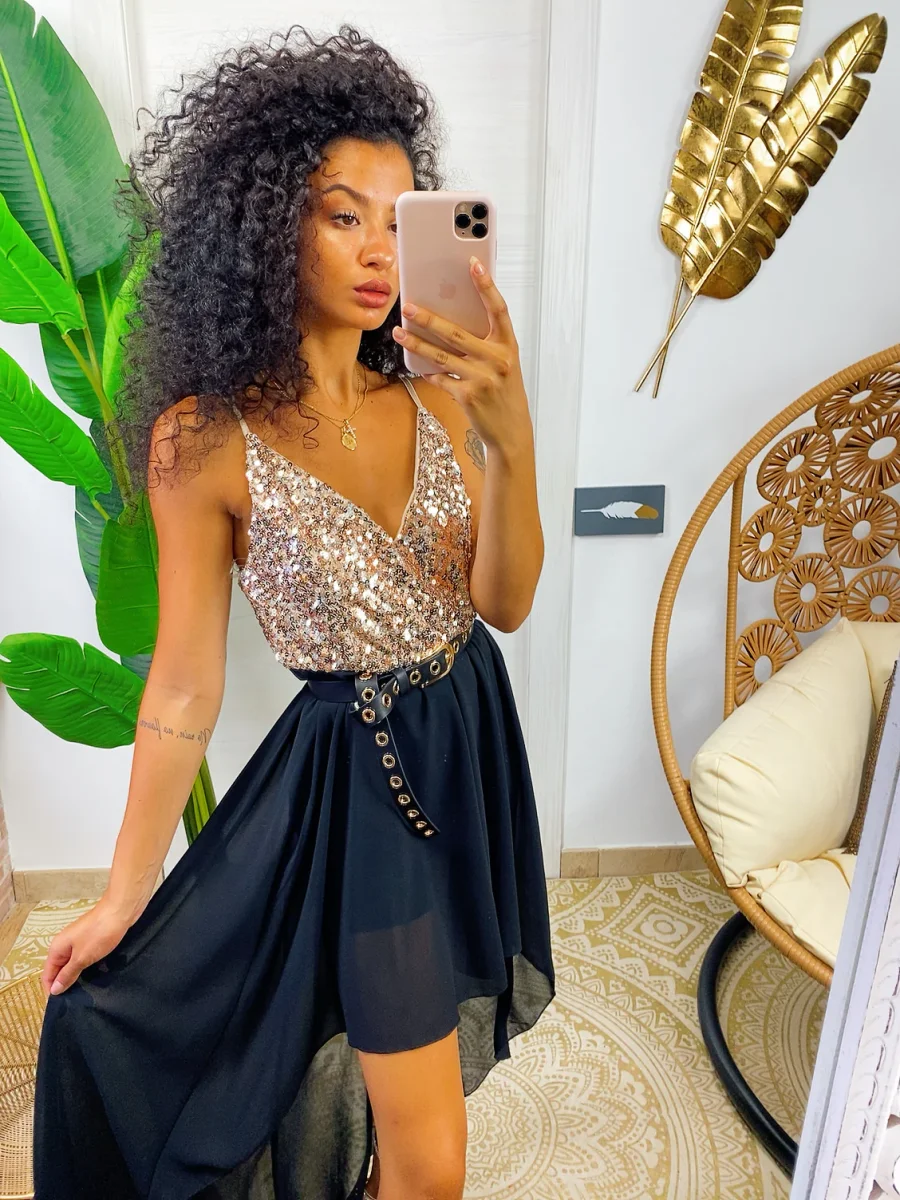 Abito asimmetrico con corpetto in paillettes con spalline regolabili. Gonna più corta davanti e lunga nel dietro monocolore.