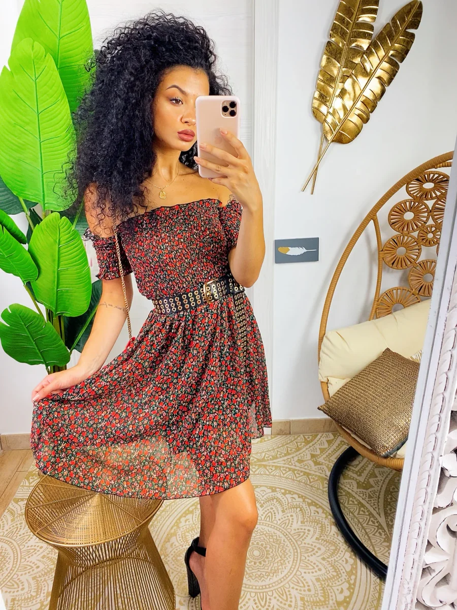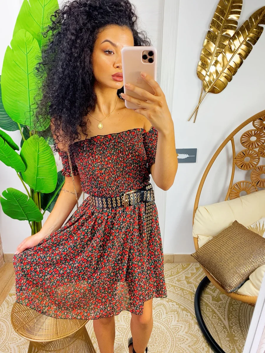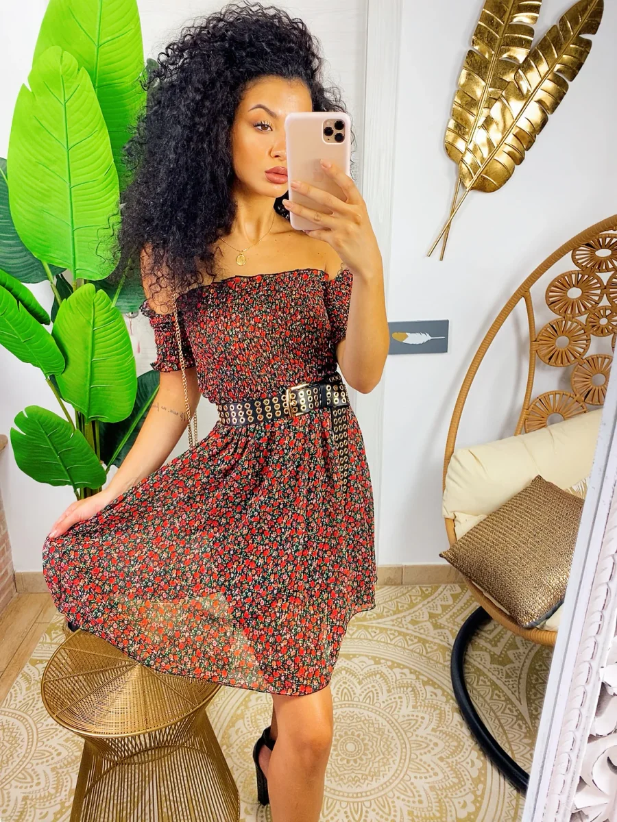 Abito nero con scollo a barchetta con fiori rossi piccoli