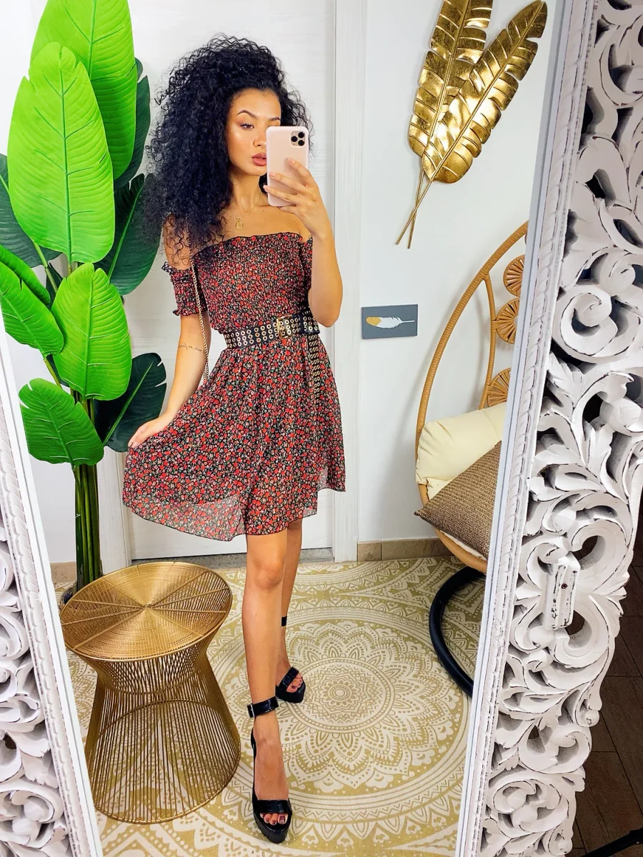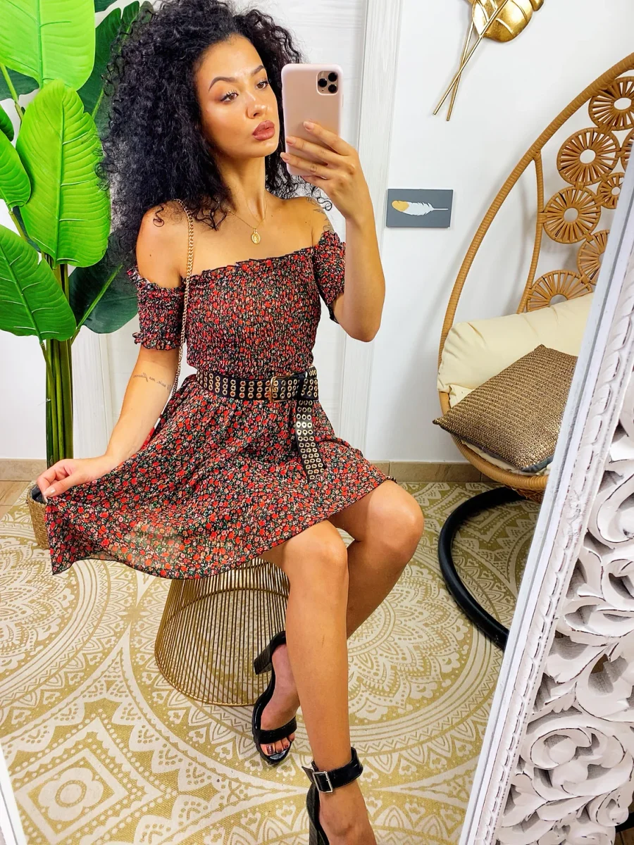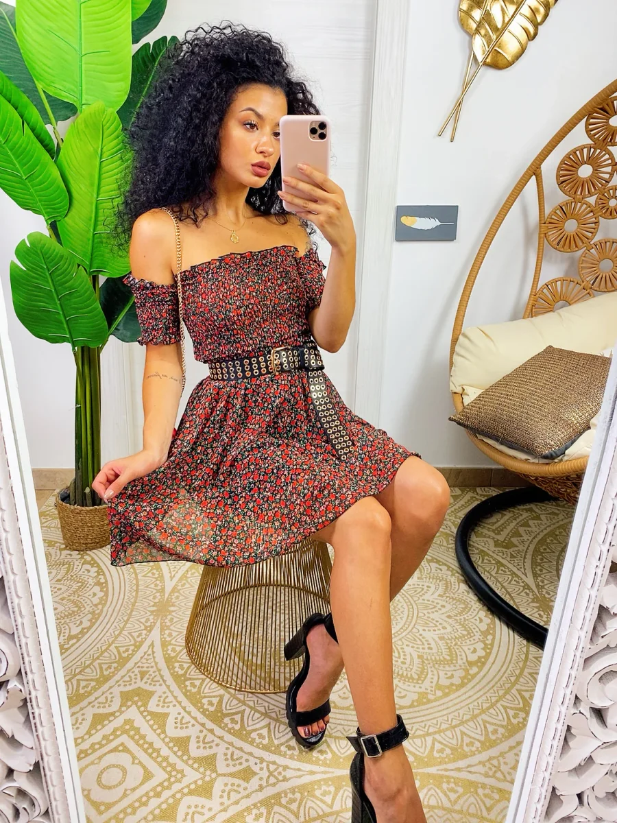 Abito nero con scollo a barchetta con fiori rossi piccoli
