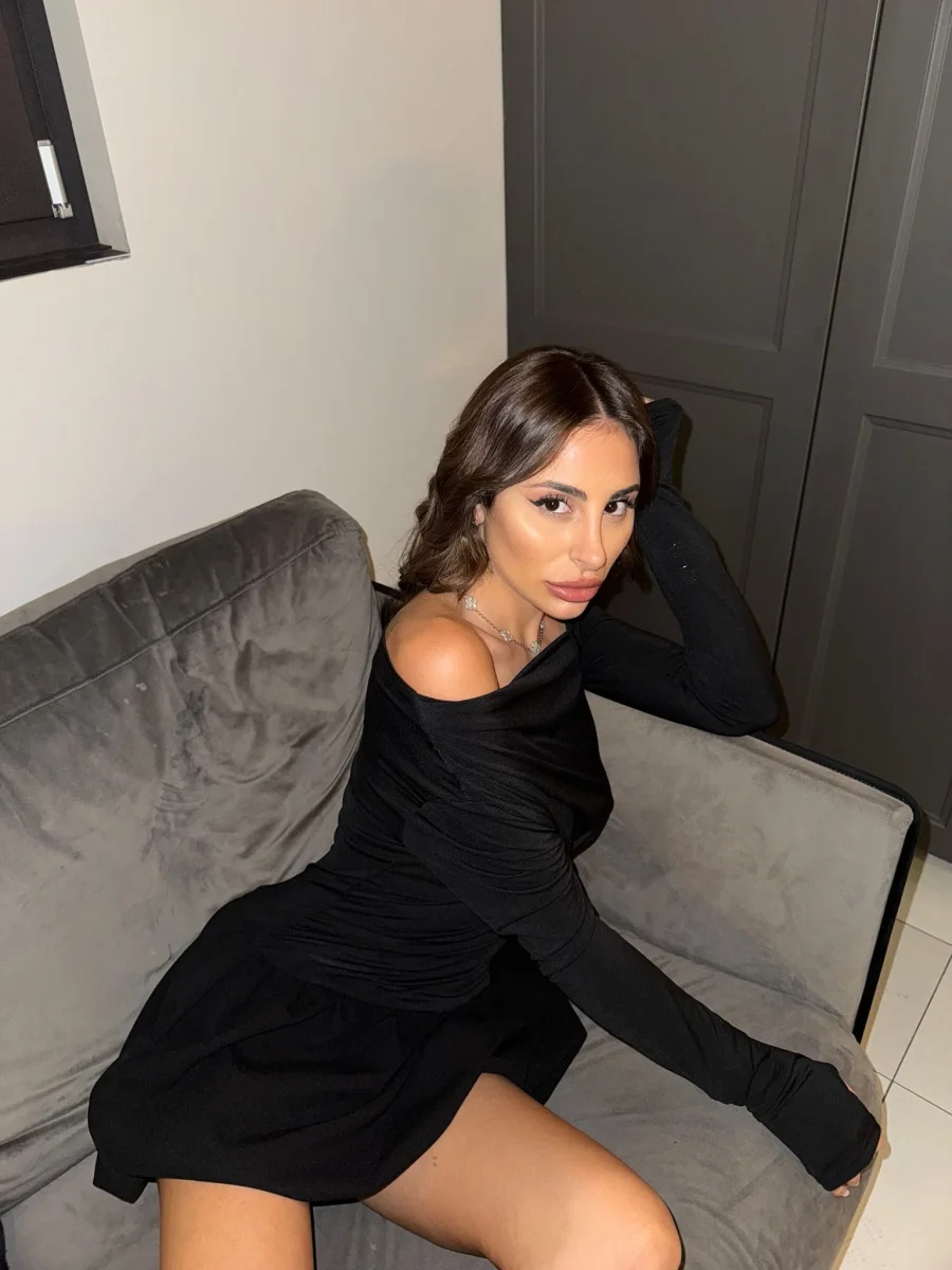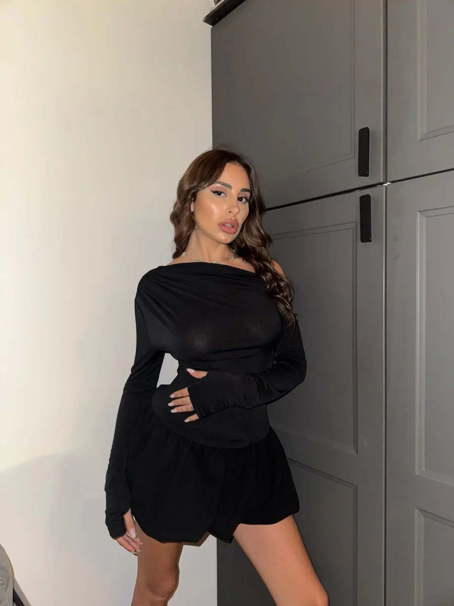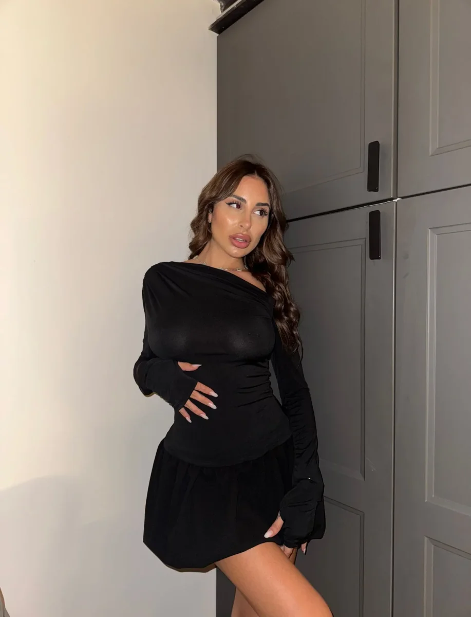 Abito nero con scollo senza coppe e gonna a palloncino, modello aderente ma elasticizzato