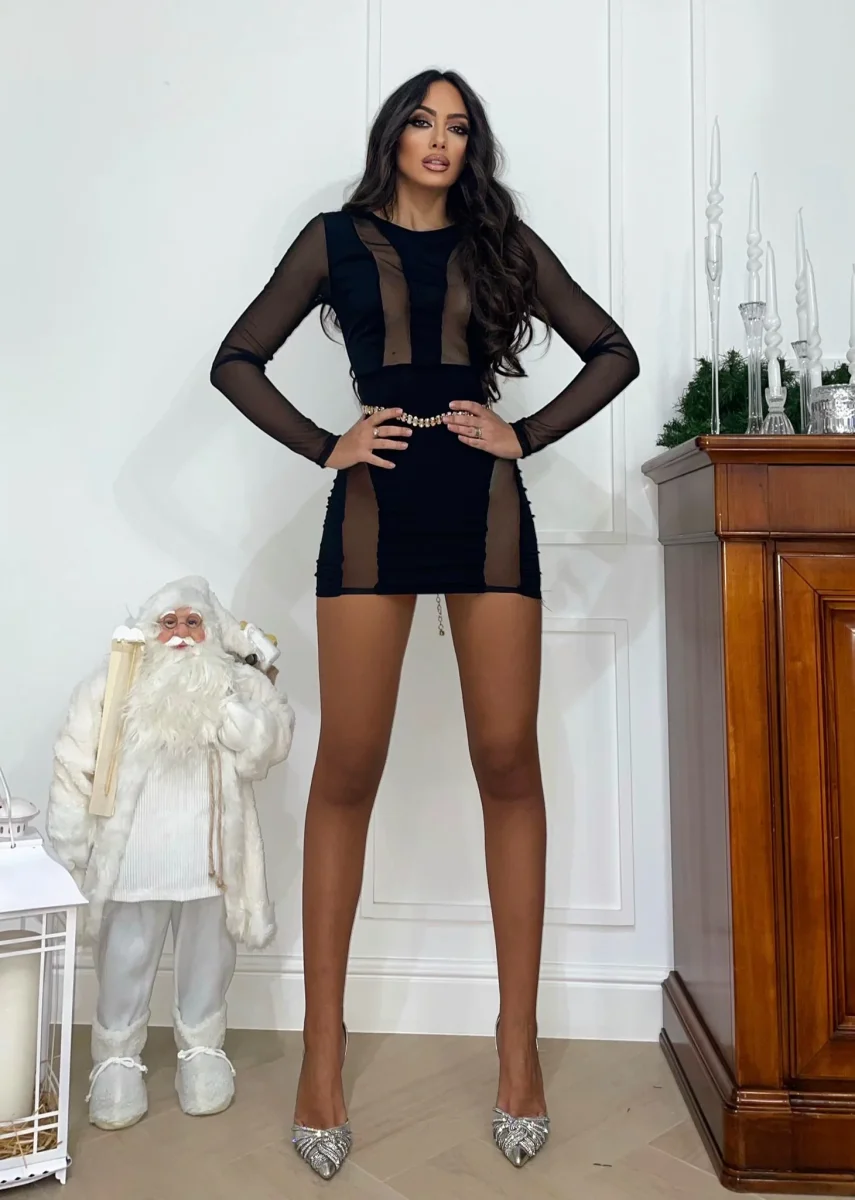 Tubino aderente nero con trasparenze in dettaglio