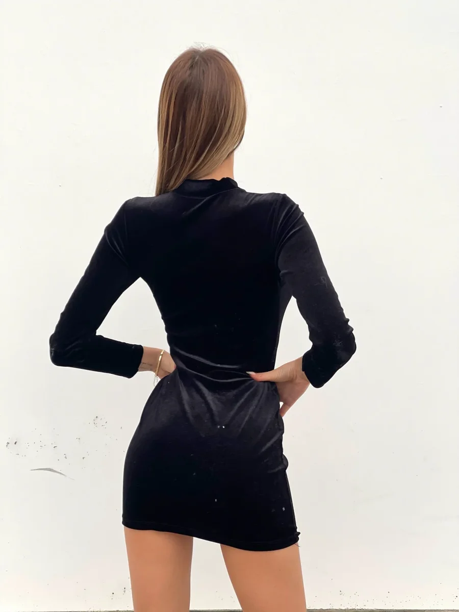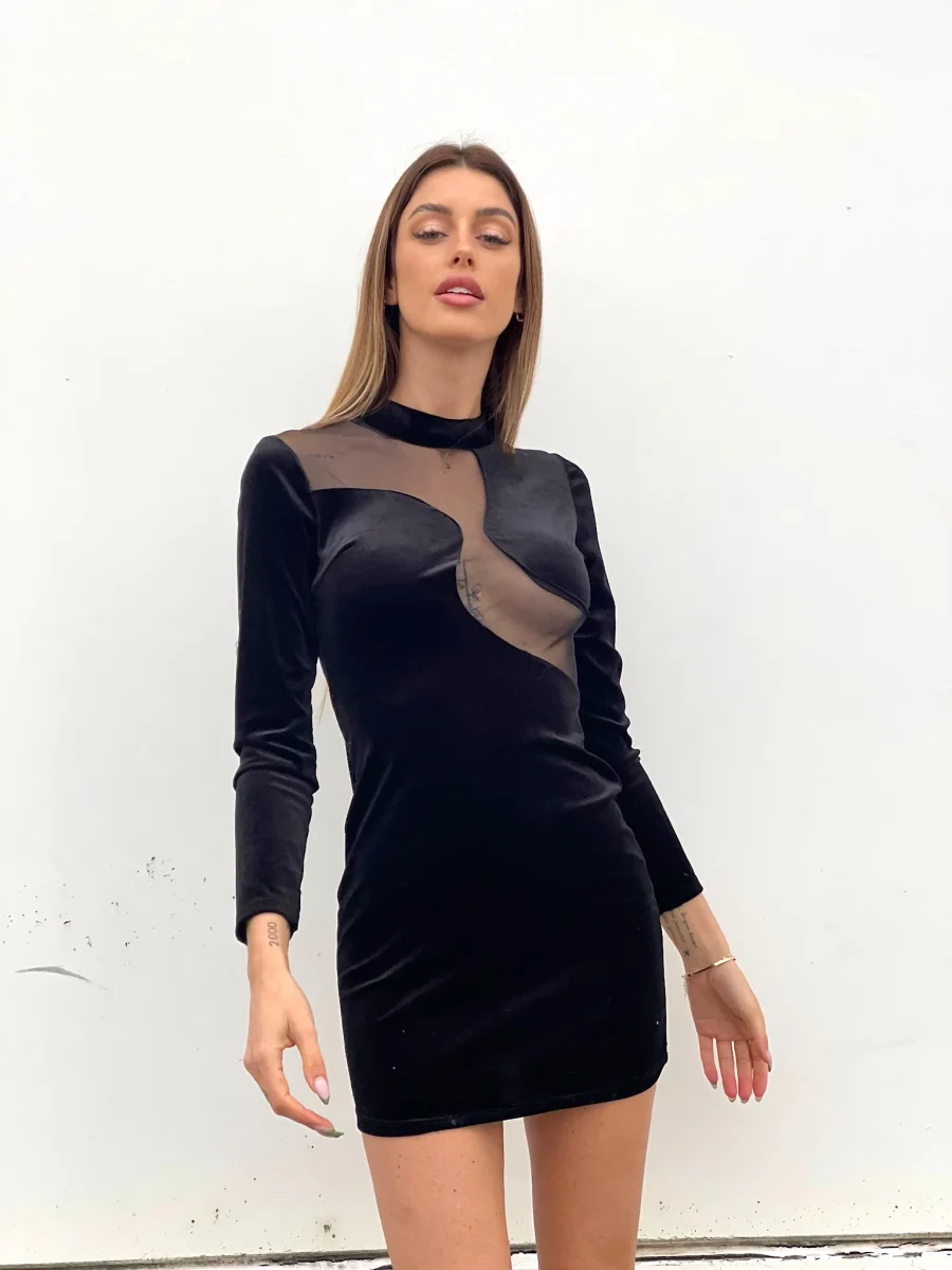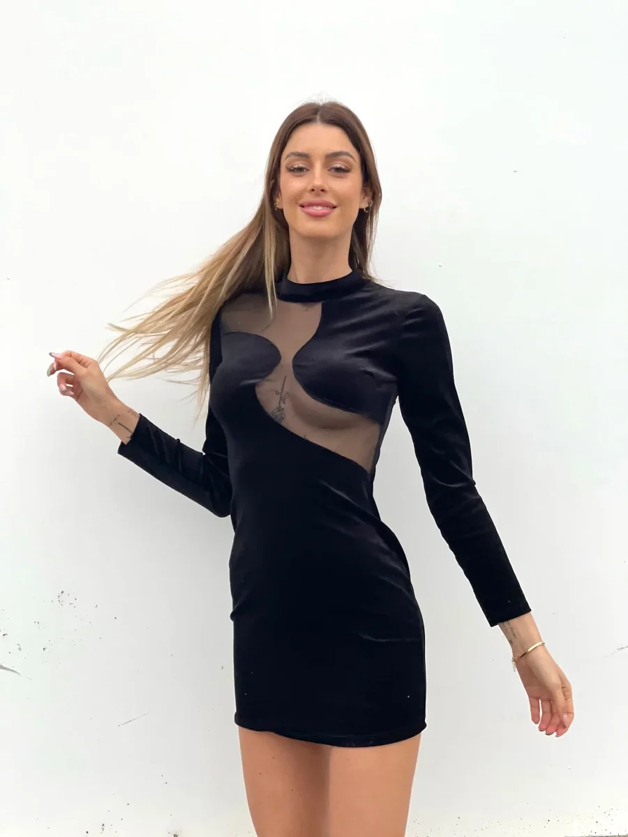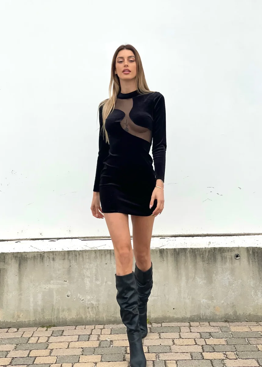 Abito in cotone nero con trasparenza davanti sul seno, tessuto aderente.