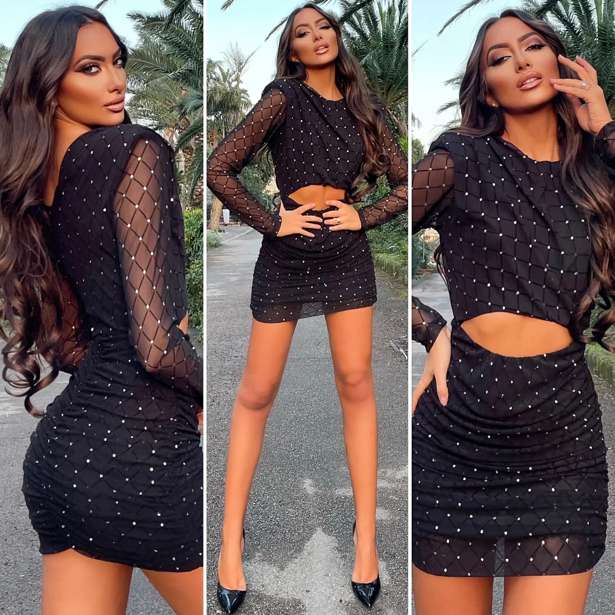 Abito nero con trasparenze e glitter