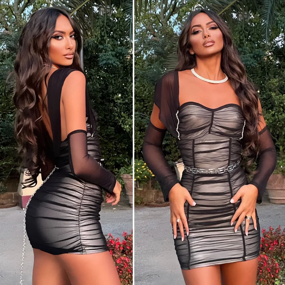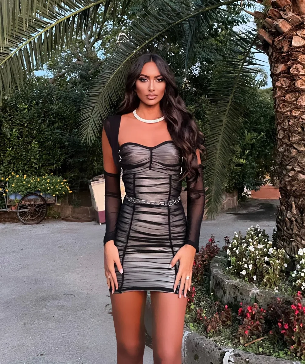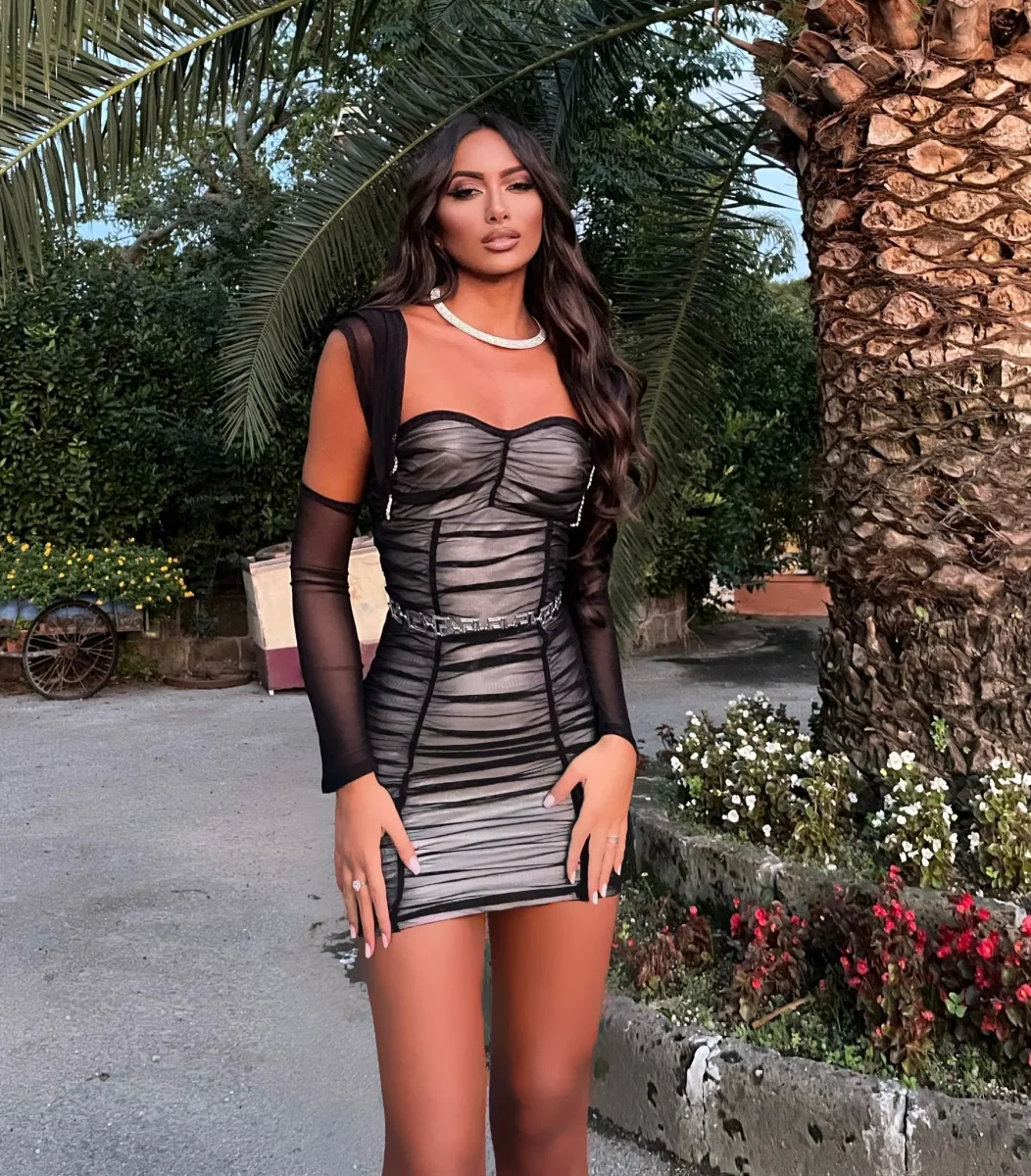 Particolarissimo abito aderente nude con velo nero manicotti e strass.