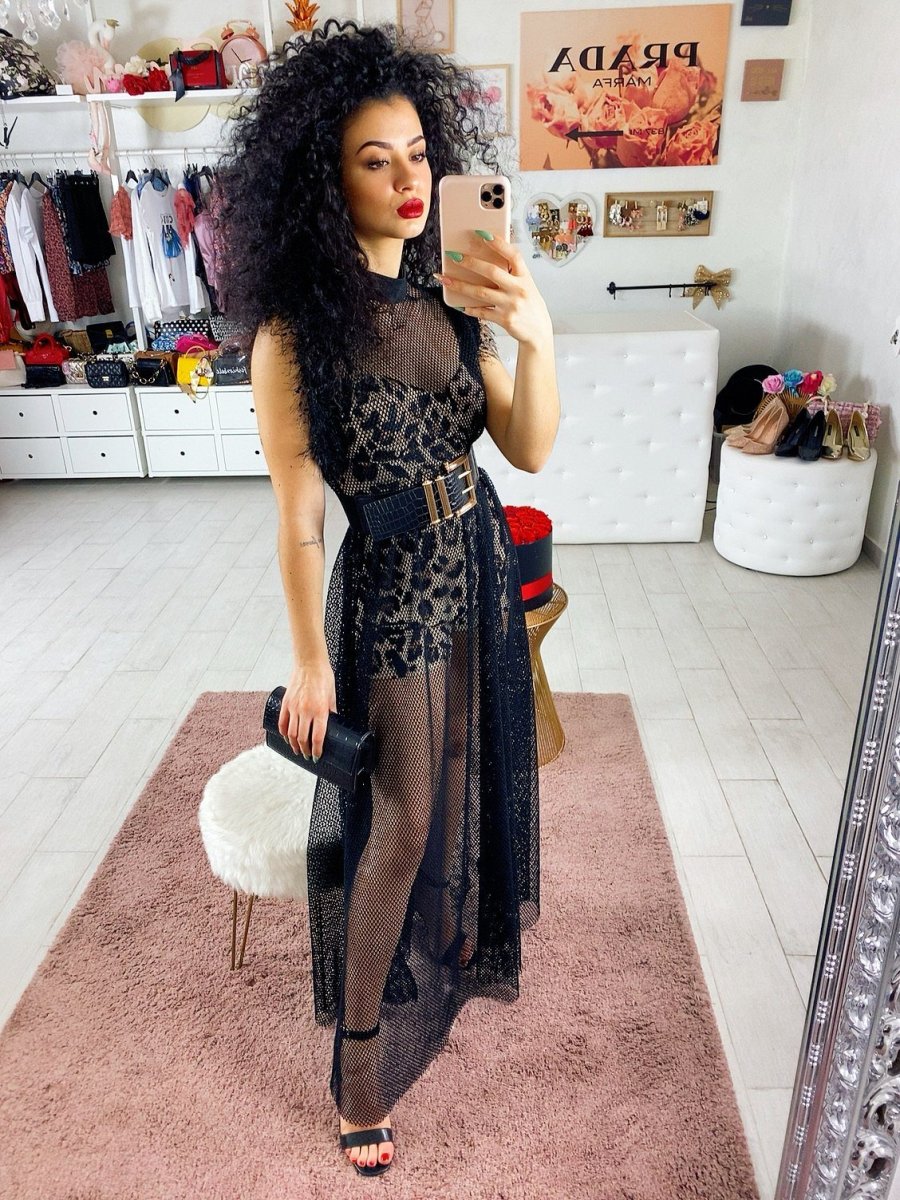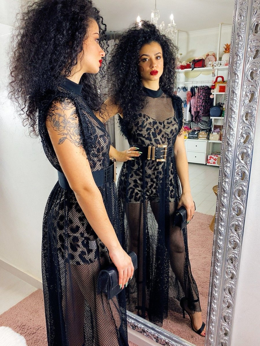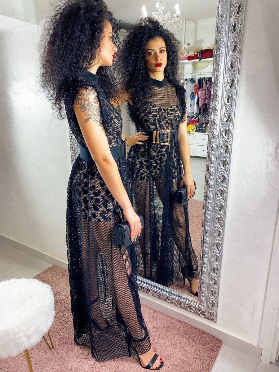 2 abiti in 1. Abito a retina smanicato con chiusura con bottone nel dietro, gonna ampissima. Tutina sotto in tessuto maculato che può anche essere usata singolarmente