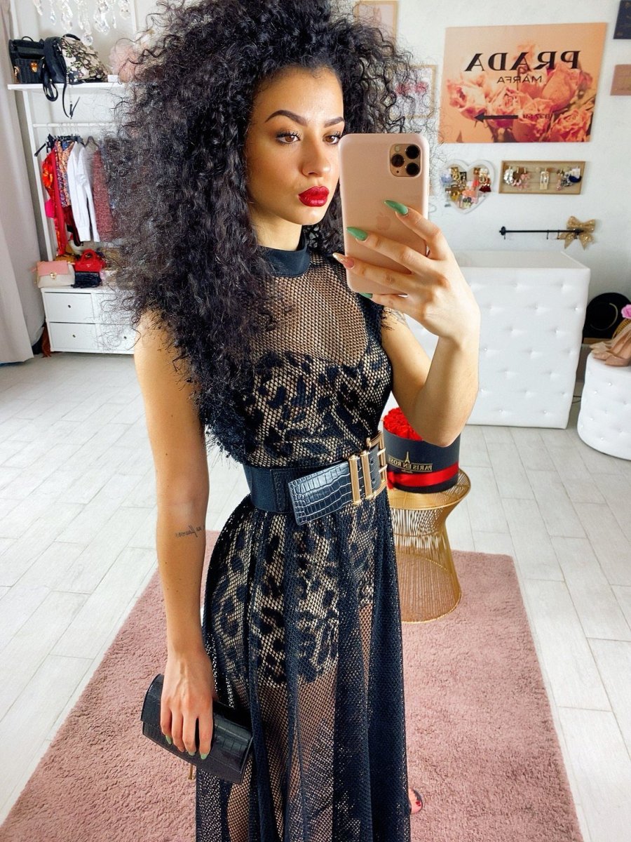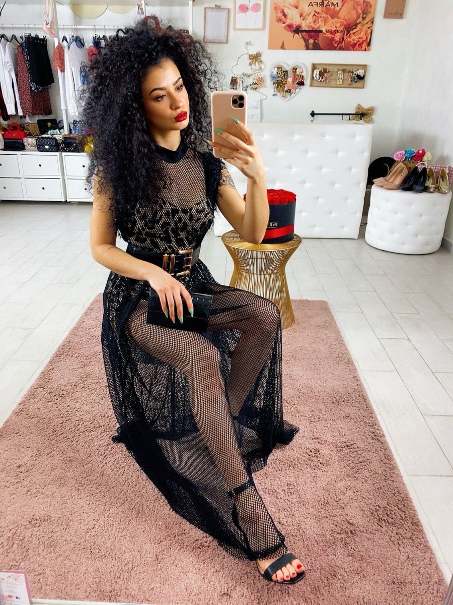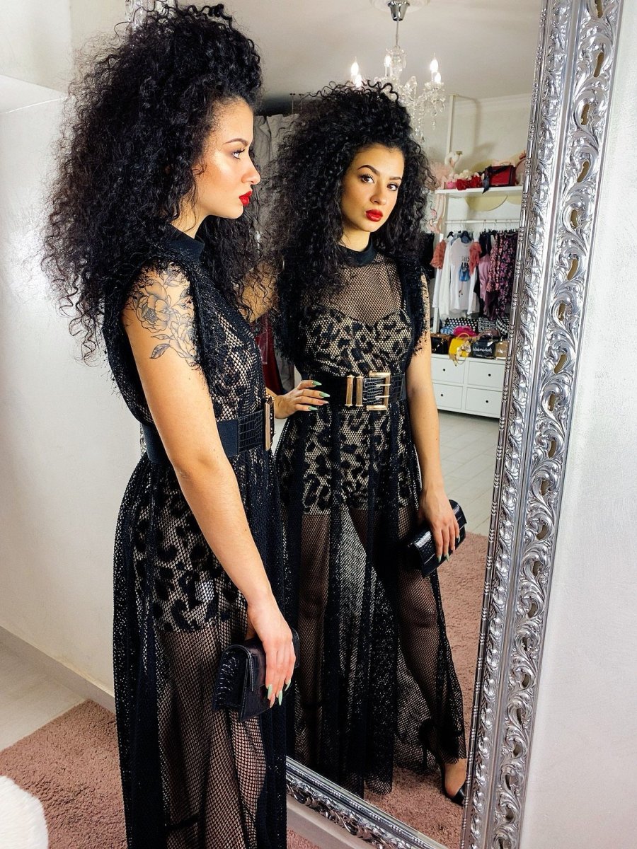2 abiti in 1. Abito a retina smanicato con chiusura con bottone nel dietro, gonna ampissima. Tutina sotto in tessuto maculato che può anche essere usata singolarmente