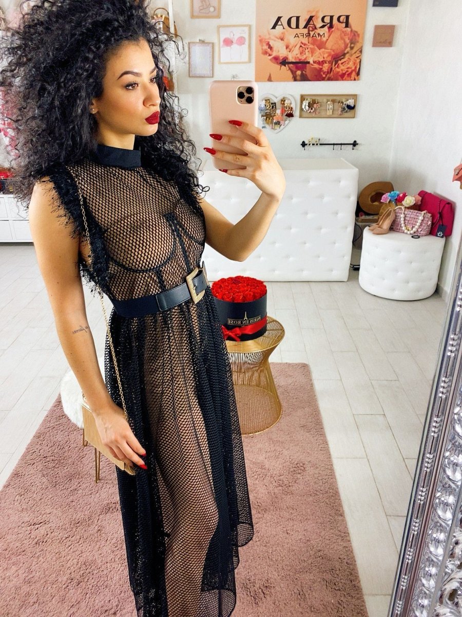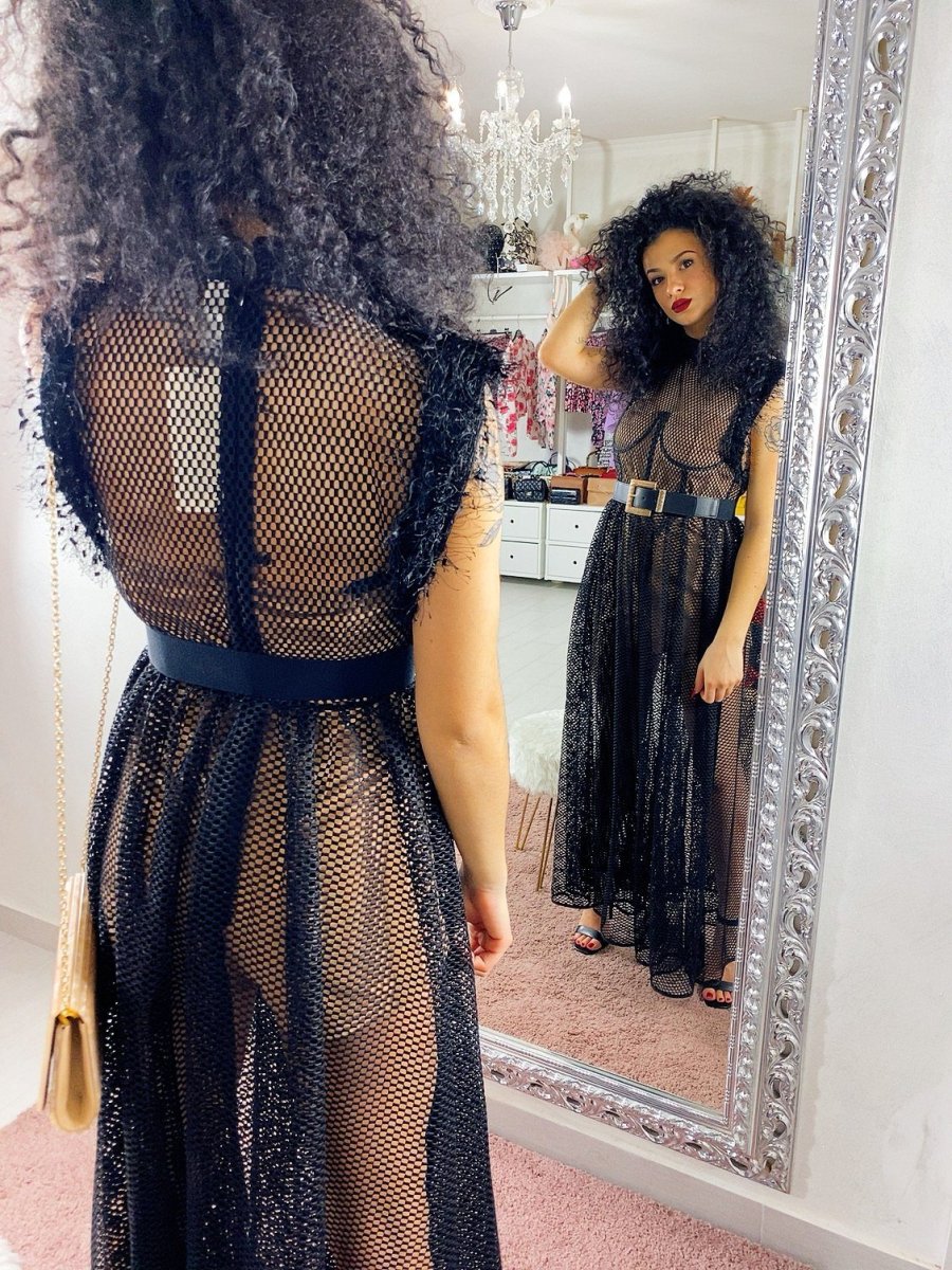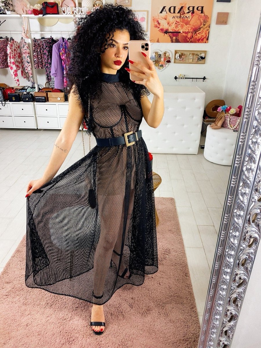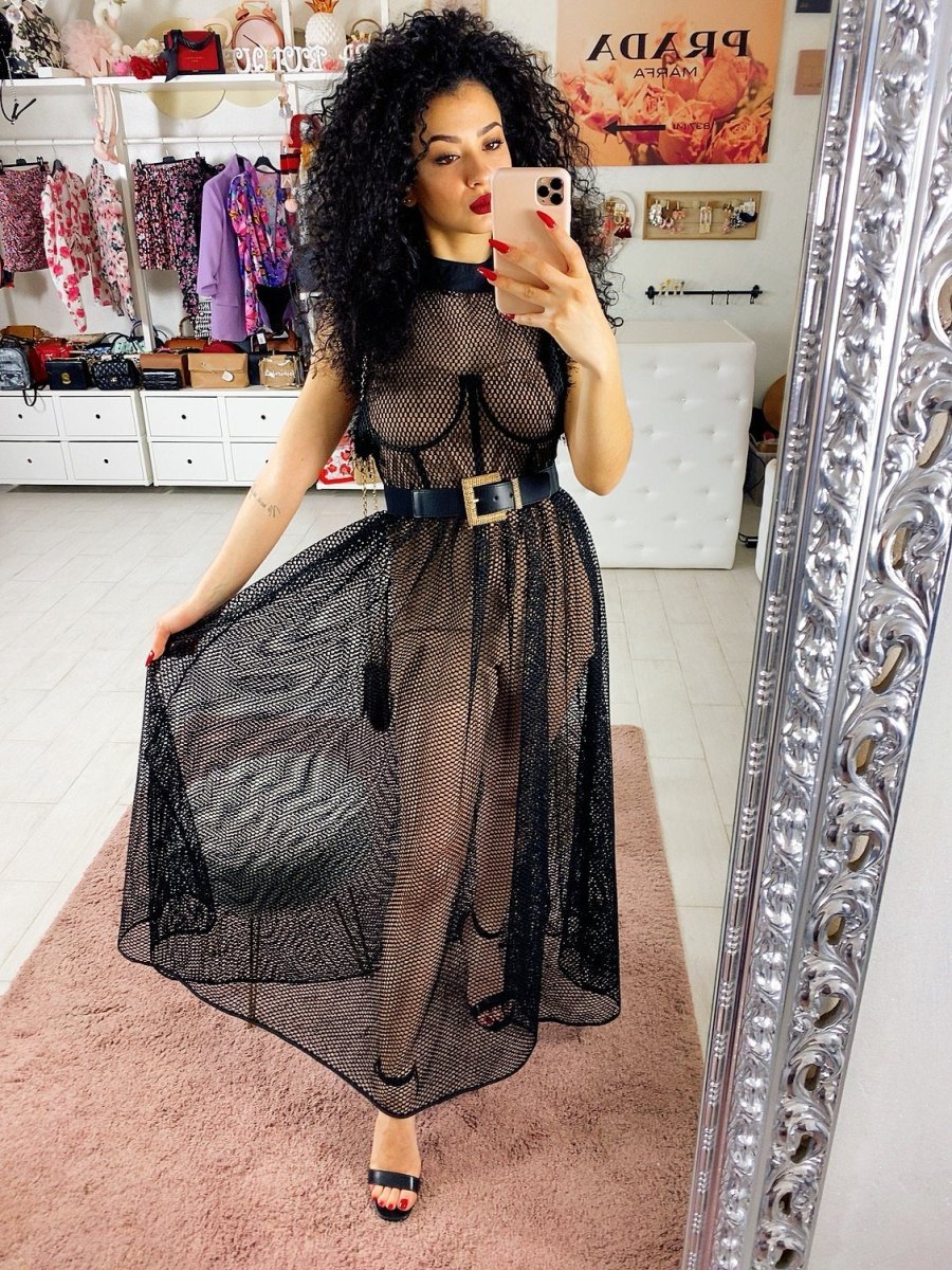 Abito composto da una tutina a corpetto dotata di coppe color nude e maxi abito a retina con gonna a ruota. Perfetto per un evento e per non passare inosservata