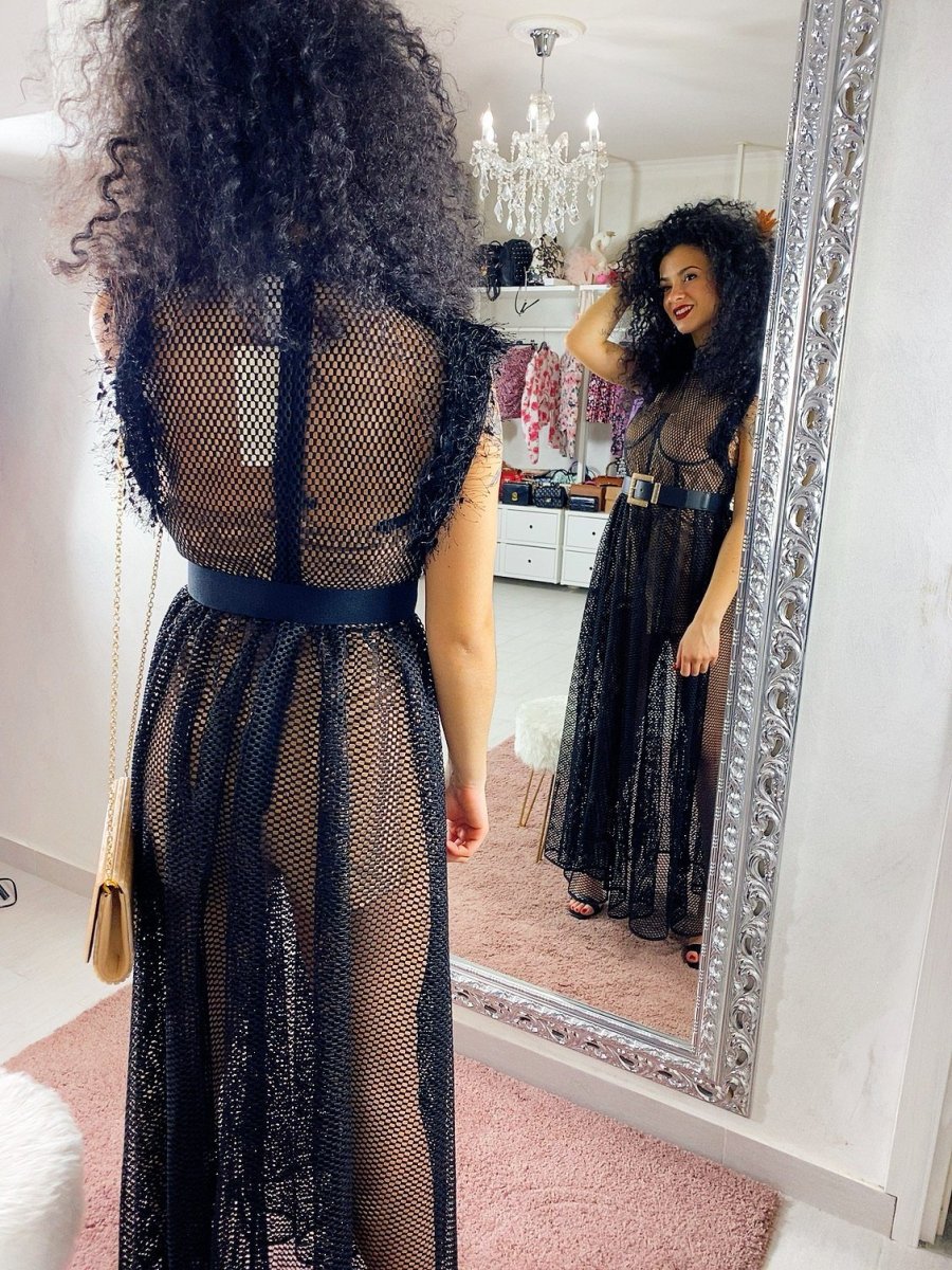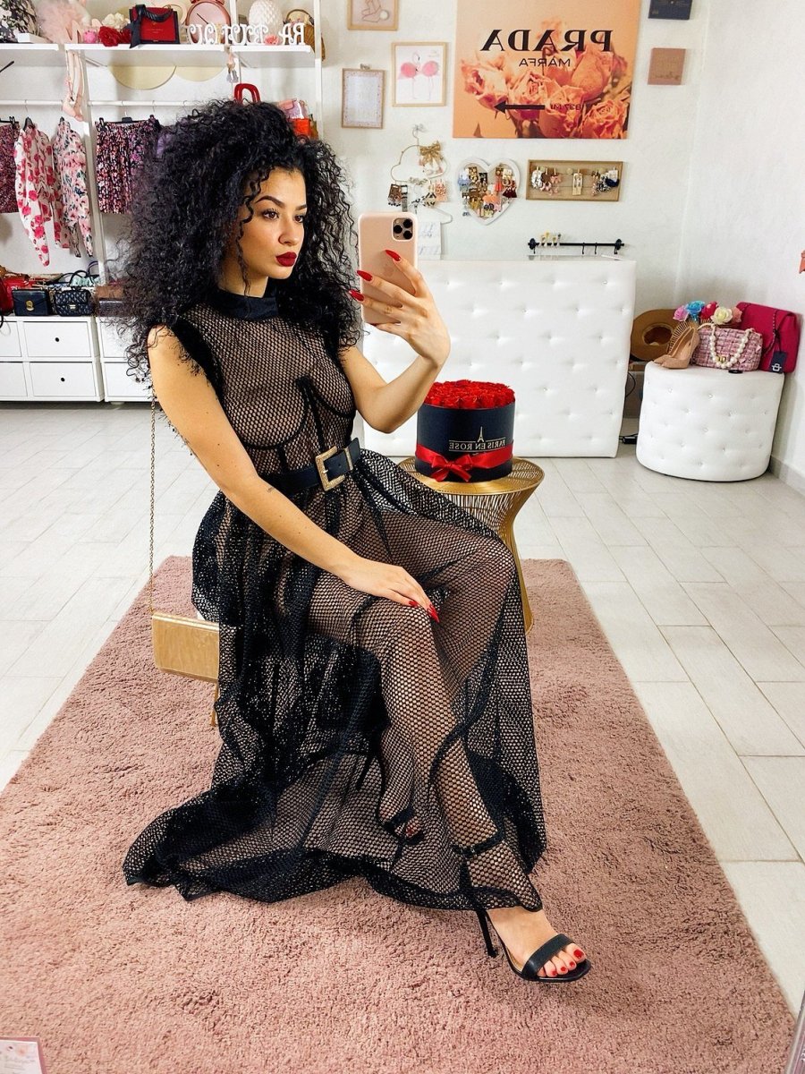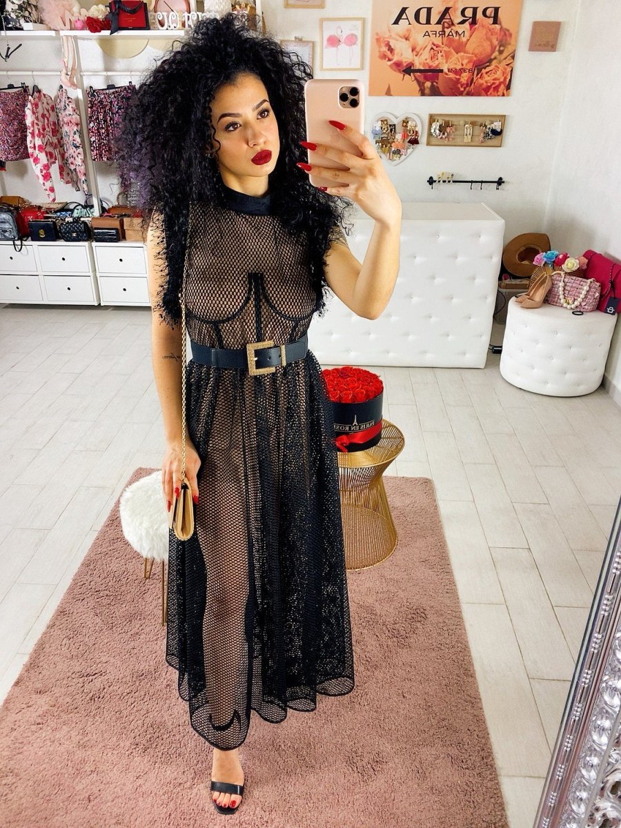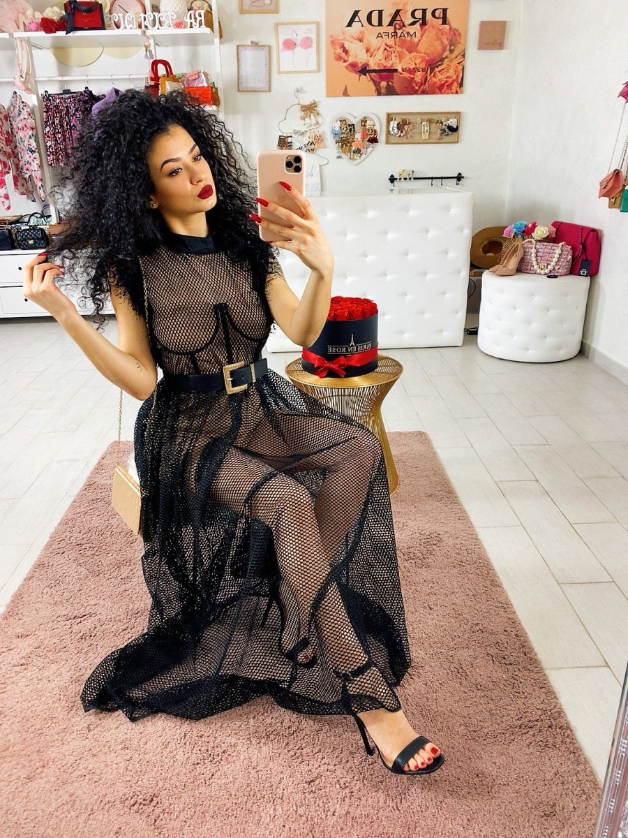 Abito composto da una tutina a corpetto dotata di coppe color nude e maxi abito a retina con gonna a ruota. Perfetto per un evento e per non passare inosservata