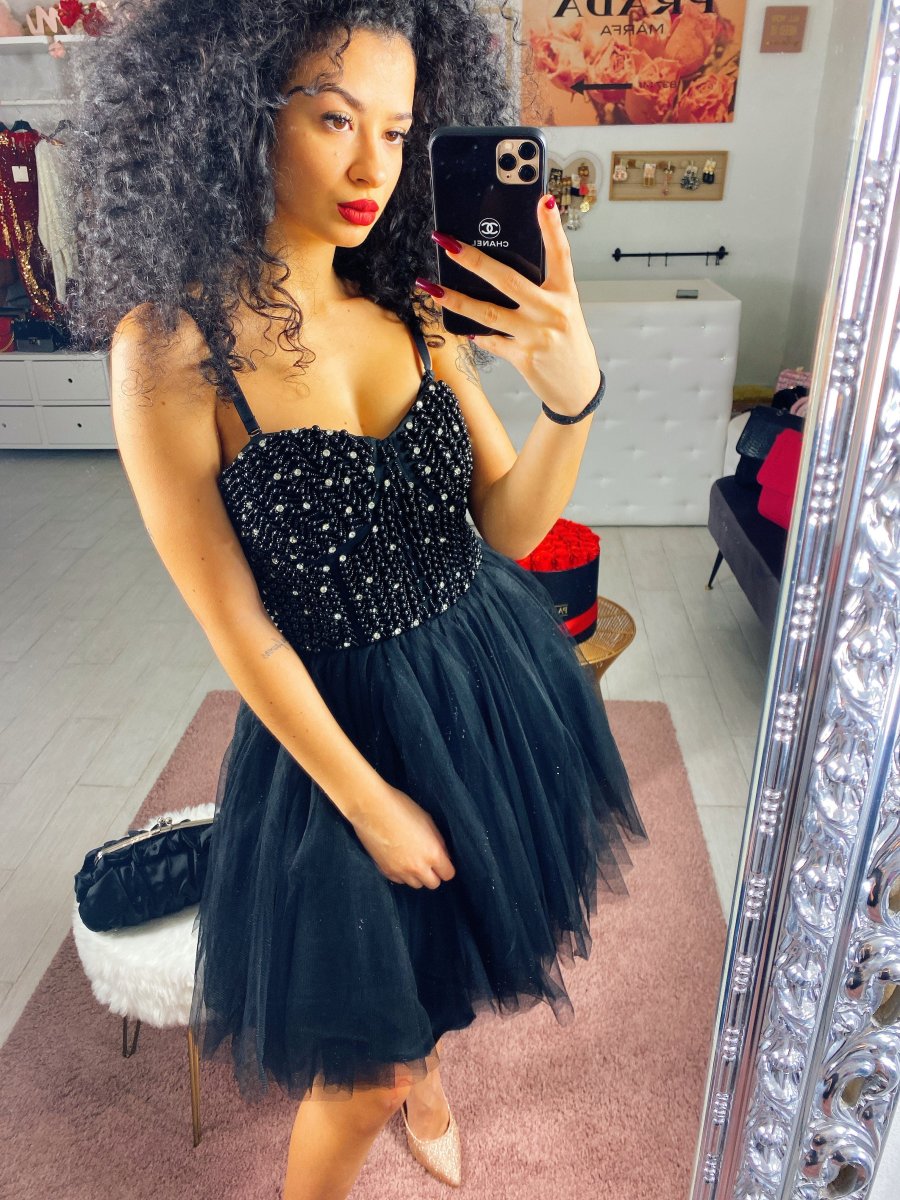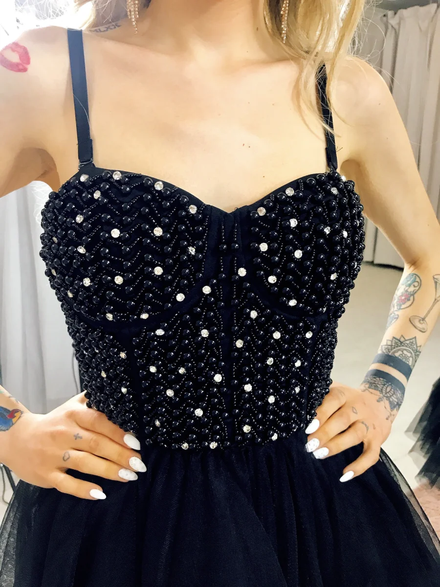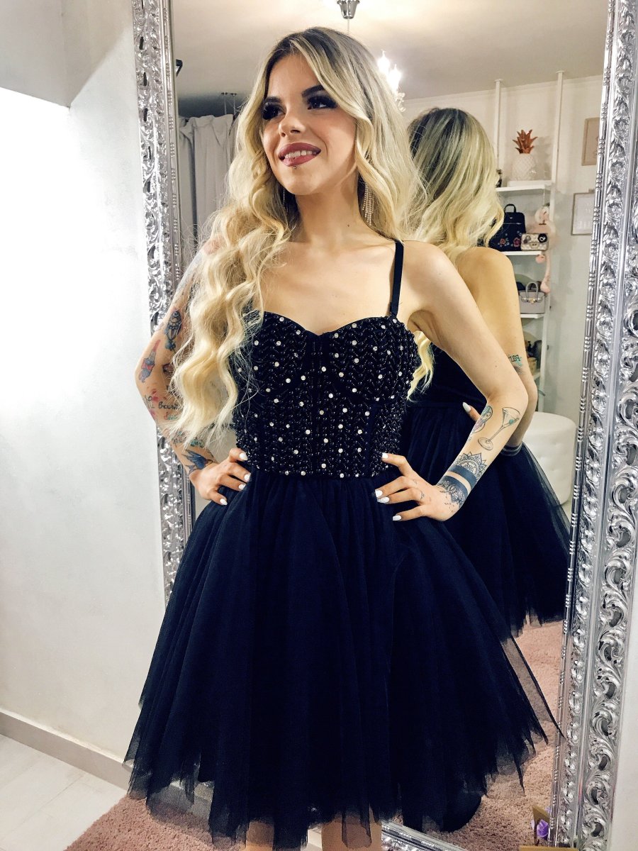 Abito da cerimonia di altissima qualità con gonna in tulle che parte dalla vita stretta con caduta molto ampia. Scollo con coppe rifinito con perle e strass incastonati Made in italy. Presenta coppe e zip posteriore con bretelline regolabili.