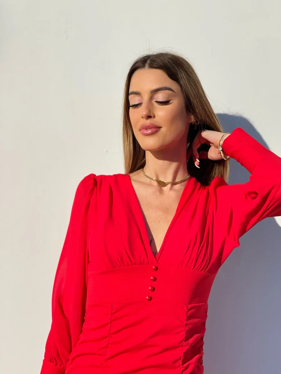 Abito in tessuto leggero con maniche velate morbide. Arricciature e bottoncini sul davanti. Taglia unica