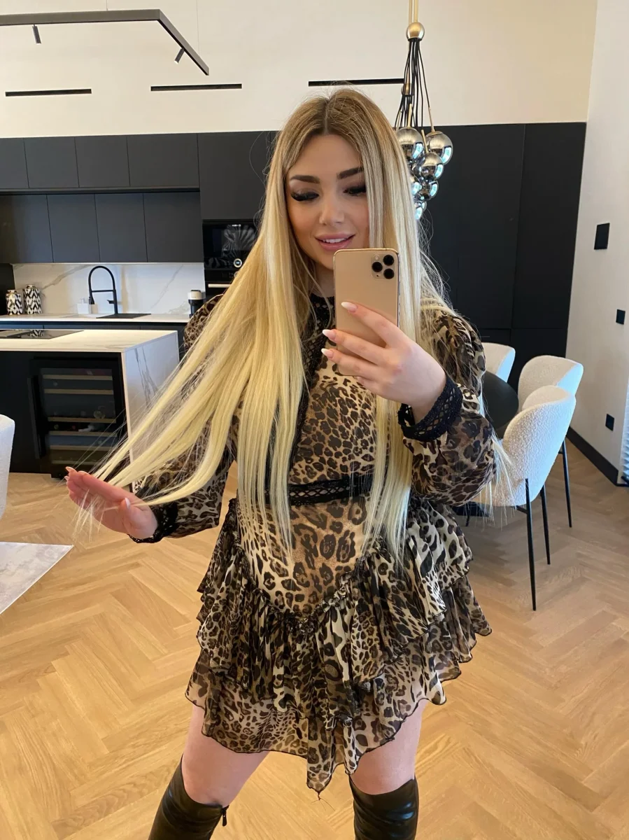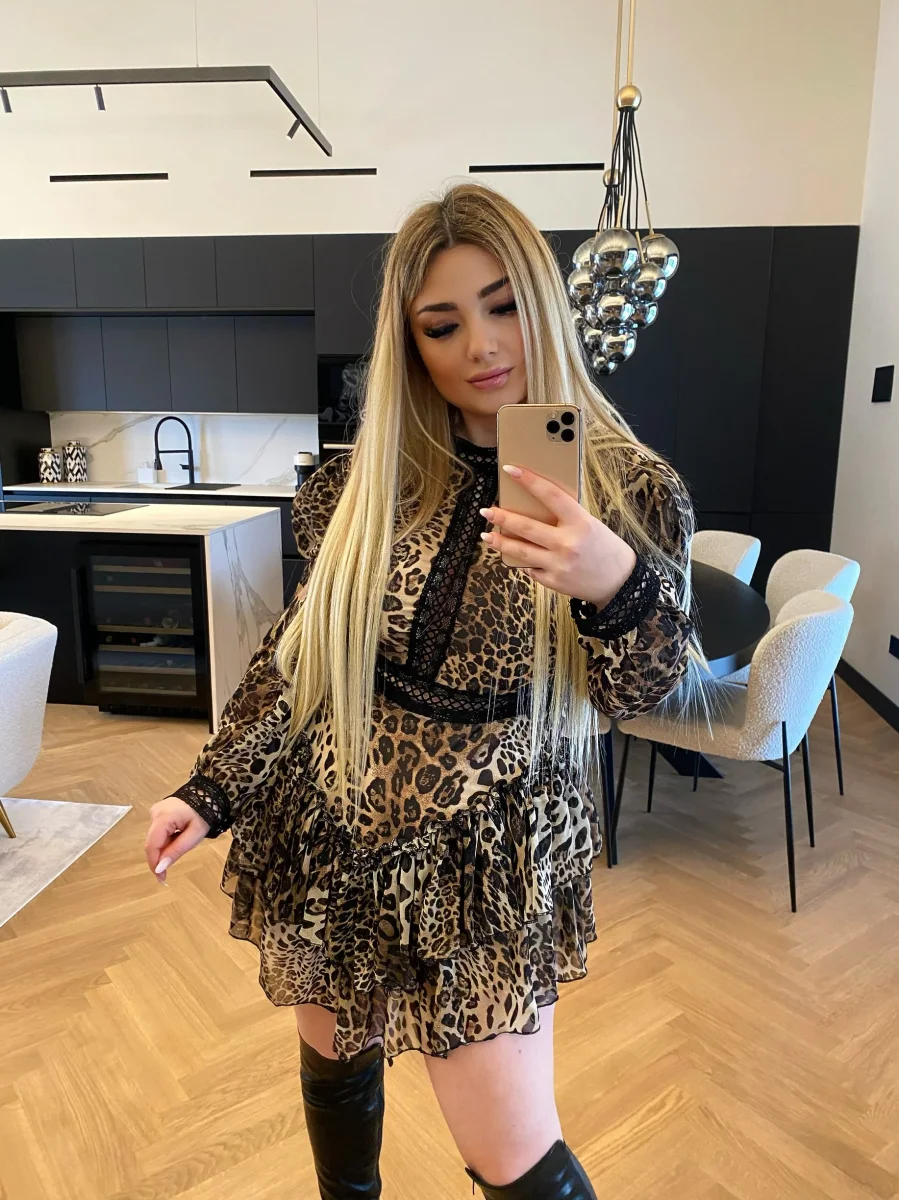 Abito in velo con punto vita accentuato. Gonna asimmetrica e fodera a pantaloncino.