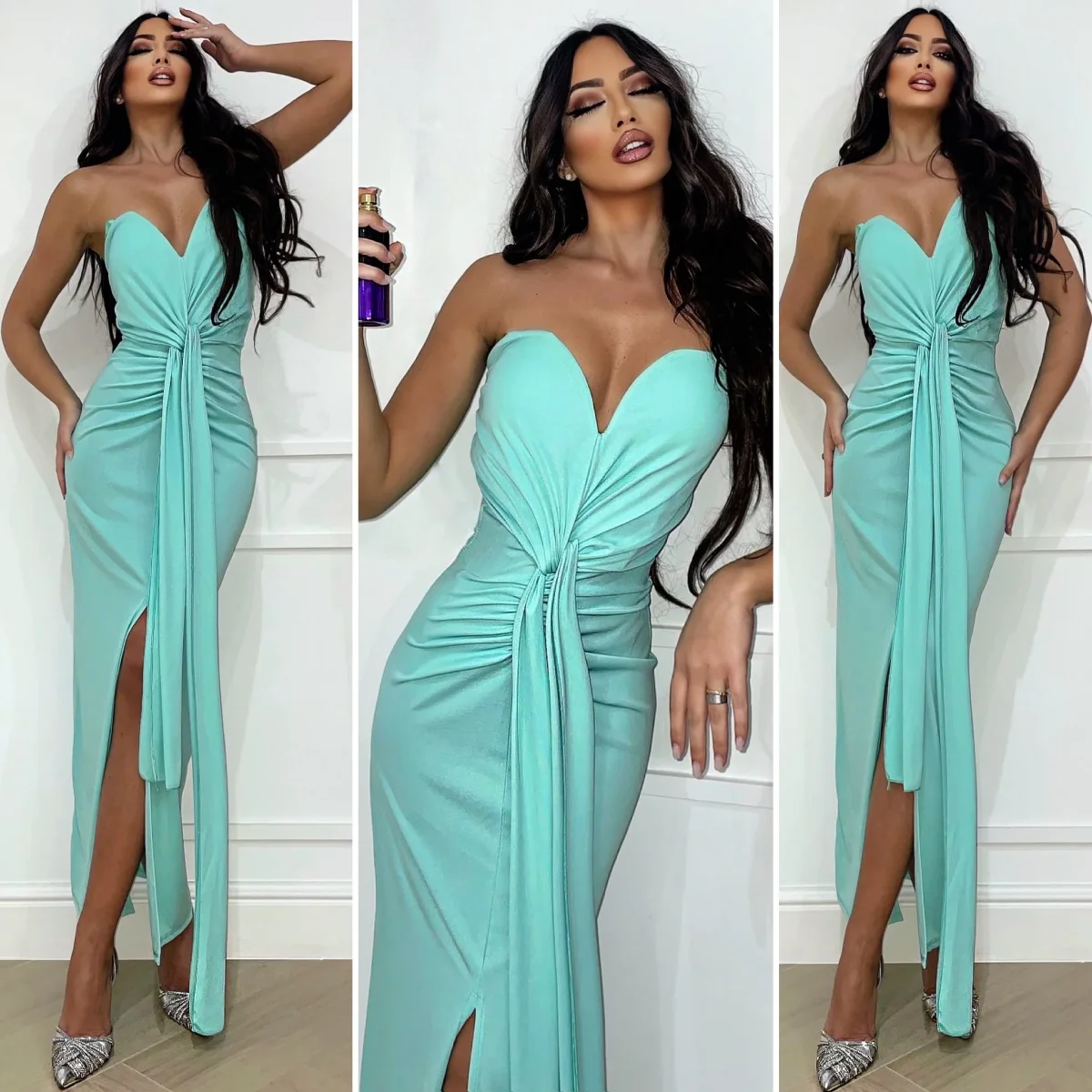 Abito in lycra aderente e elasticizzato con scollo a cuore e coppe con bredelline regolabili. Maxi spacco e nodo sul davanti
