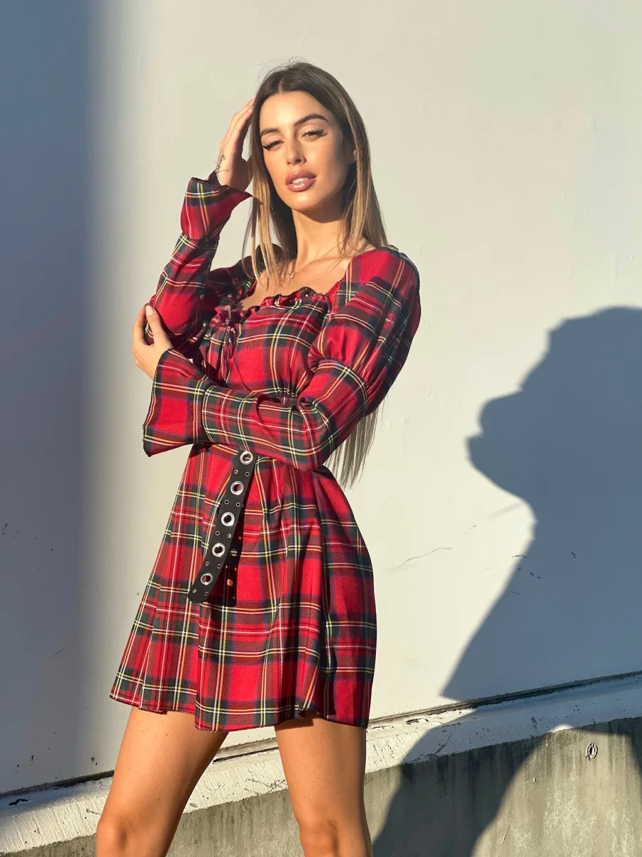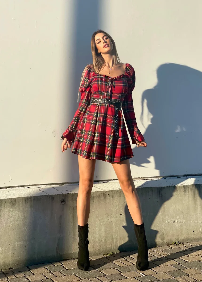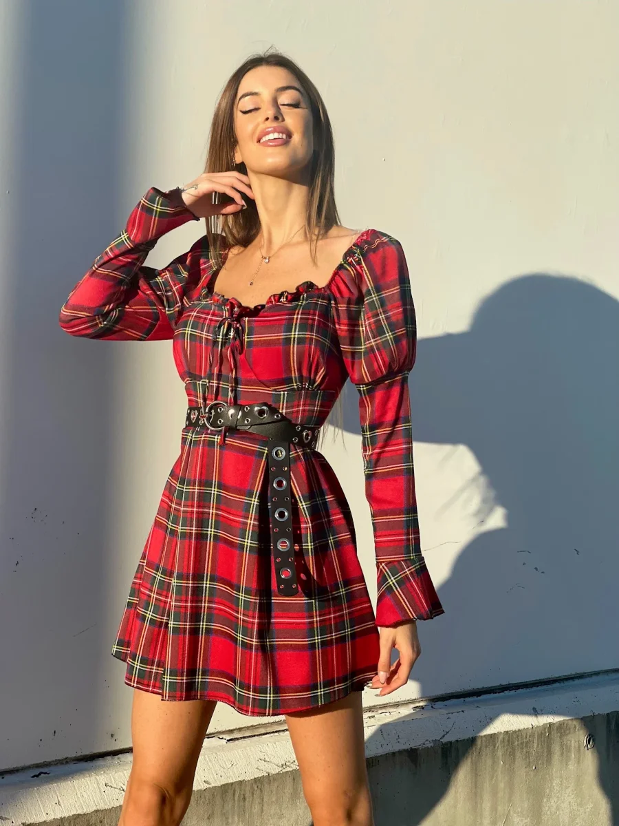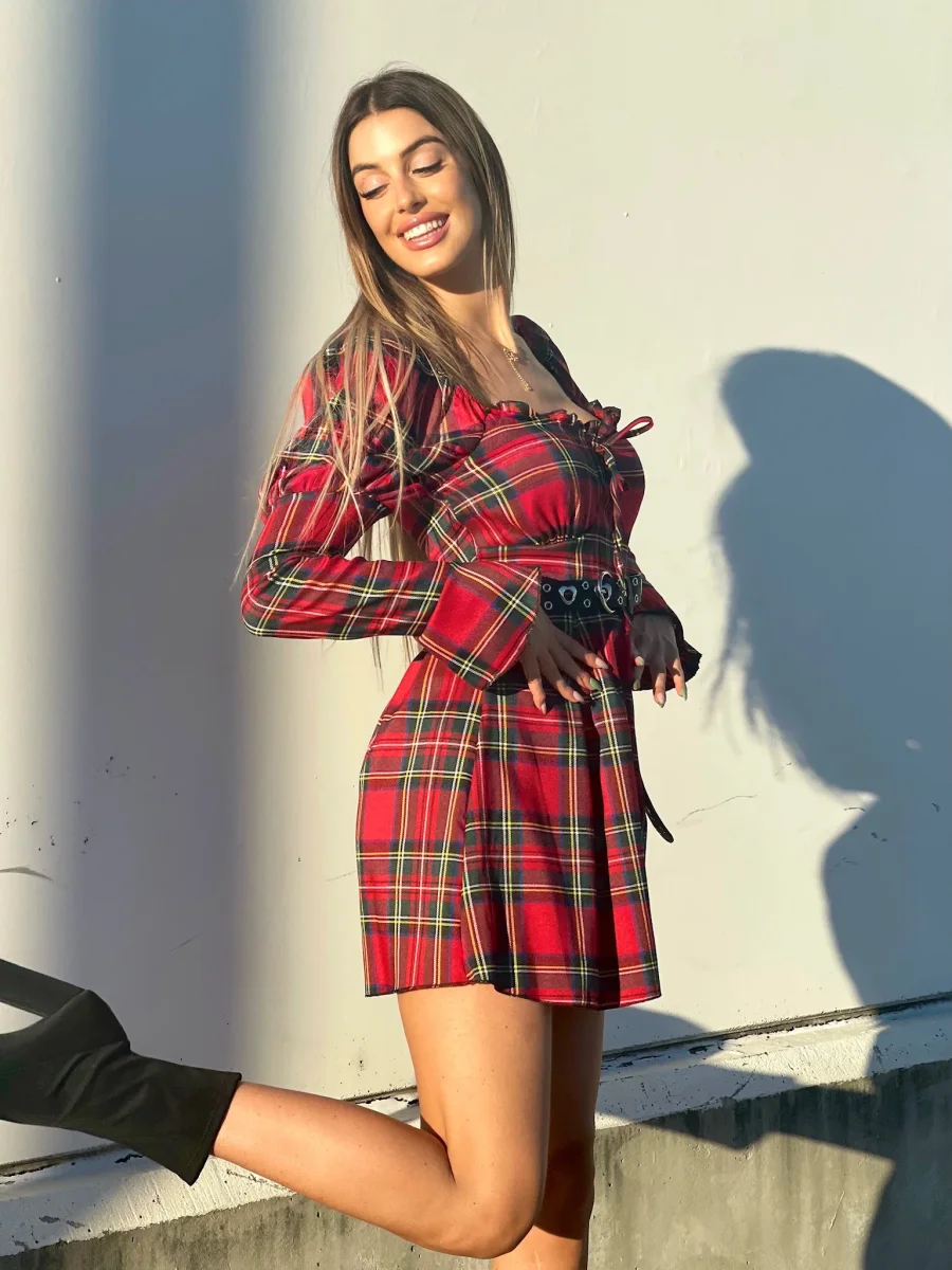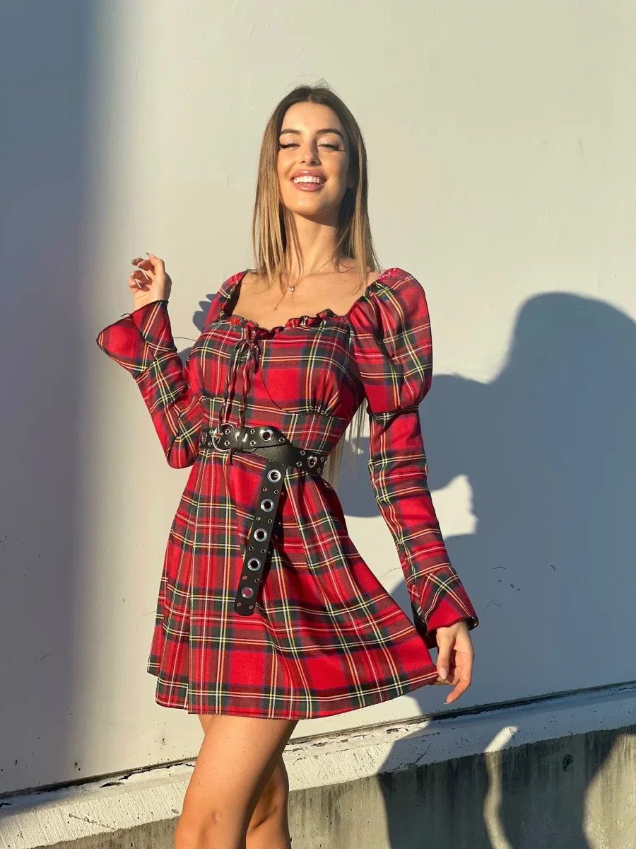 Abito scozzese con coppe e scollo a barchetta. Perfetto per la stagione in corso.