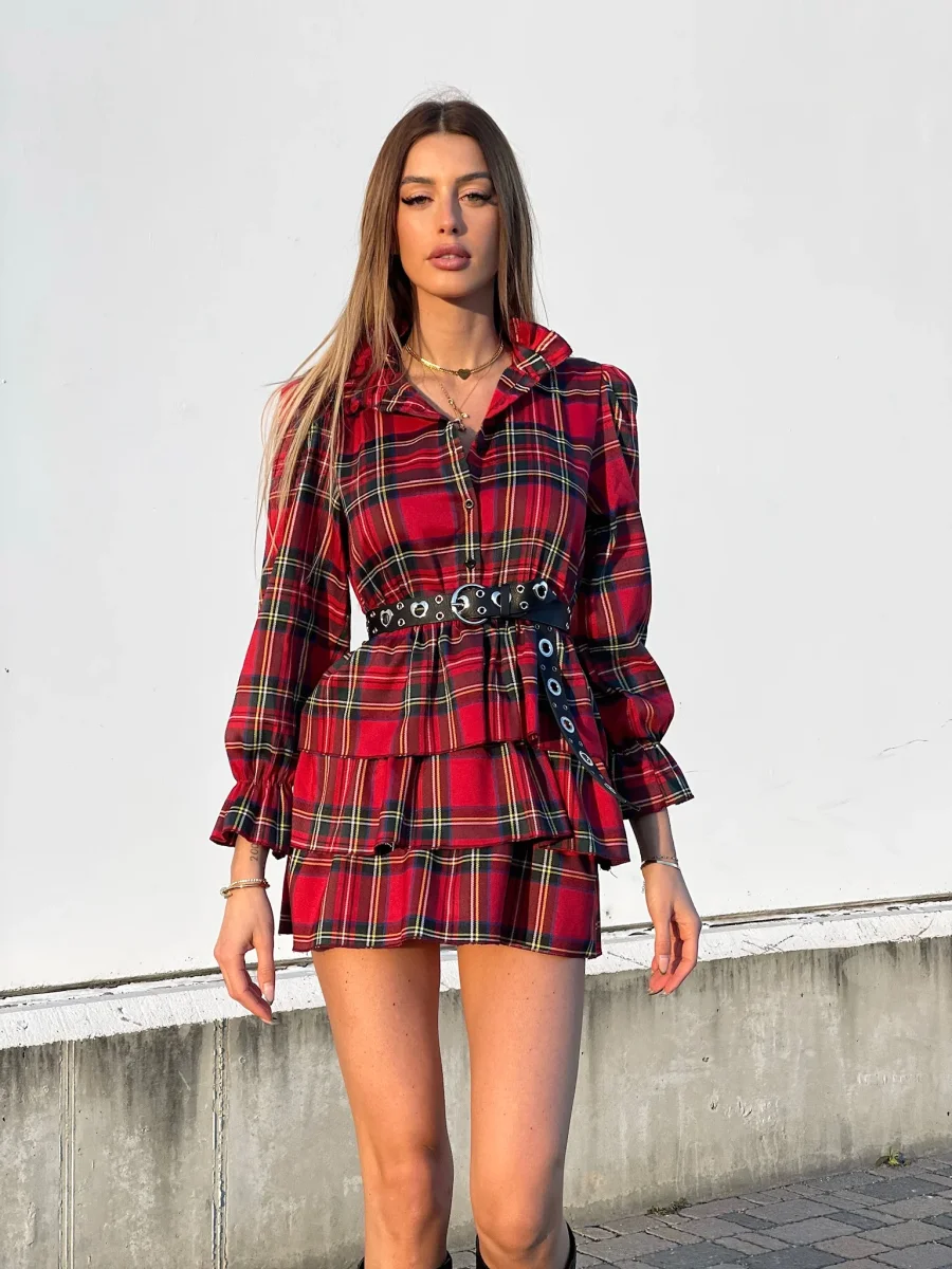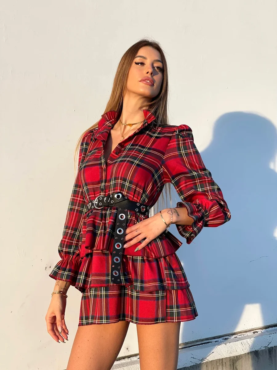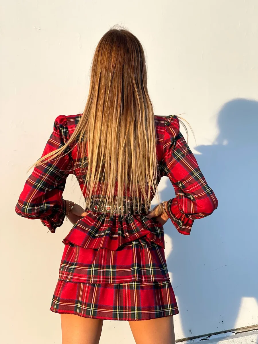 Abito in cotone scozzese con particolari balze e chiusura dietro alla schiena.
