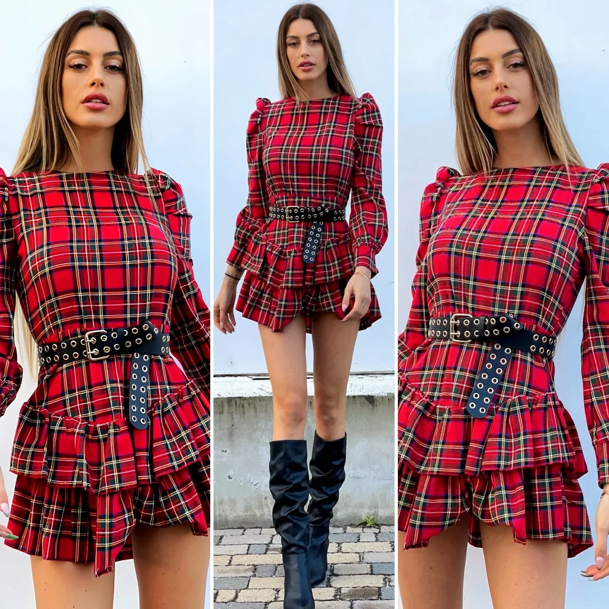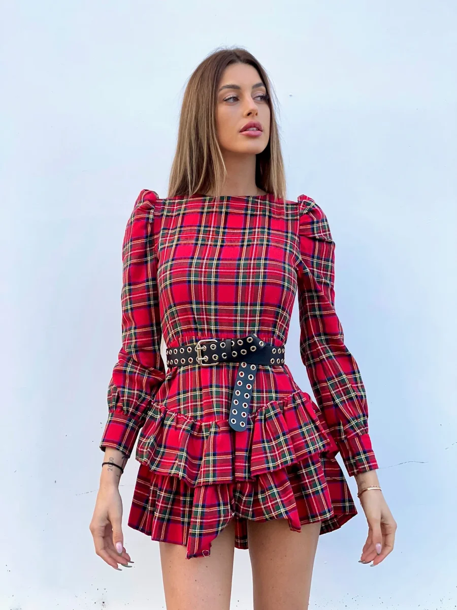 Abito in cotone scozzese con particolari balze e chiusura dietro alla schiena.