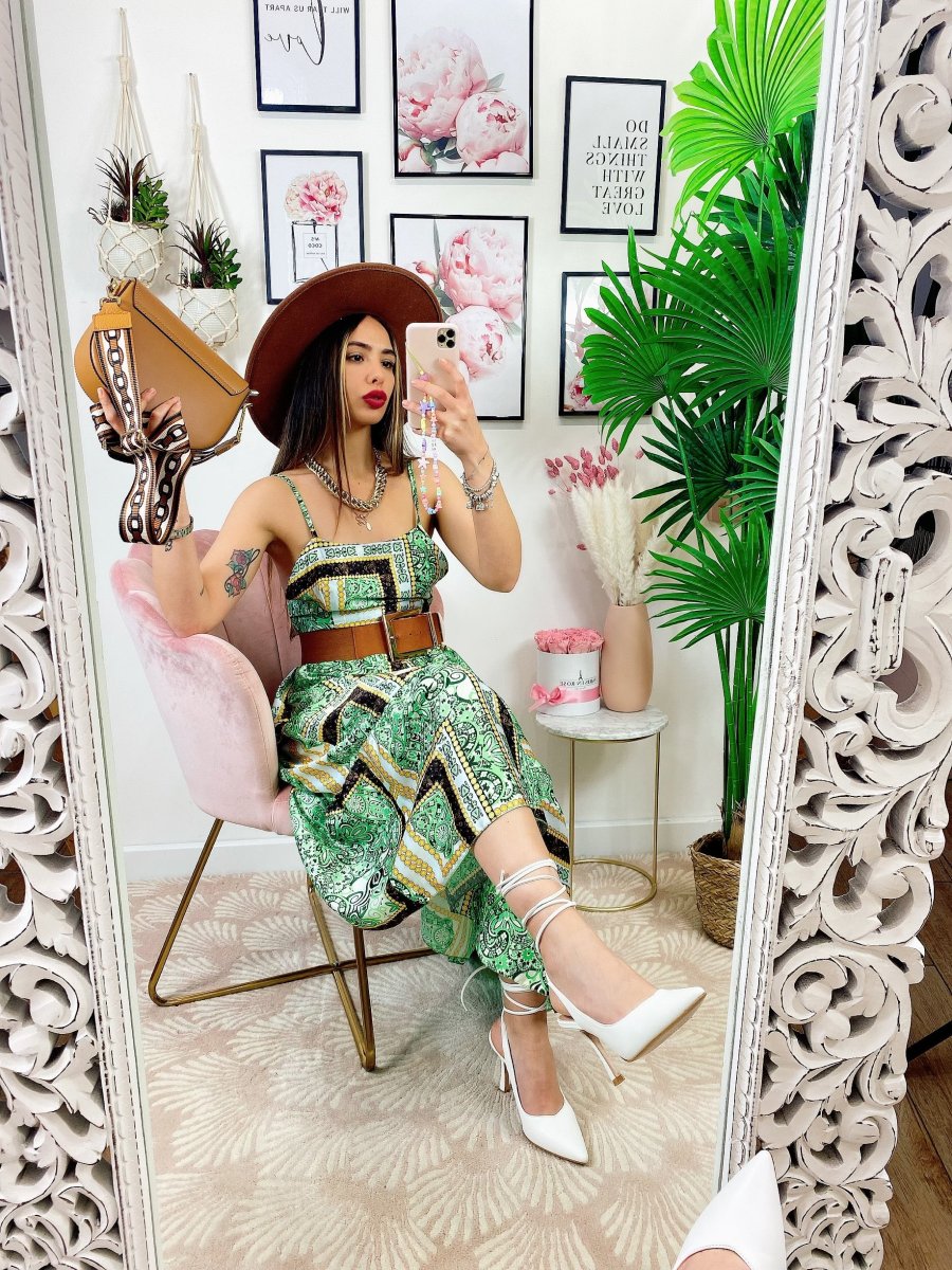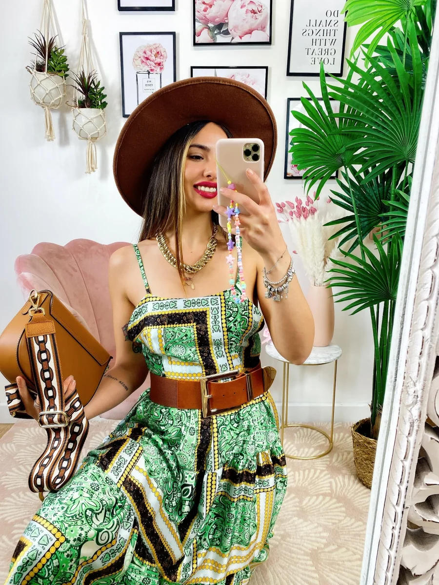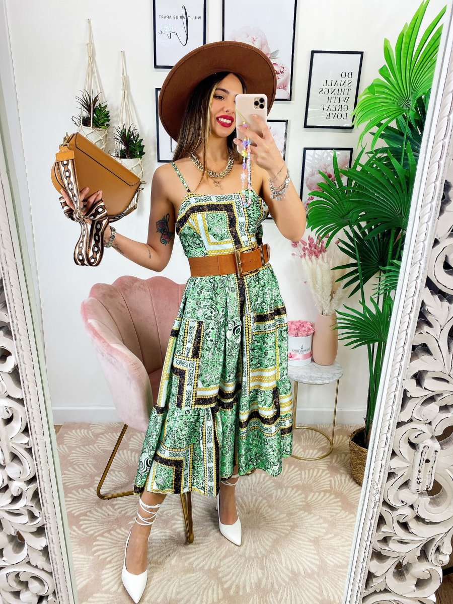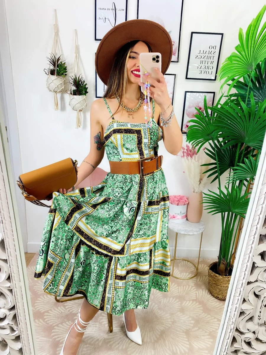 Abito stampa etnica con fiocco anteriore in tessuto fresco, estivo.