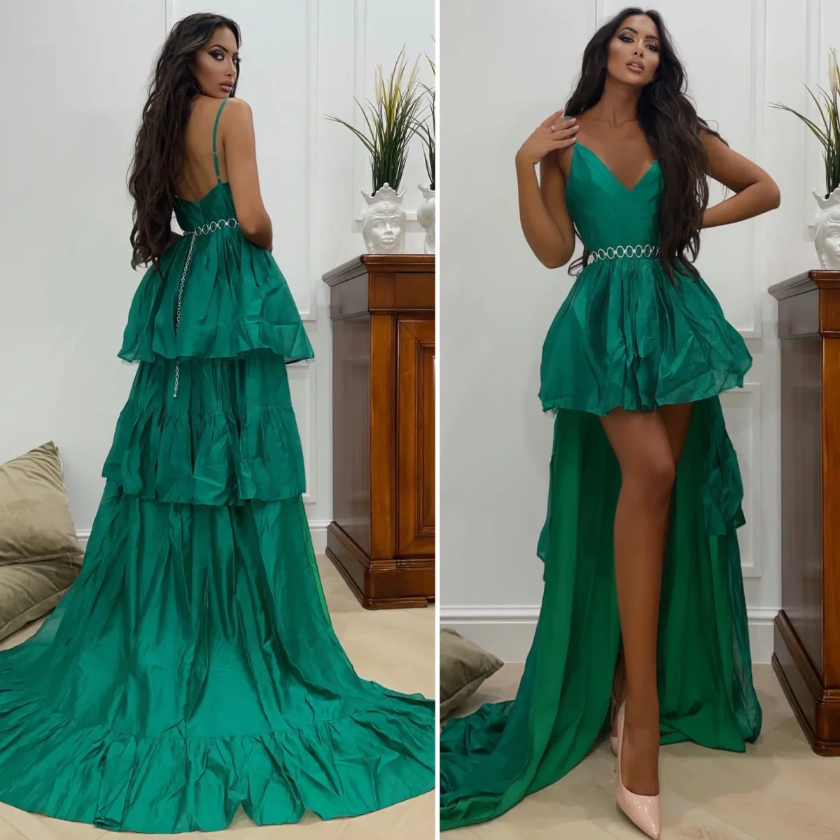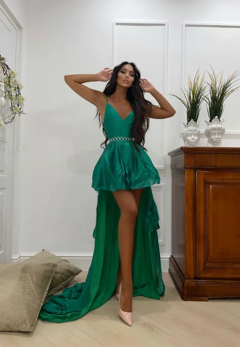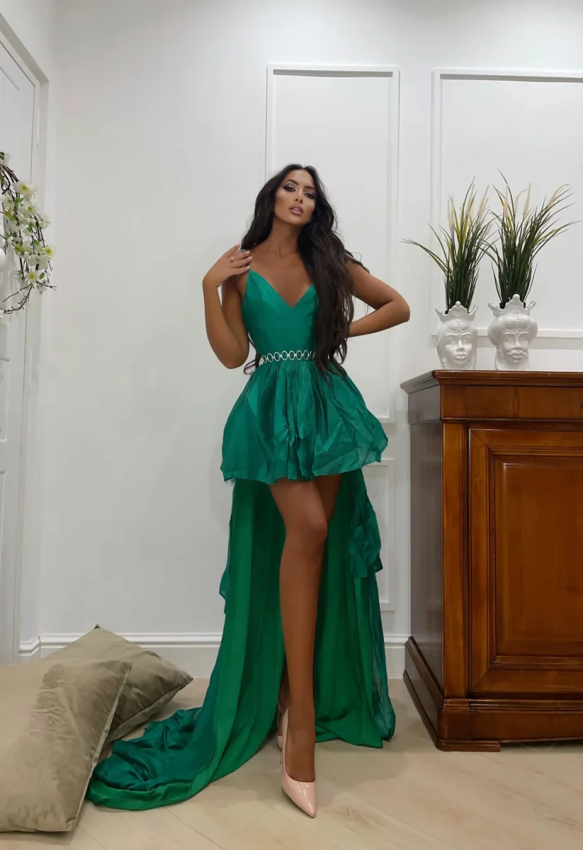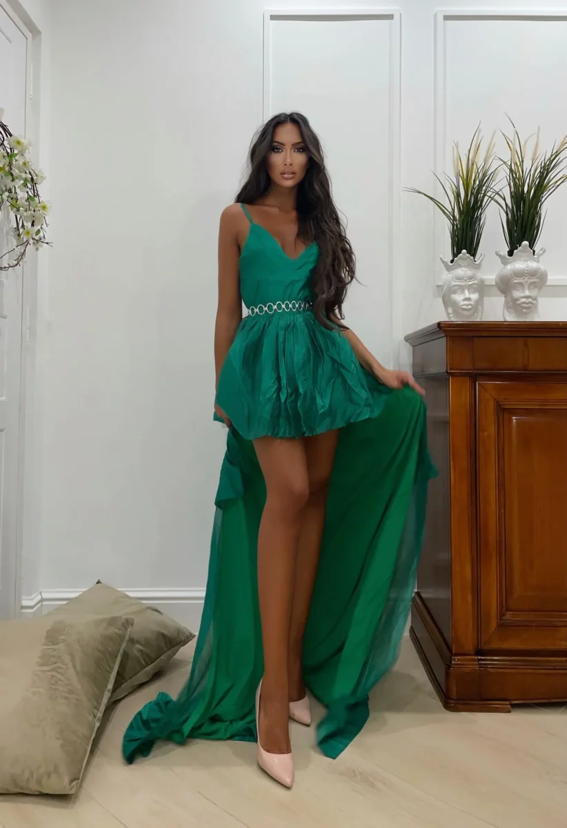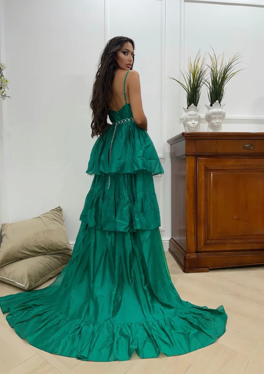 Abito verde in cotone elasticizzato gonna a balze con tulle e maxi gonna con strascico