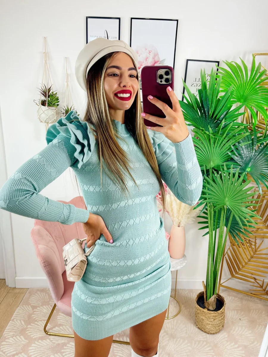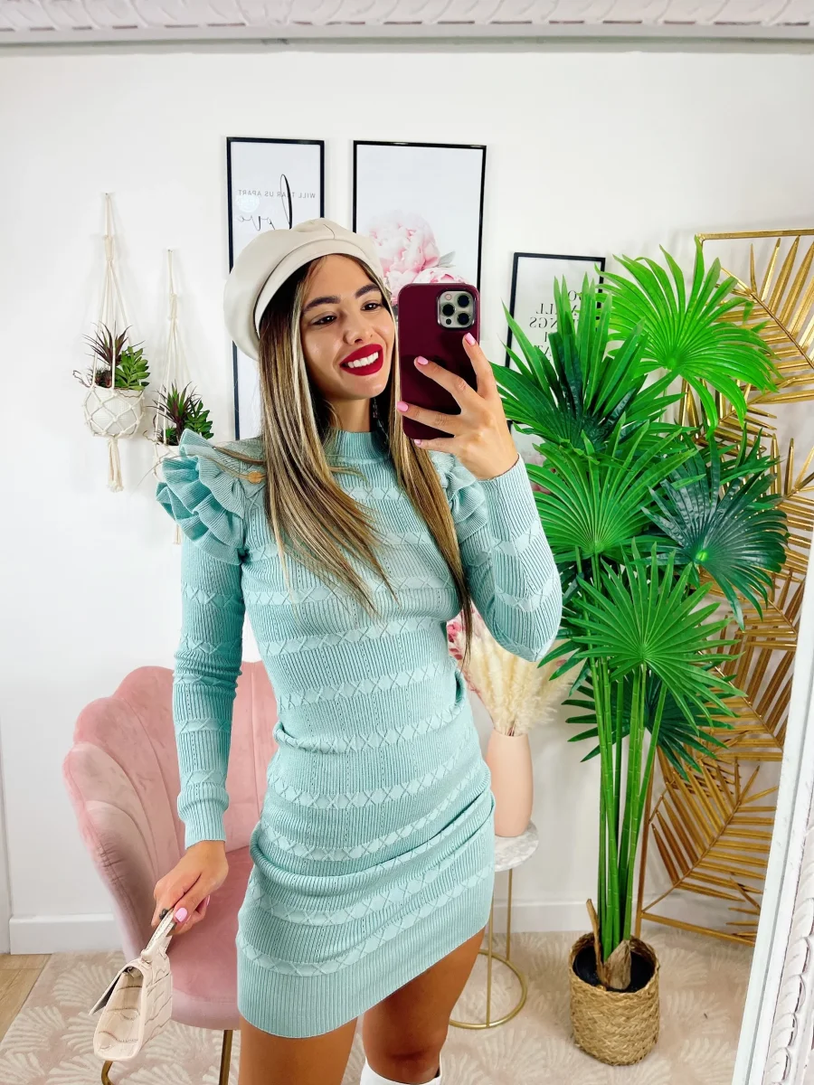 Abito tiffany in ottimo tessuto autunno/inverno, elasticizzato con bottoni oro e collection leggermente alto, il tutto rifinito dalla rouches sulla spalla.