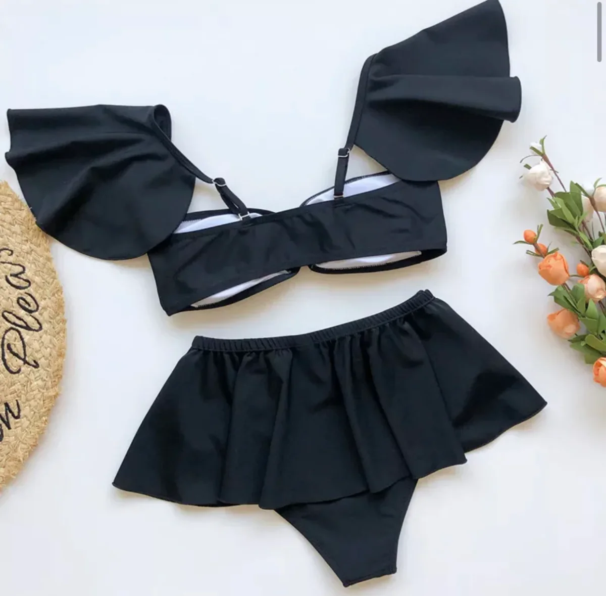 Bikini a fascia con maniche Staccabili, anche il voilant si può staccare, bretelline regolabili e mutanda normale.