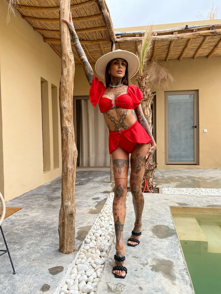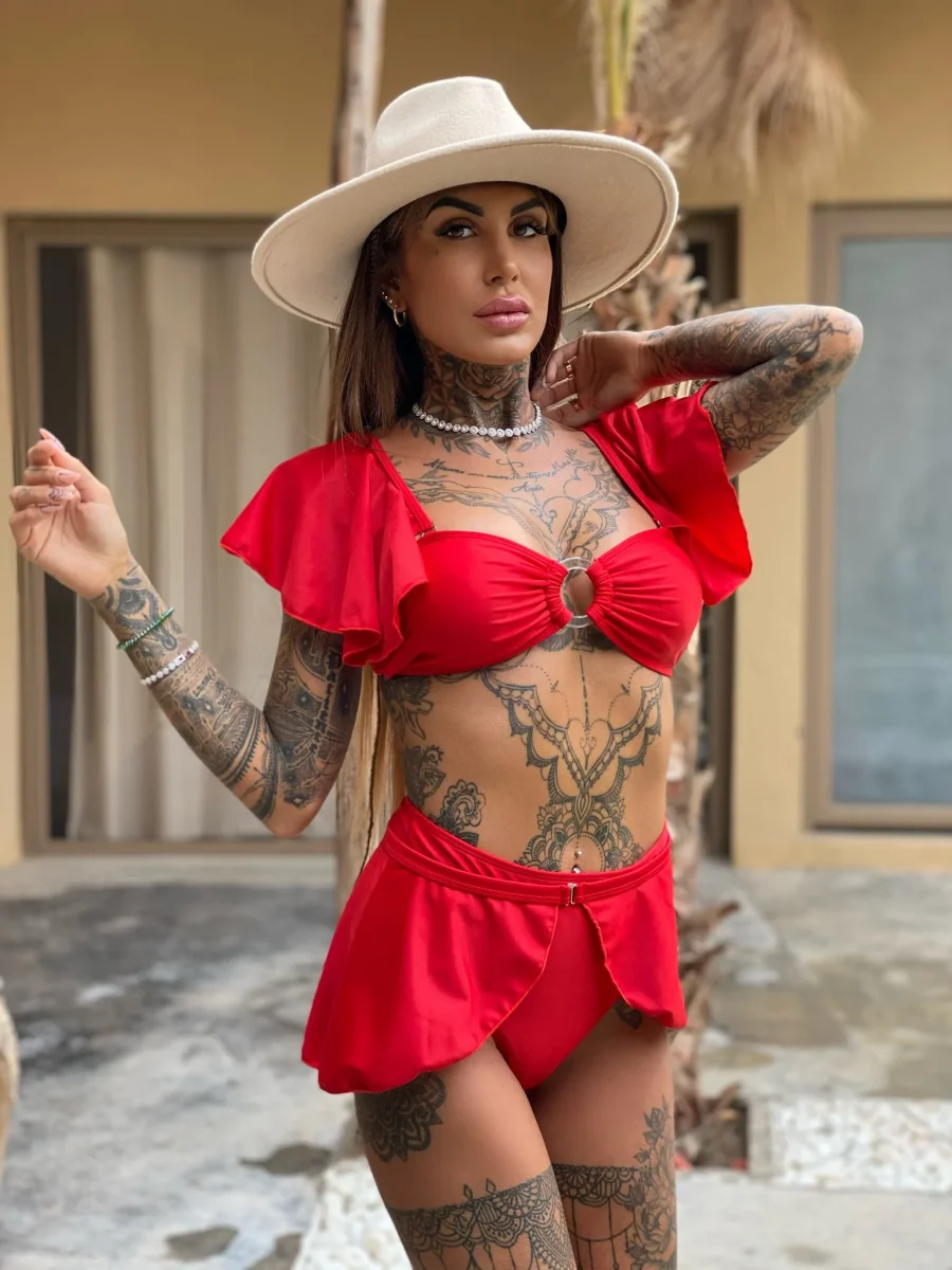 Bikini a fascia con maniche Staccabili, anche il voilant si può staccare, bretelline regolabili e mutanda normale.