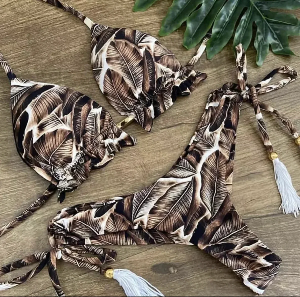 Bikini a triangolo con corda e coppe estraibili, a brasiliana con laccetti regolabili laterali. La modella indossa taglia M