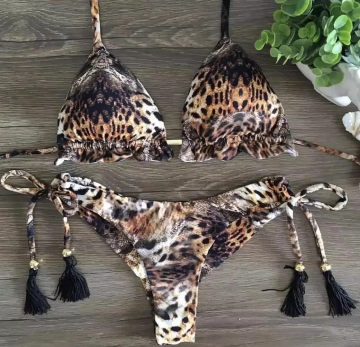 Bikini a triangolo con corda e coppe estraibili, a brasiliana con laccetti regolabili laterali.