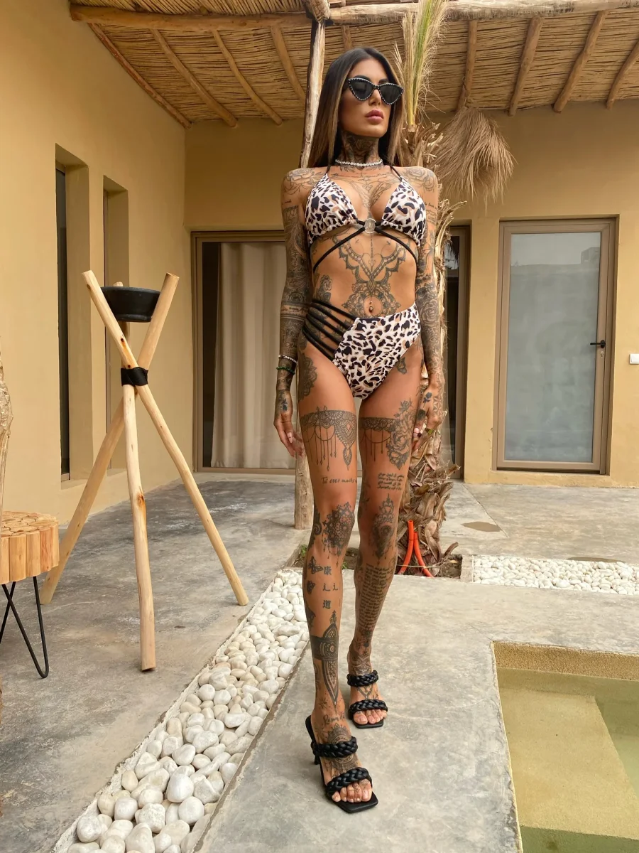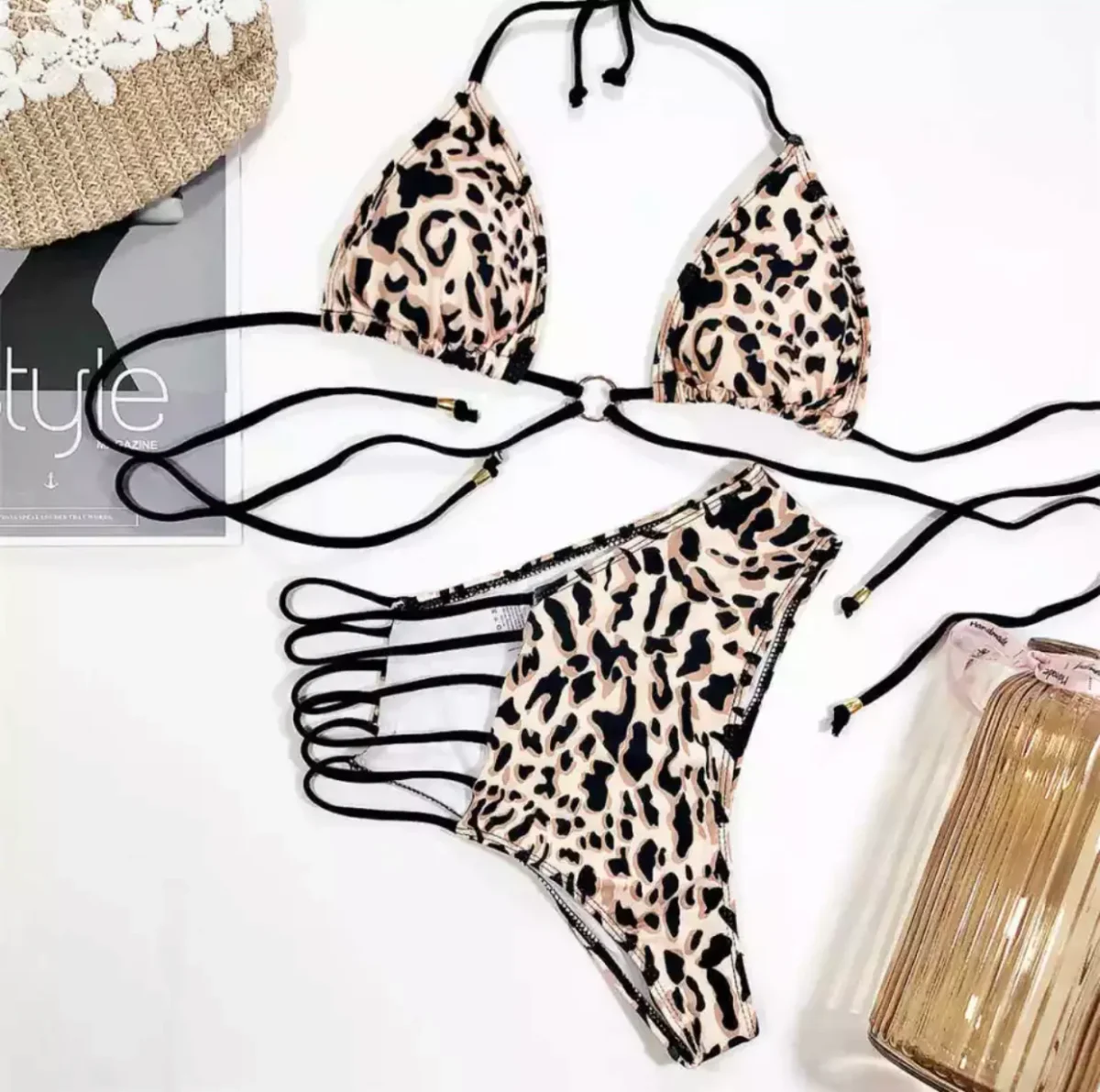 Bikini animalier verde coppe a brasiliana e aperture sulla mutanda.