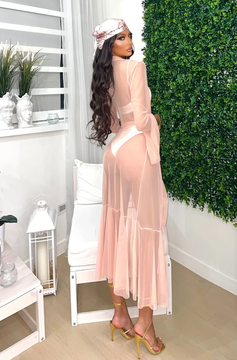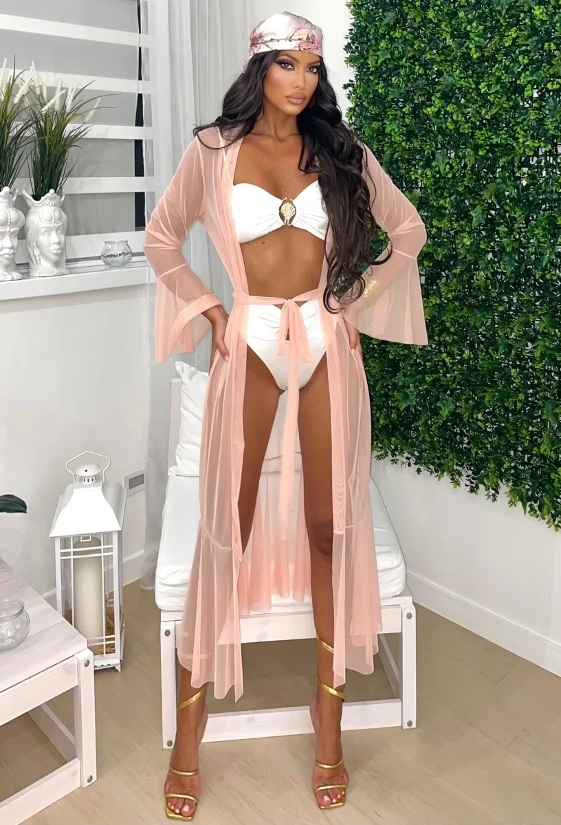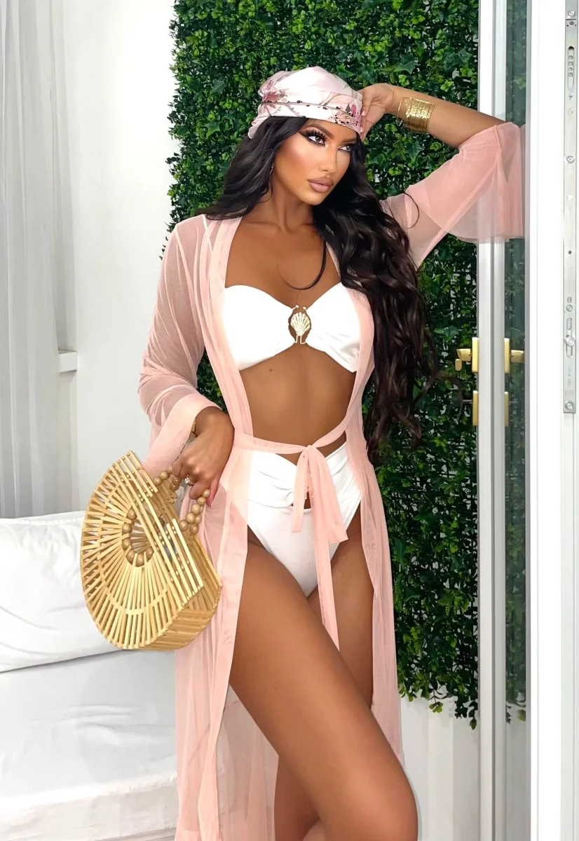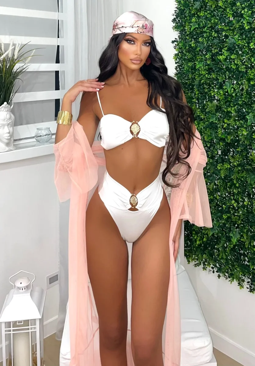 Bikini tre pezzi con pareo e mutanda leggermente sgambata.
