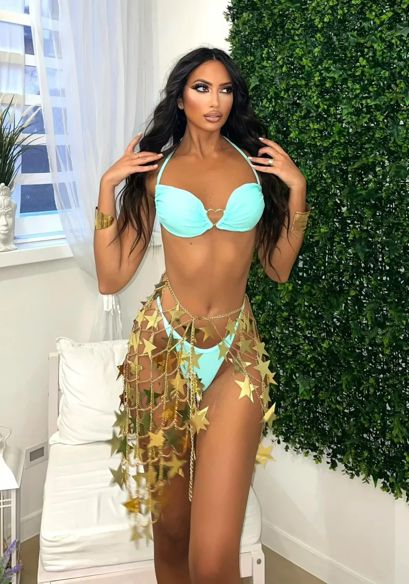 Bikini con cuore centrale, coppe e slip a perizoma.