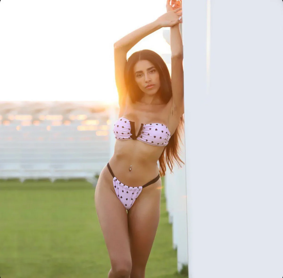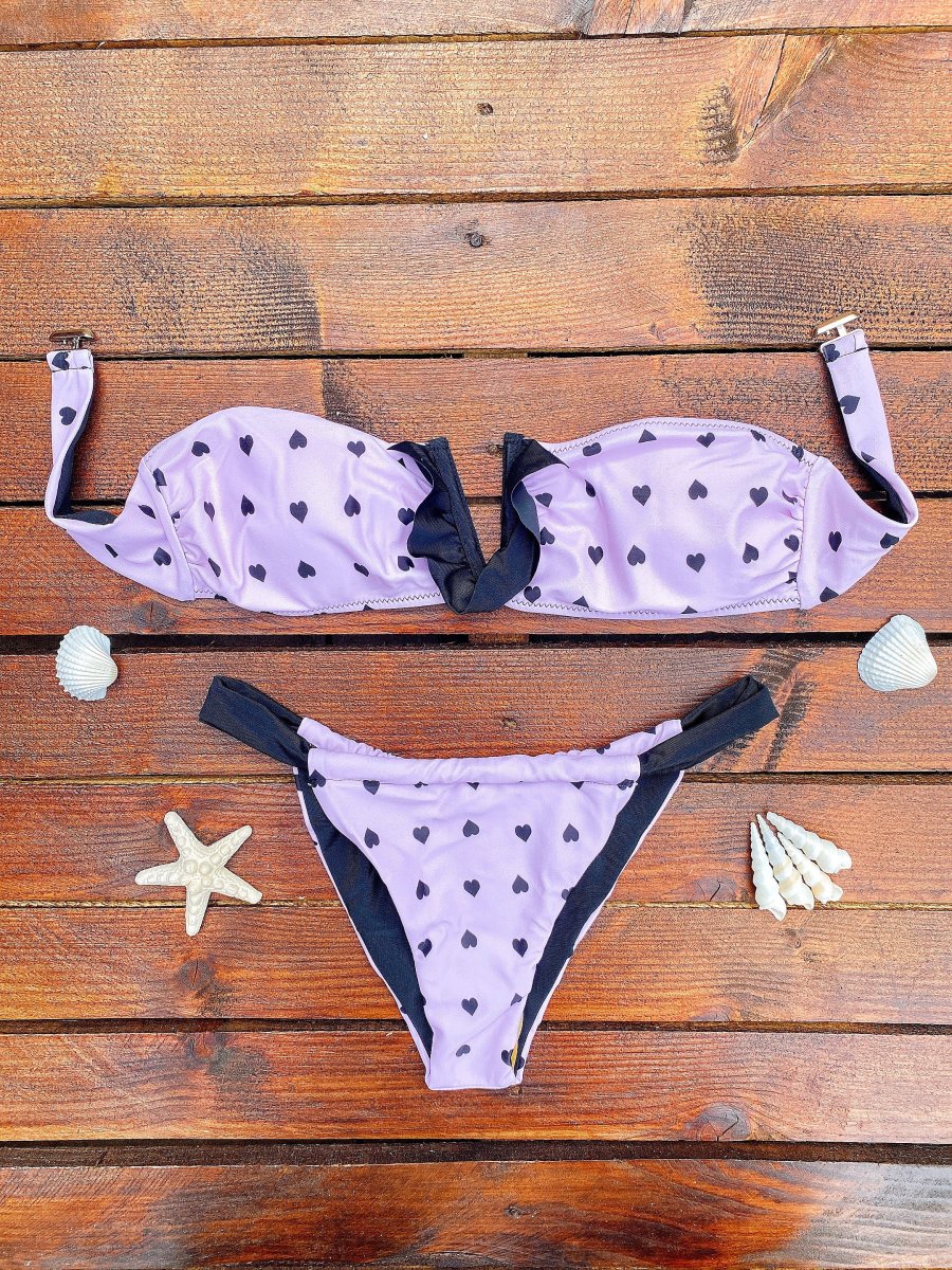 Bikini con cuoricini lilla Scollo a V, sopra a fascia e simil brasiliana. Qualità ottima vestibilità regolare.