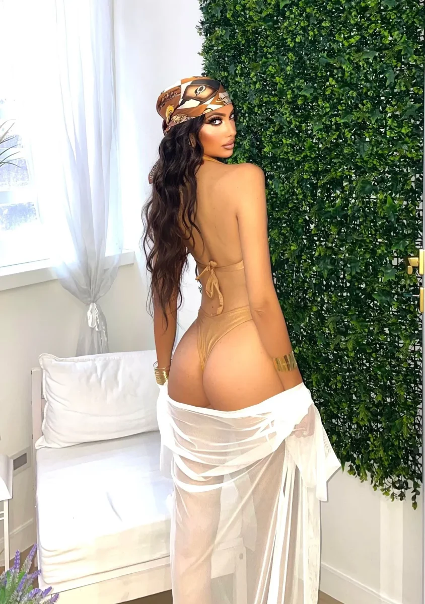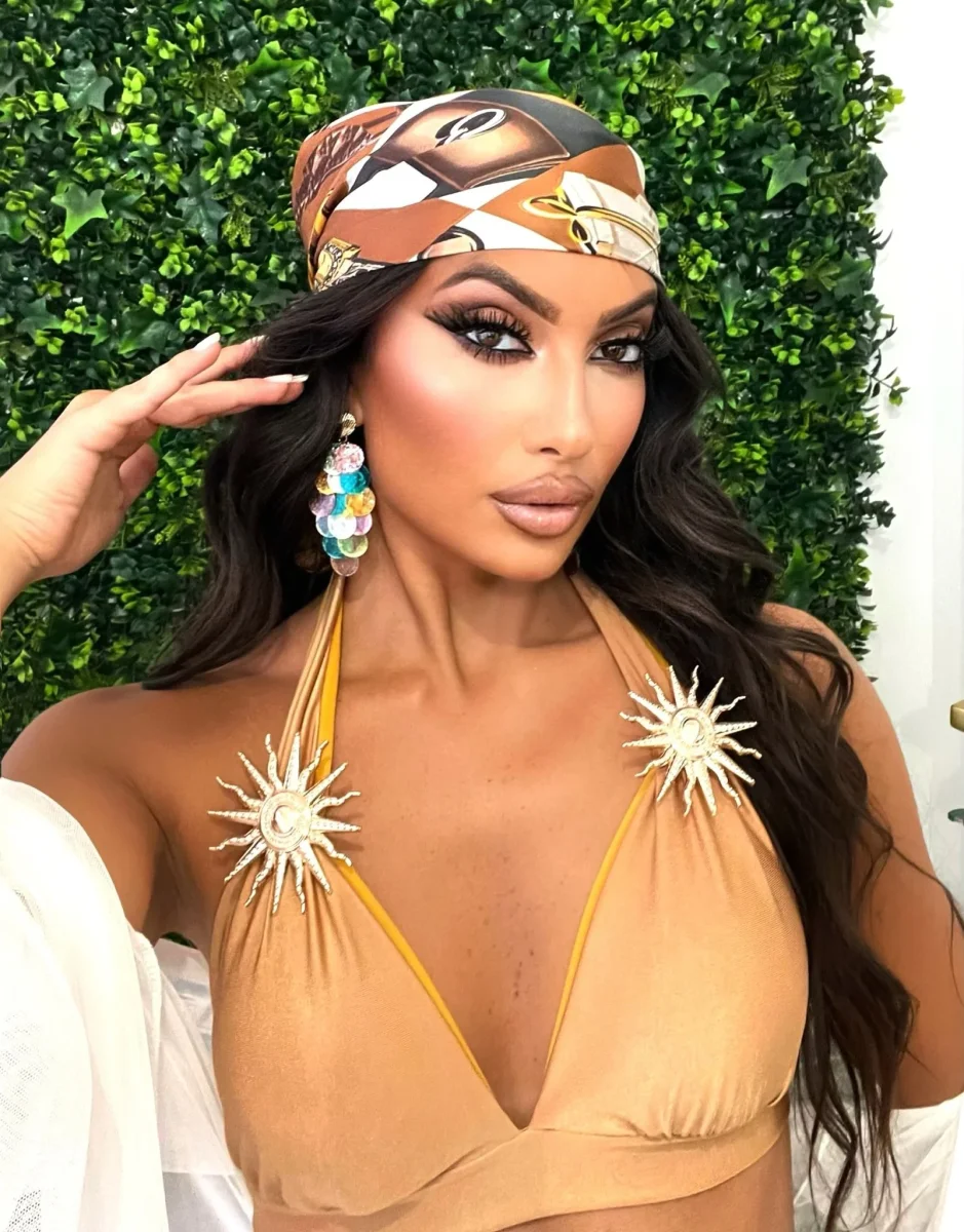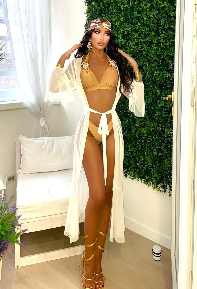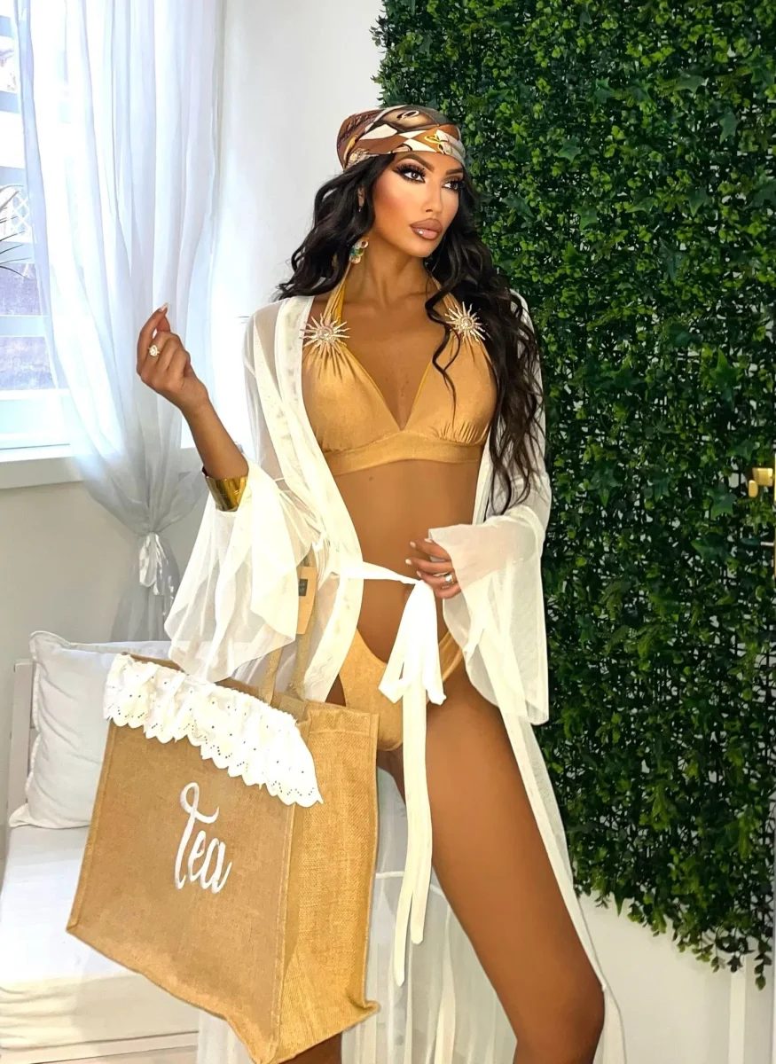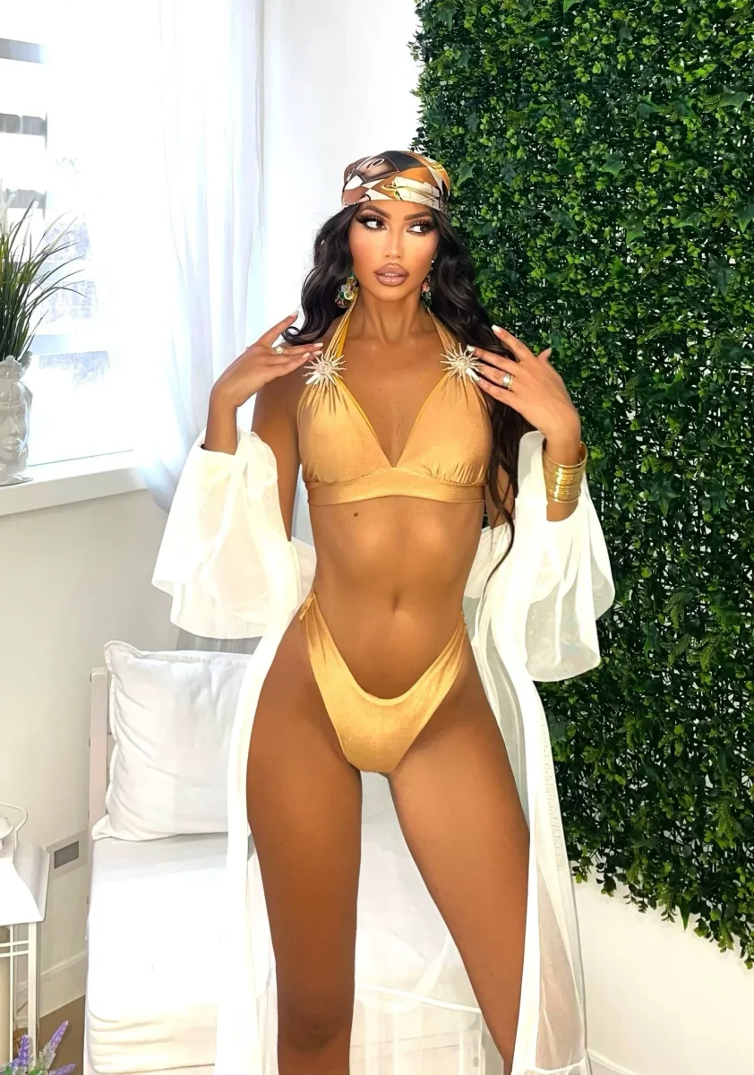 Il top a triangolo presenta applicazioni gioiello effetto soro dorata sulle spalline che lo trasformano in un vero pezzo statement, mentre lo slip a vita alta e sgambatura brasiliana esalta la silhouette in modo audace e femminile.