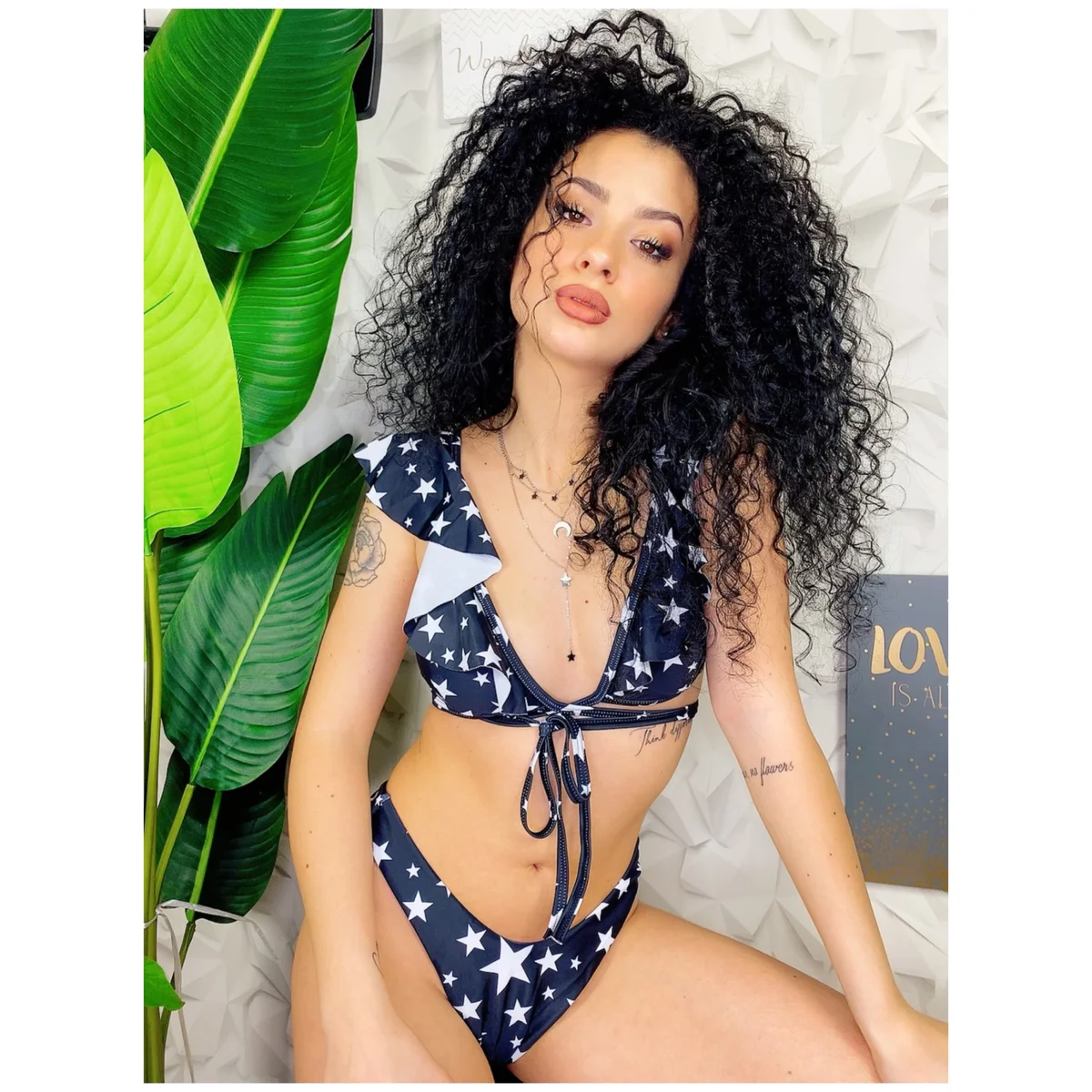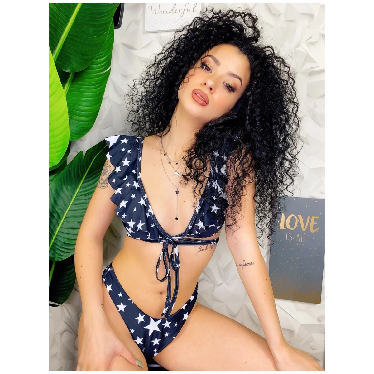 Bikini Formentera due pezzi con stelle. La parte sotto è sgambata mentre quella superiore si regola con lacci ed è presente una delicata rouge.