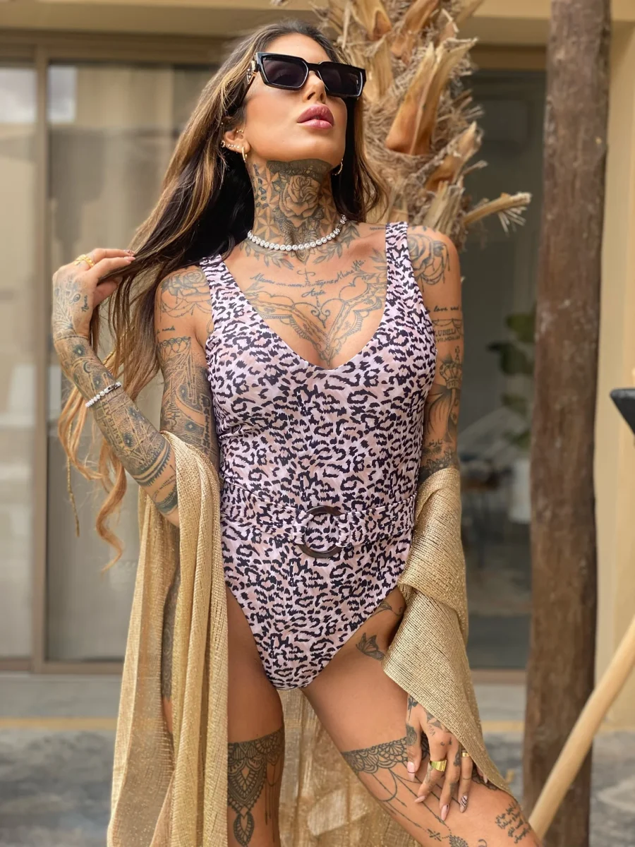 Bikini intero animalier con cintura, coppe medio/piccole, sgambato.