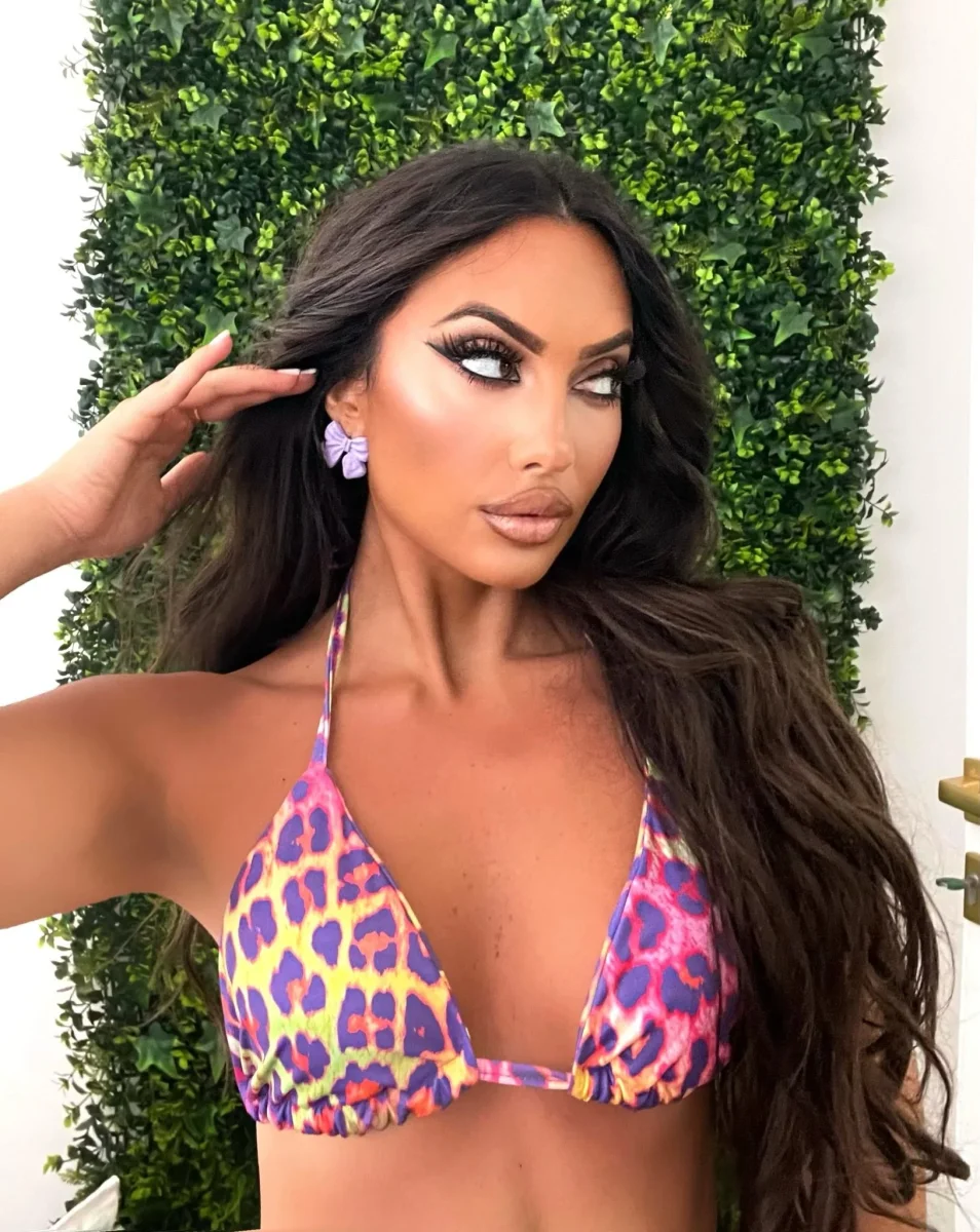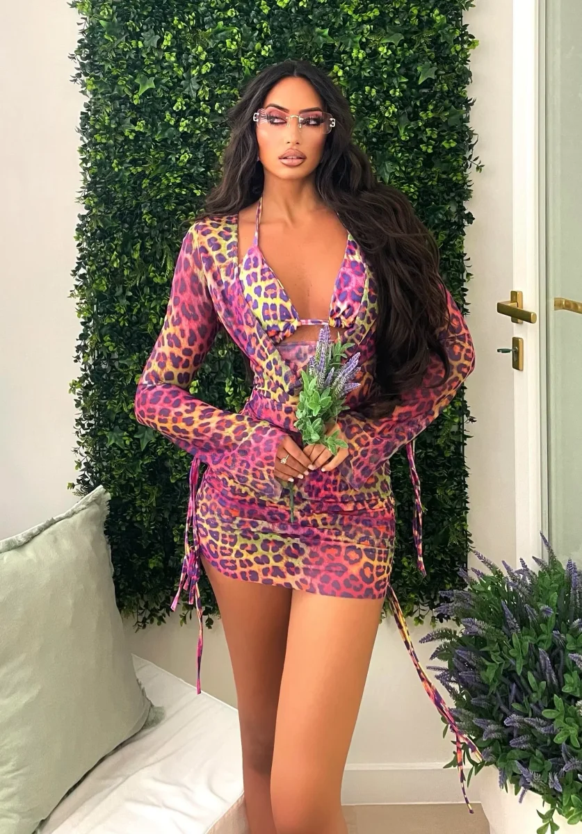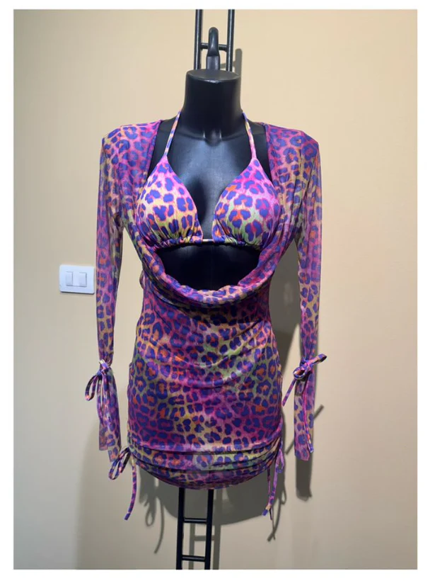 Bikini tre pezzi, top con coppe mutande sgambate e compreso abito in velo tono su tono.