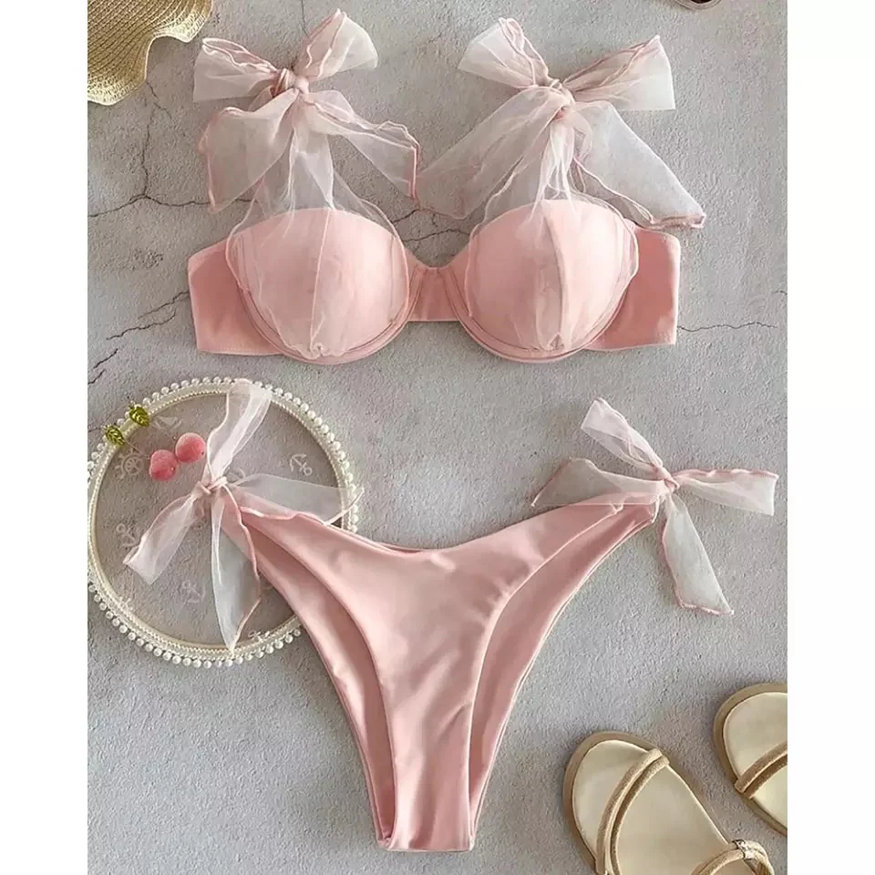 Bikini floreale con tullE, sotto regolabile con fiocco sopra con coppe e ferretto, ottima vestibilità.