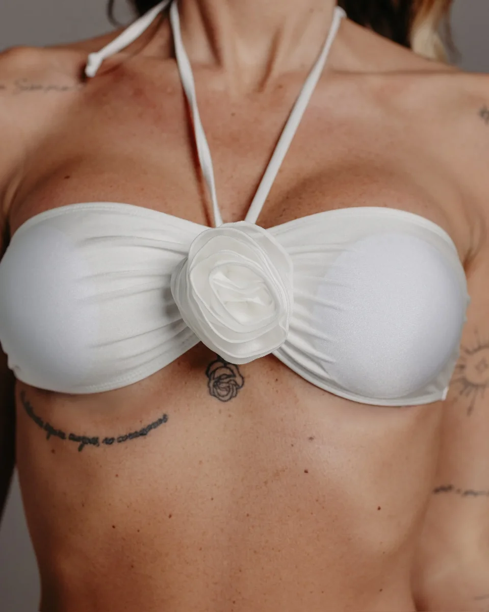 Bikini tre prezzi composto da fascia con coppe e rose slip e gonna pareo abbinata