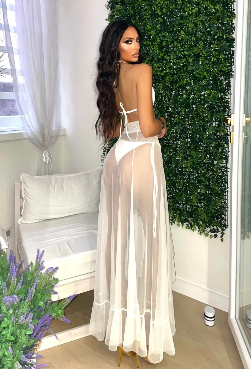 Bikini tre pezzi, top con coppe e gonna in velo, dietro sgambato