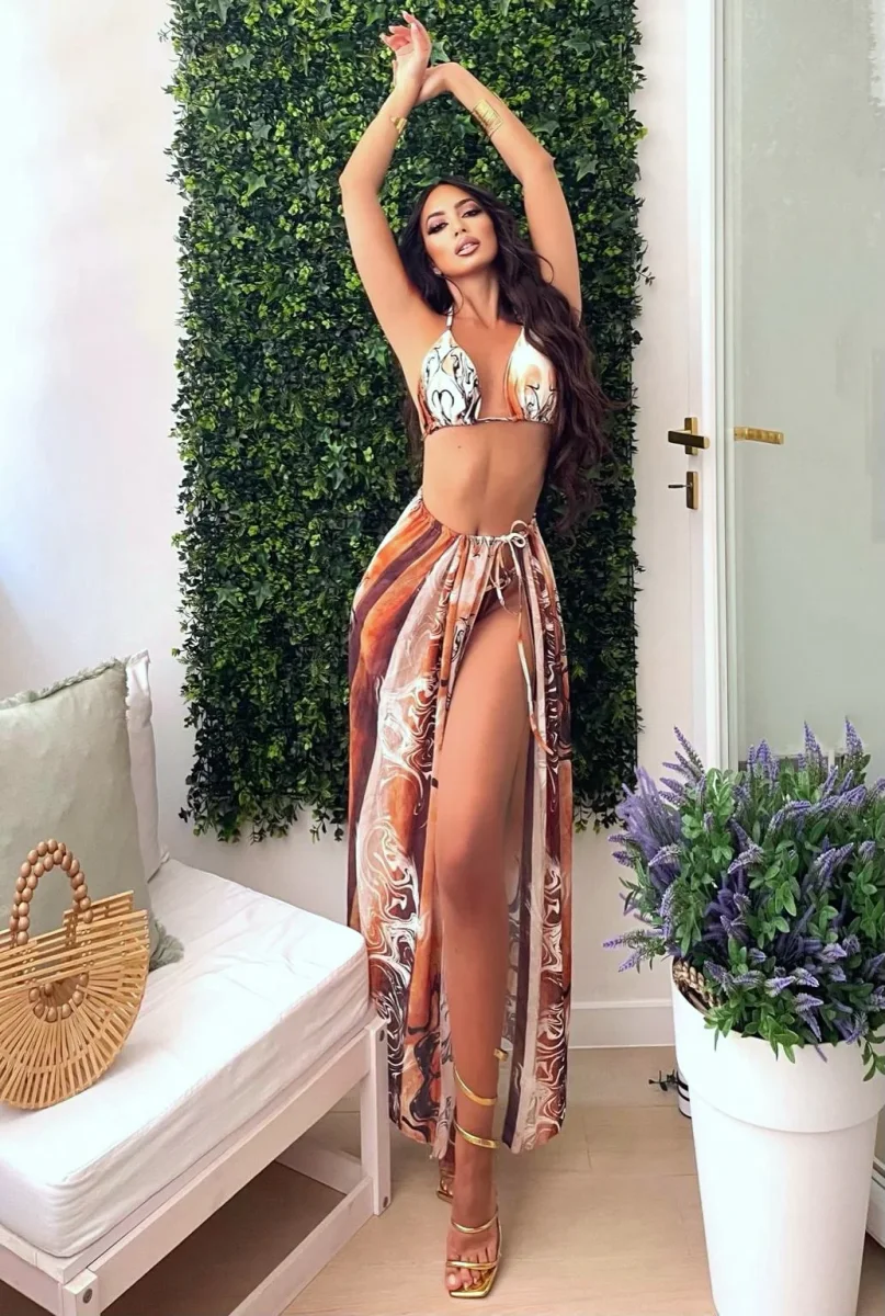 Bikini tre pezzi, top con coppe e gonna in velo, dietro molto sgambato.