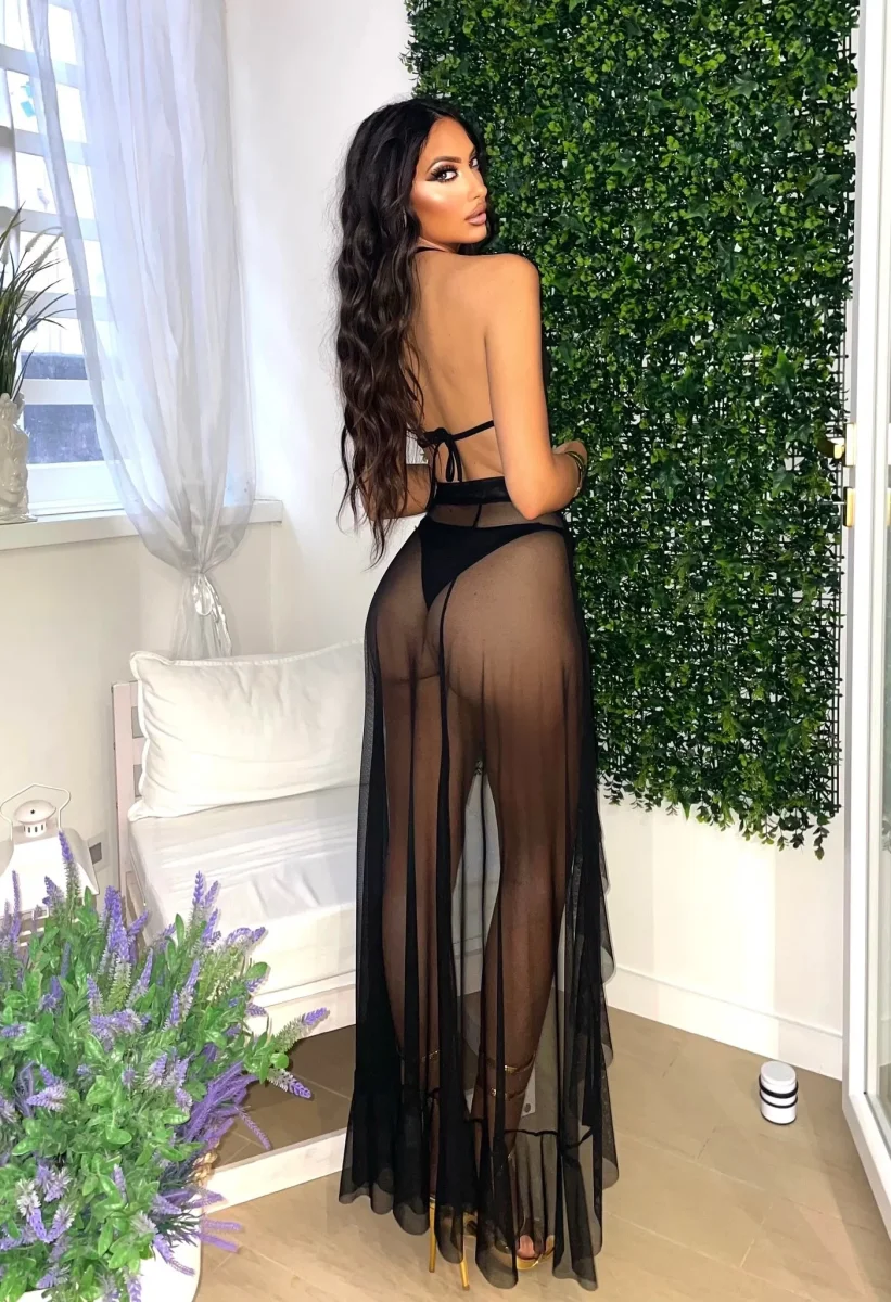Bikini tre pezzi, top con coppe e gonna in velo, dietro molto sgambato