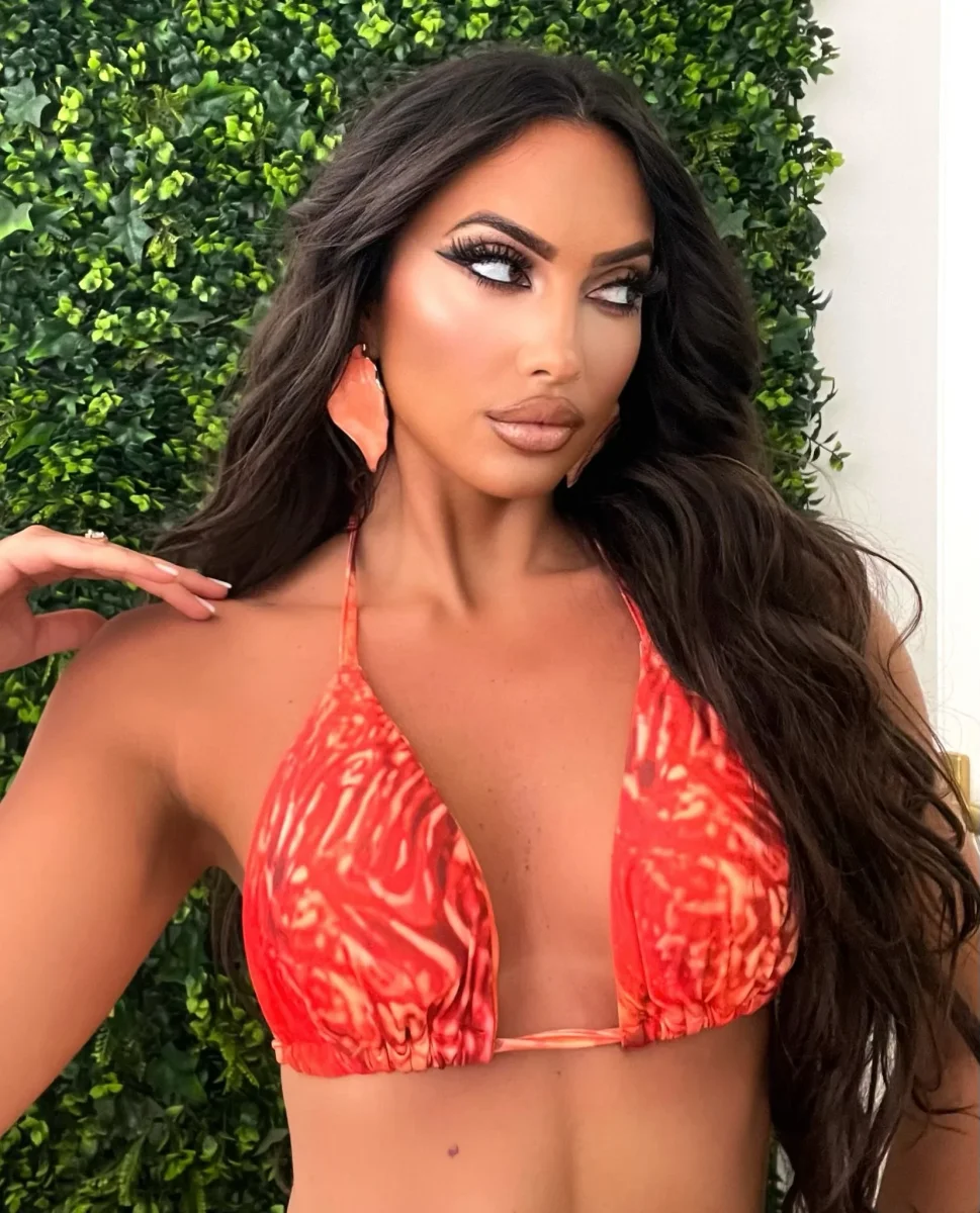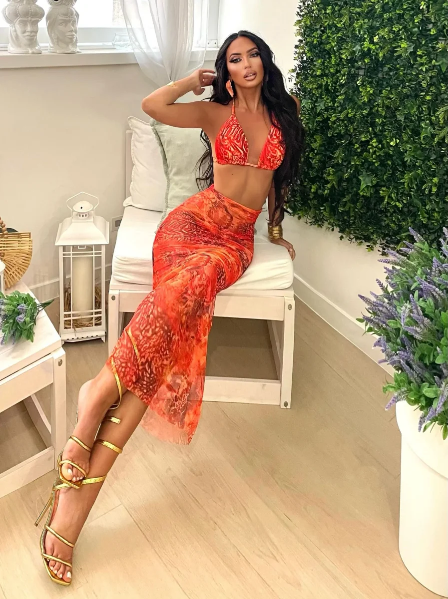 Bikini tre pezzi, top senza coppe , gonna in velo e mutande regolabili.