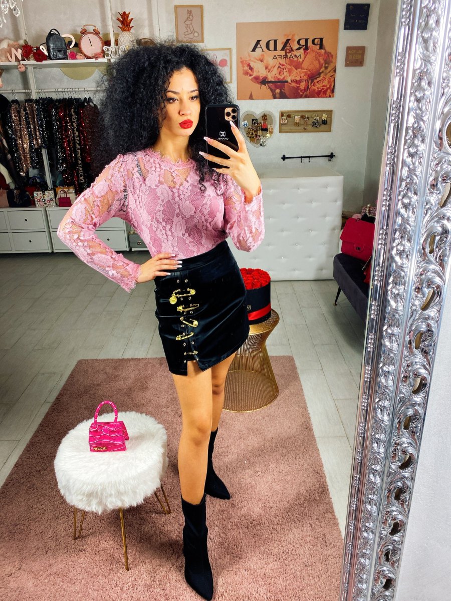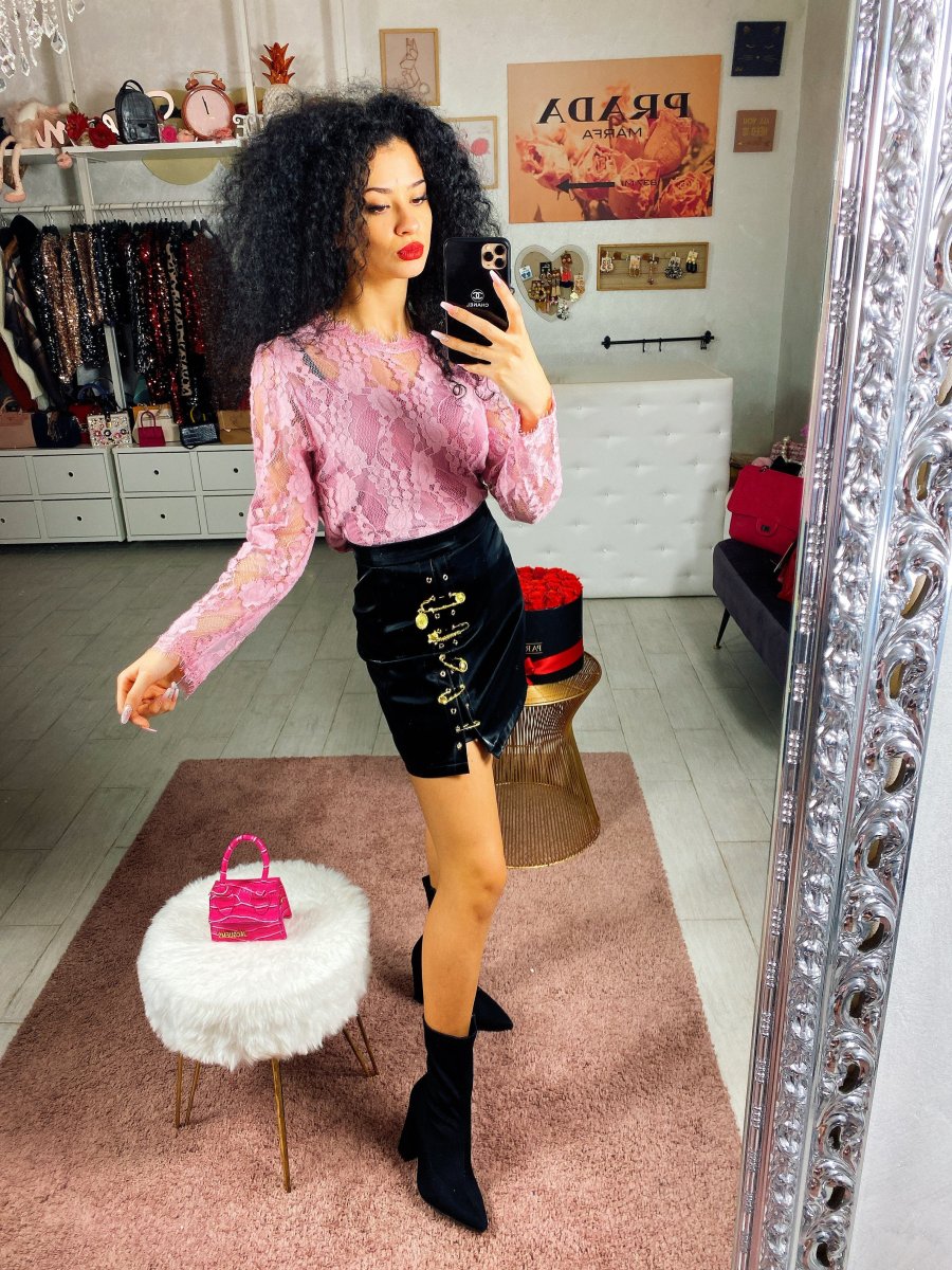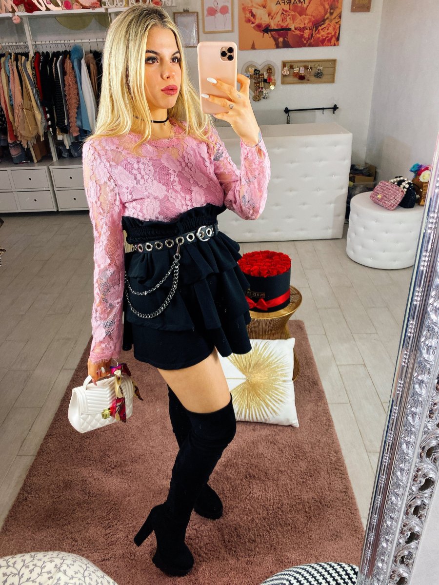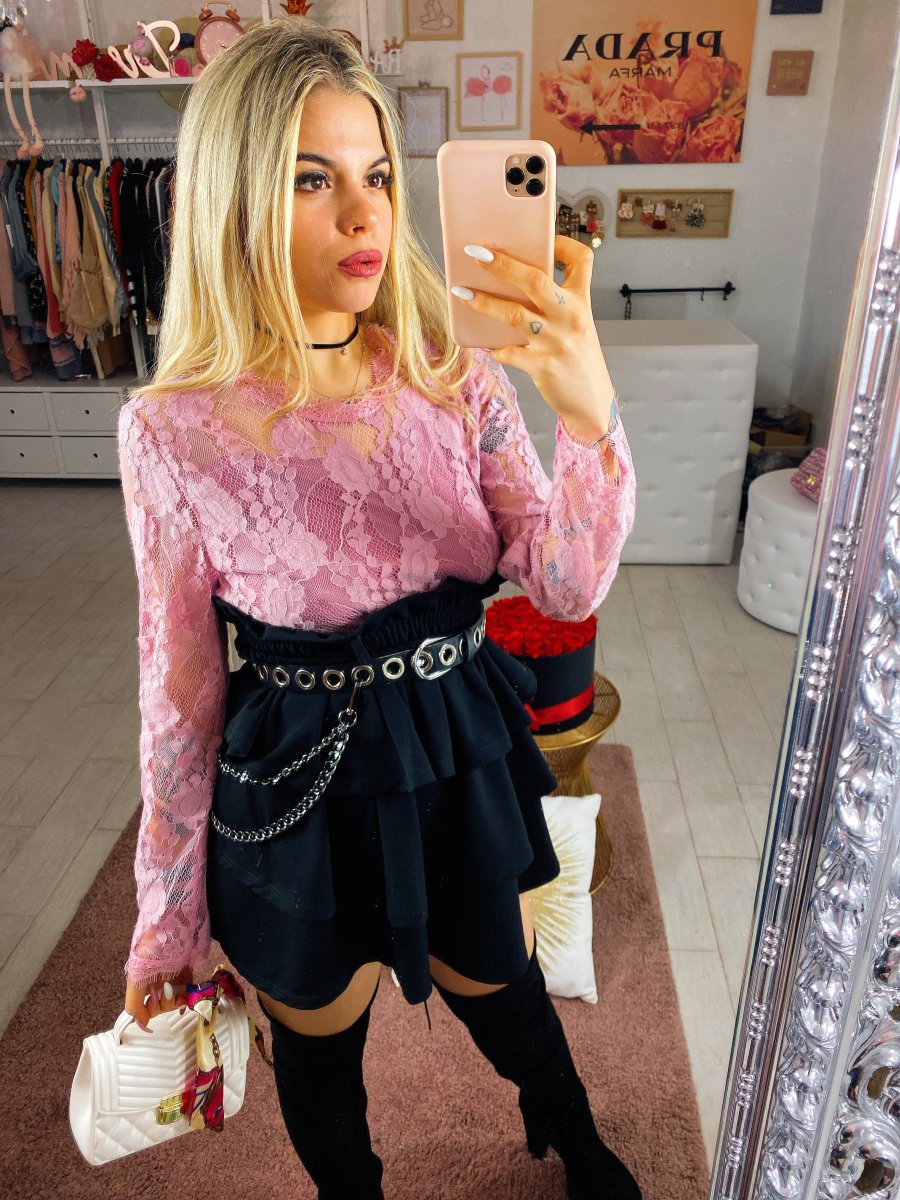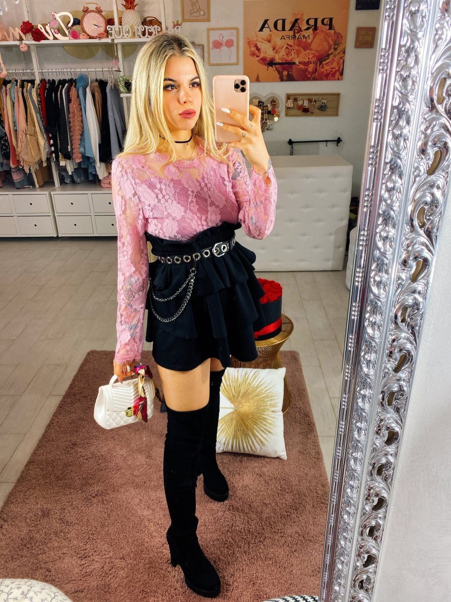 Blusa in pizzo con fodera interna. Chiusura con zip nel dietro.