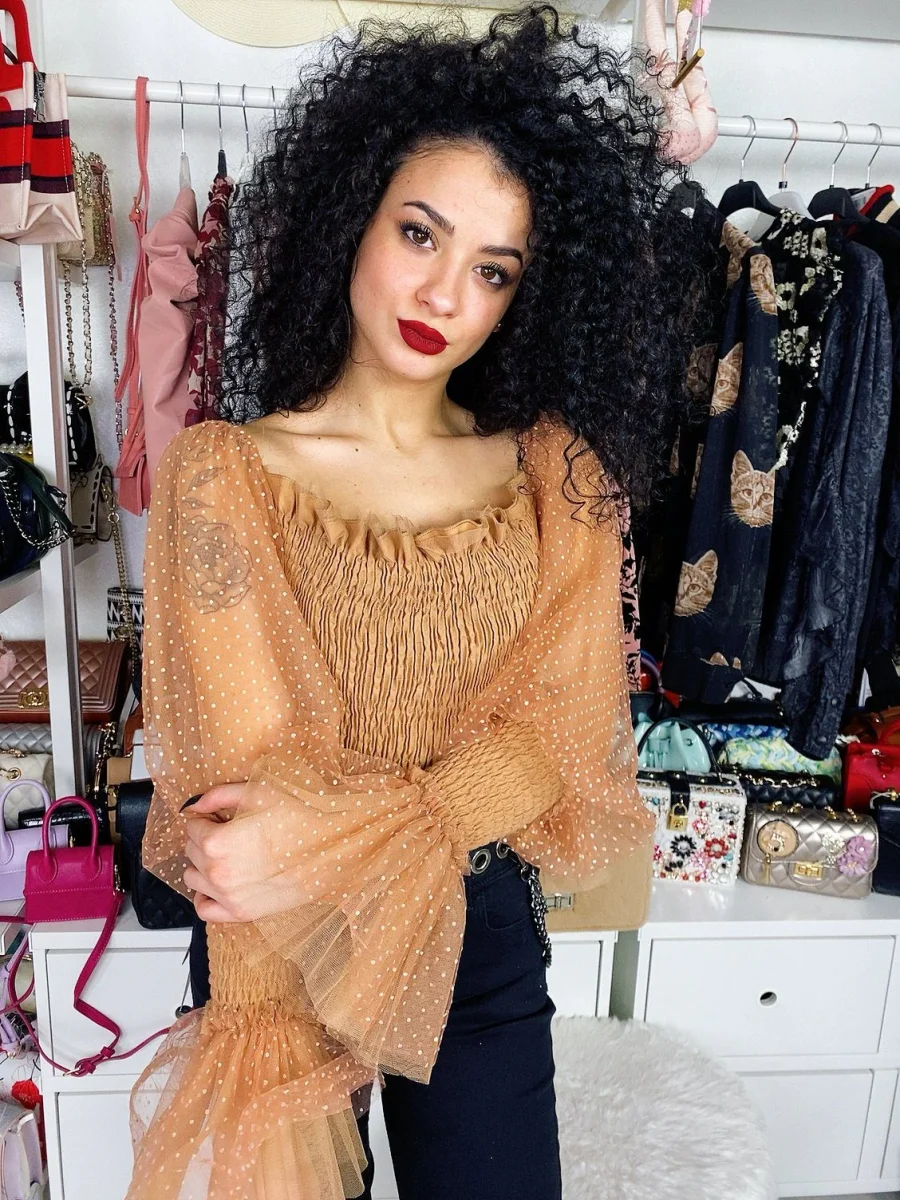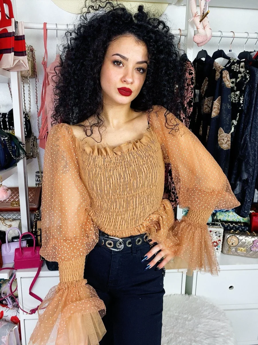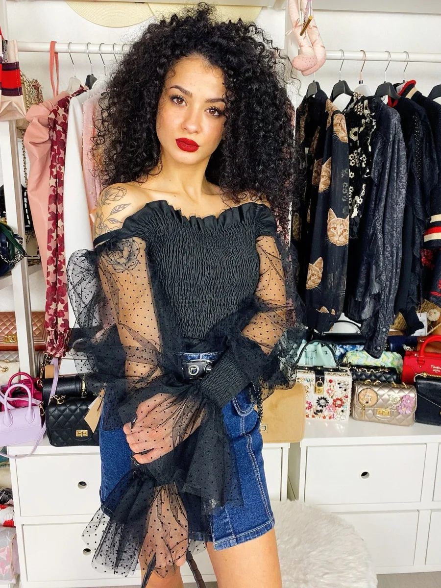 Blusa in tessuto elasticizzato a maniche lunghe velate in tulle.