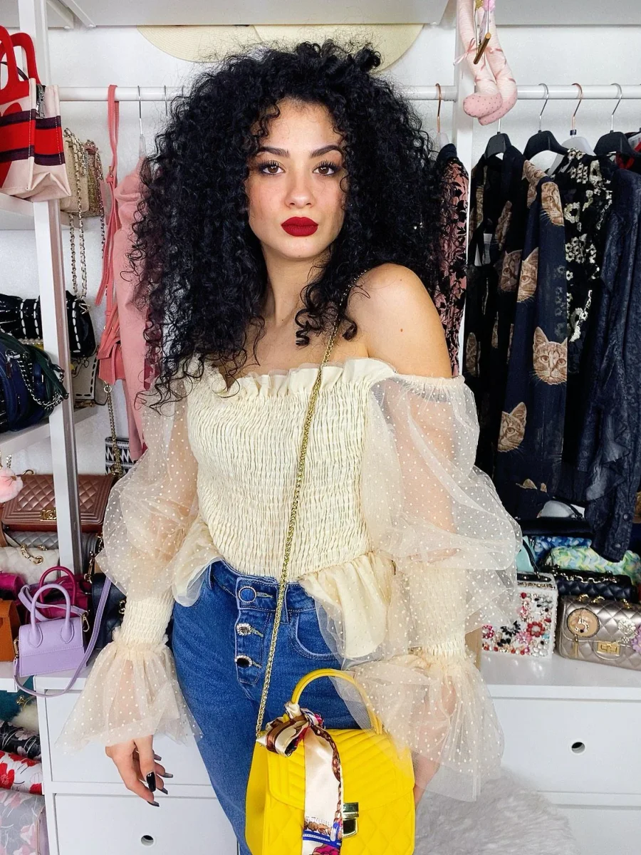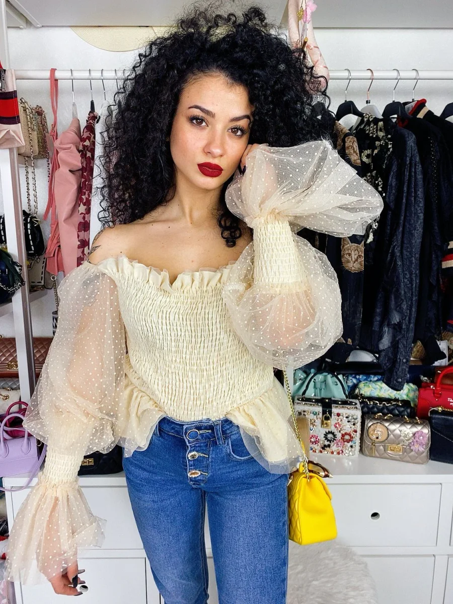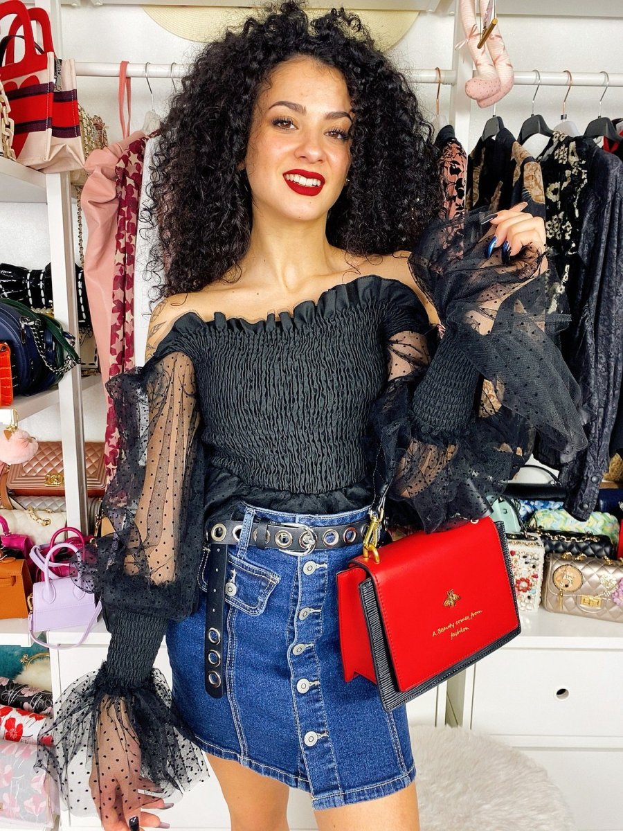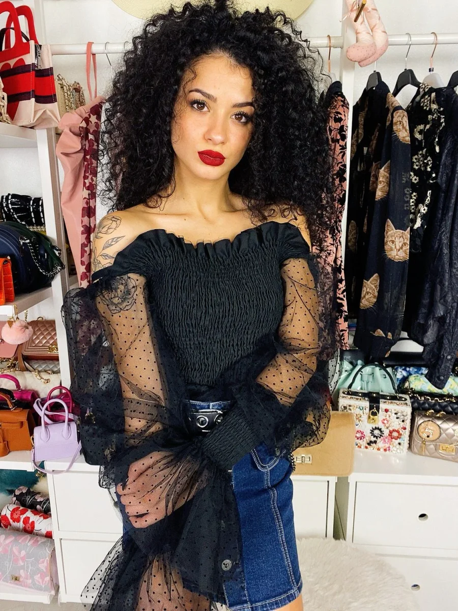 Blusa in tessuto elasticizzato a maniche lunghe velate in tulle.