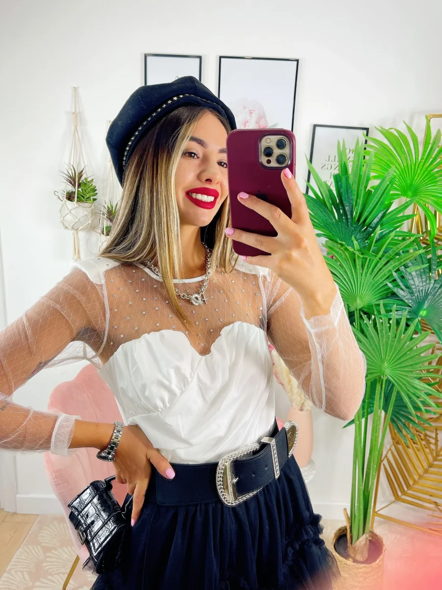 Body con retina e brillantini molto delicato in tessuto elasticizzato senza coppe.