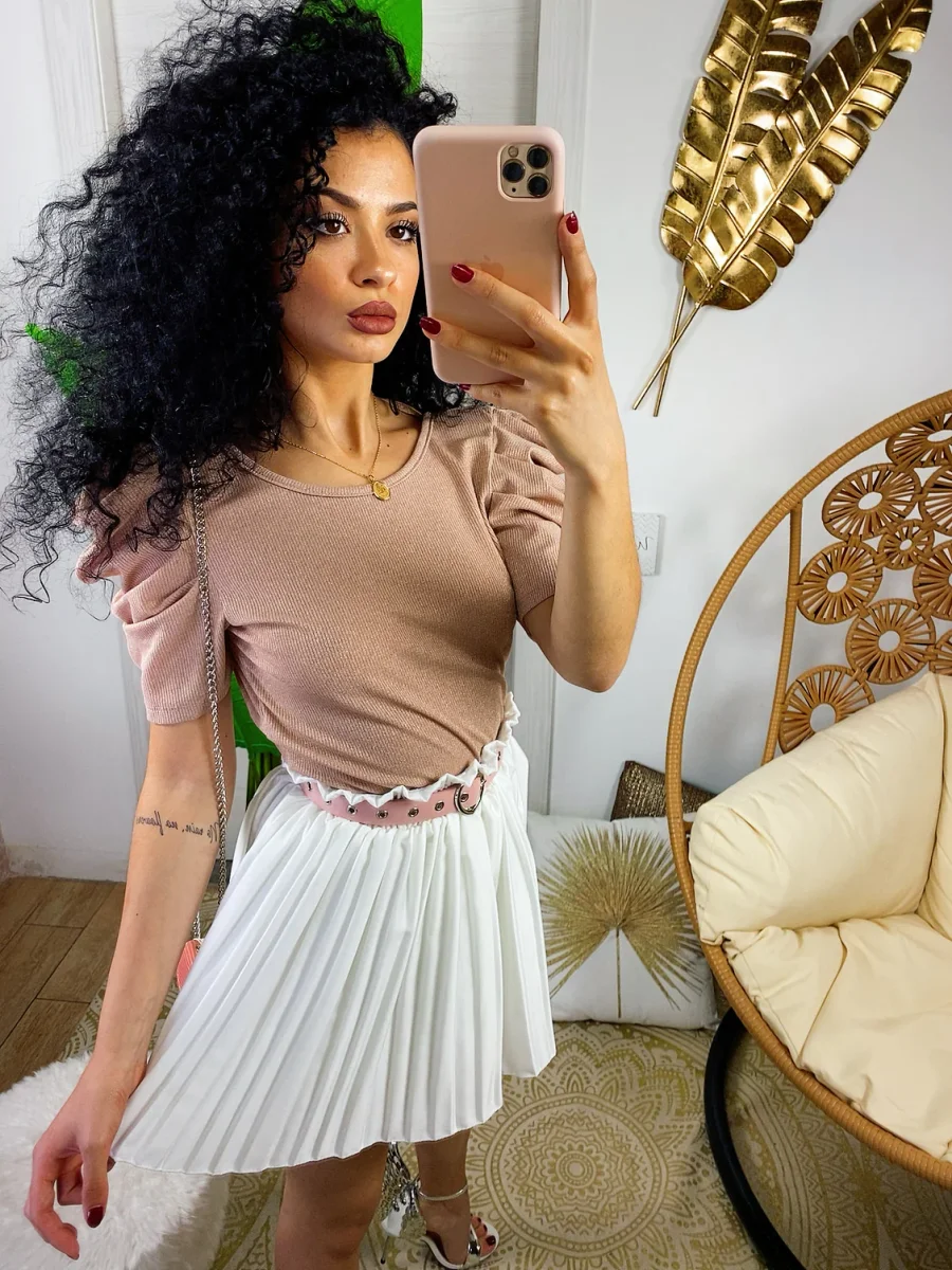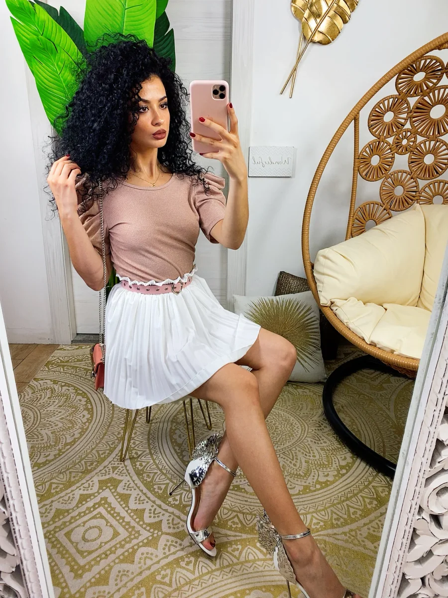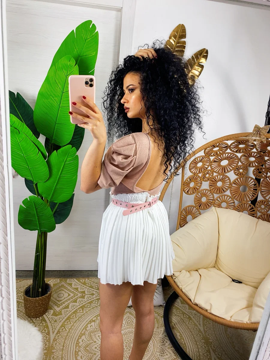 Body in cotone elasticizzato a costine con trama glitterato. Manica corta a sbuffo e schiena completamente aperta. Taglia unica elasticizzato.