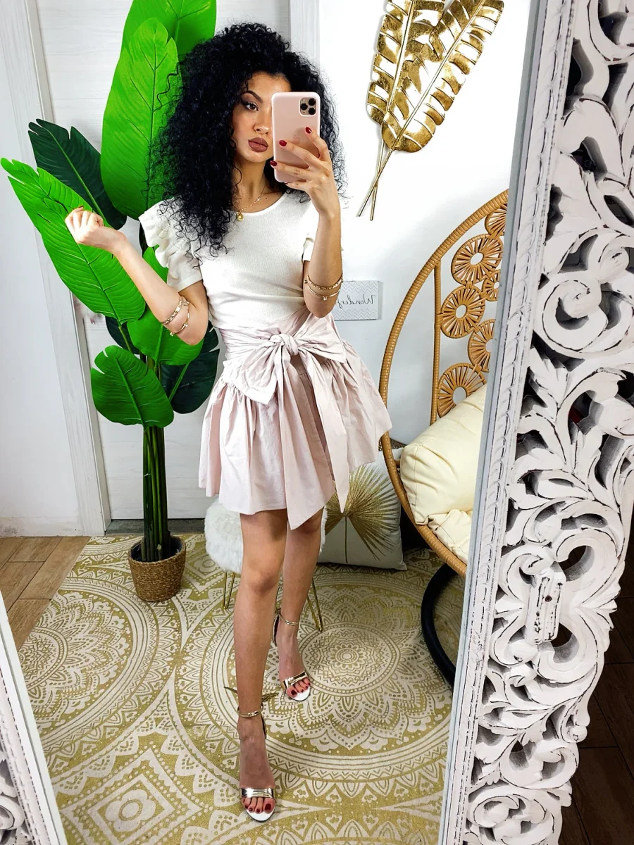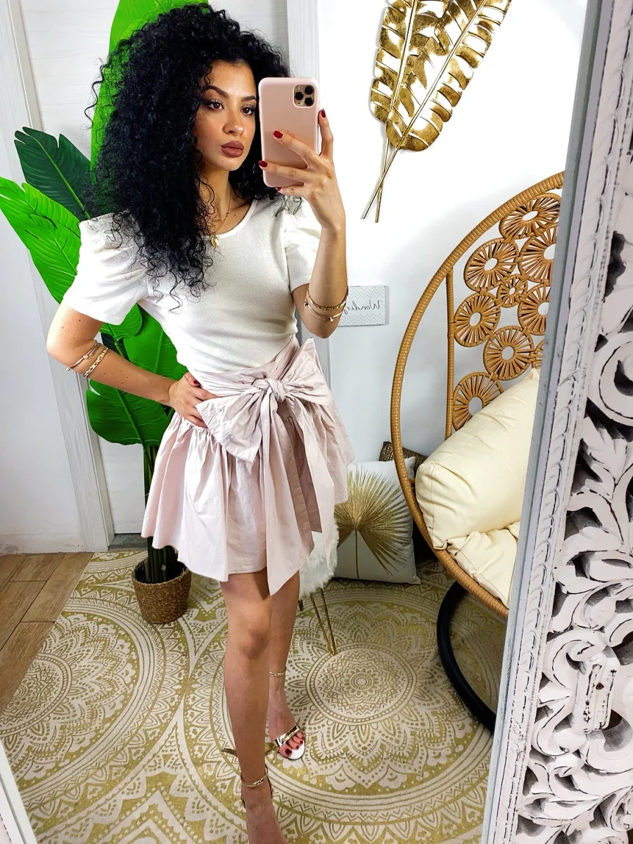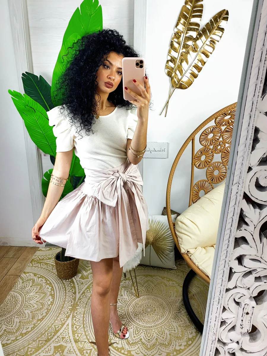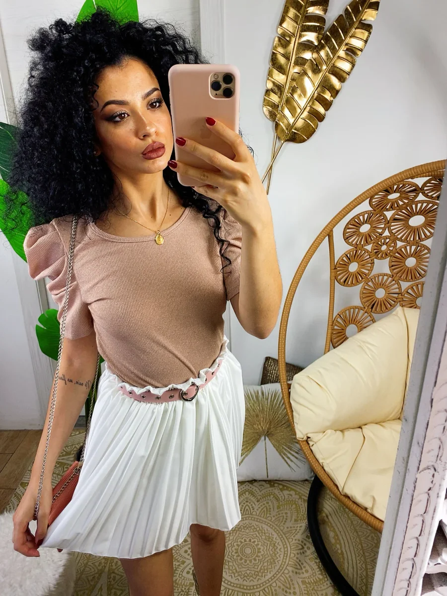 Body in cotone elasticizzato a costine con trama glitterato. Manica corta a sbuffo e schiena completamente aperta. Taglia unica elasticizzato.