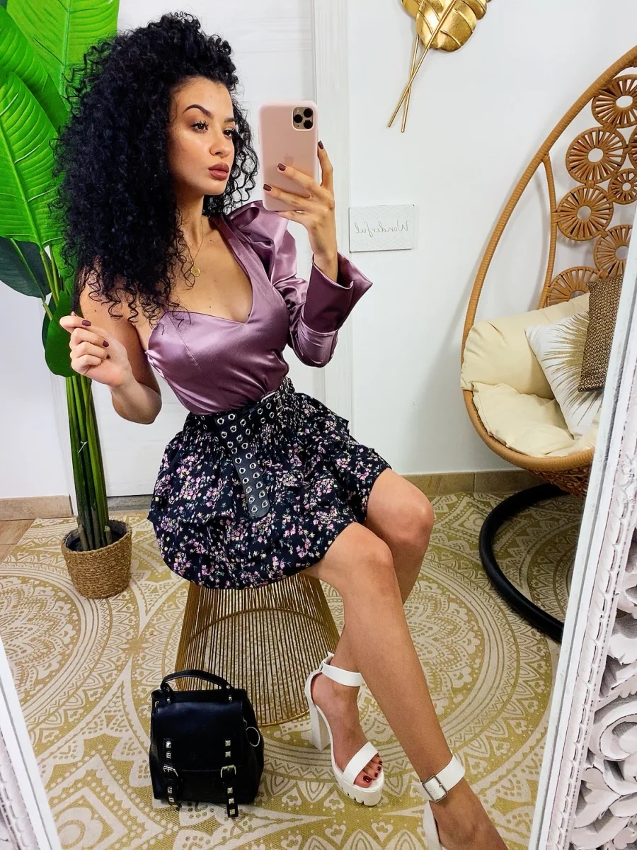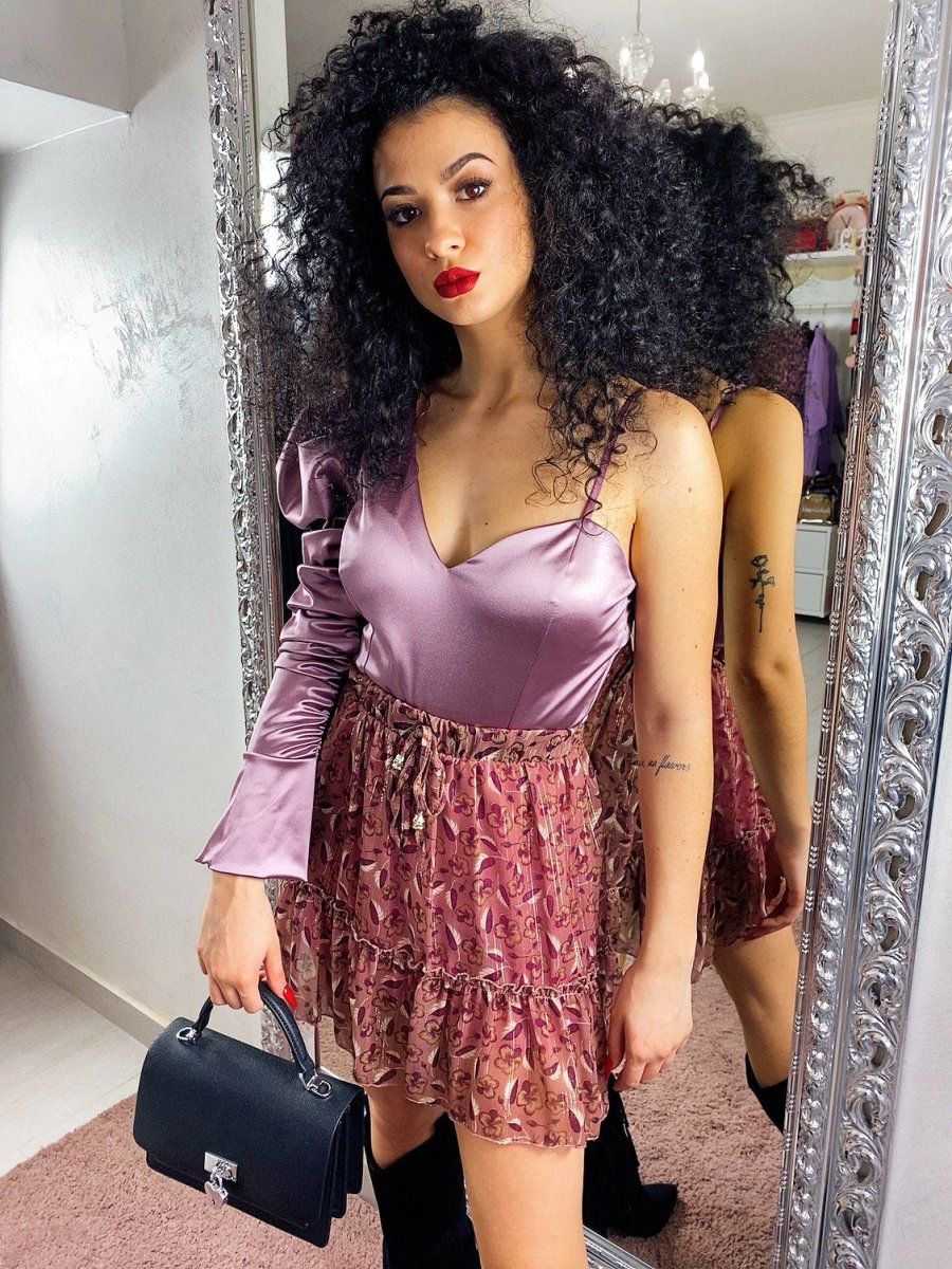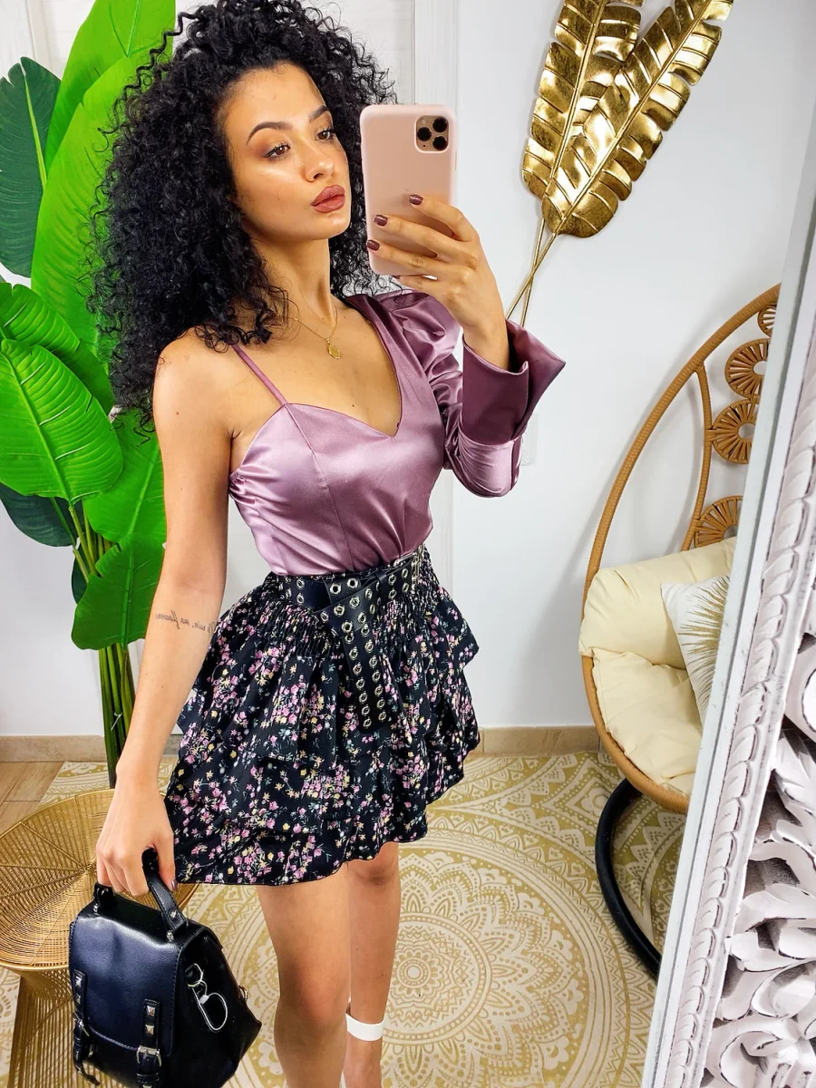 Body in raso dalla vestibilità molto piccola. Monomanica arricciata e coppe integrate.