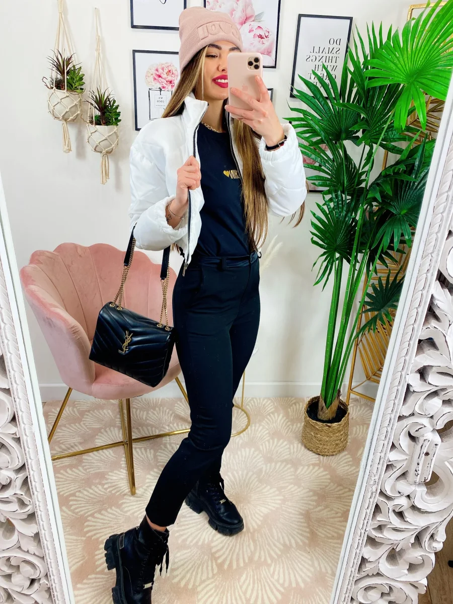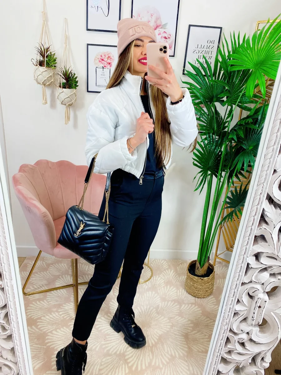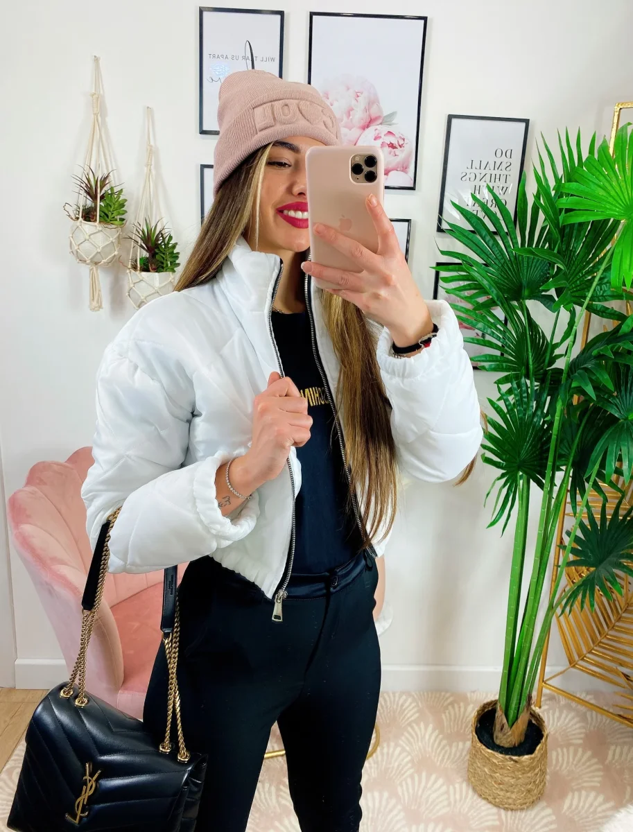 Bomber crop Bianco a rombi primaverile, elastico sotto chiusura con zip.